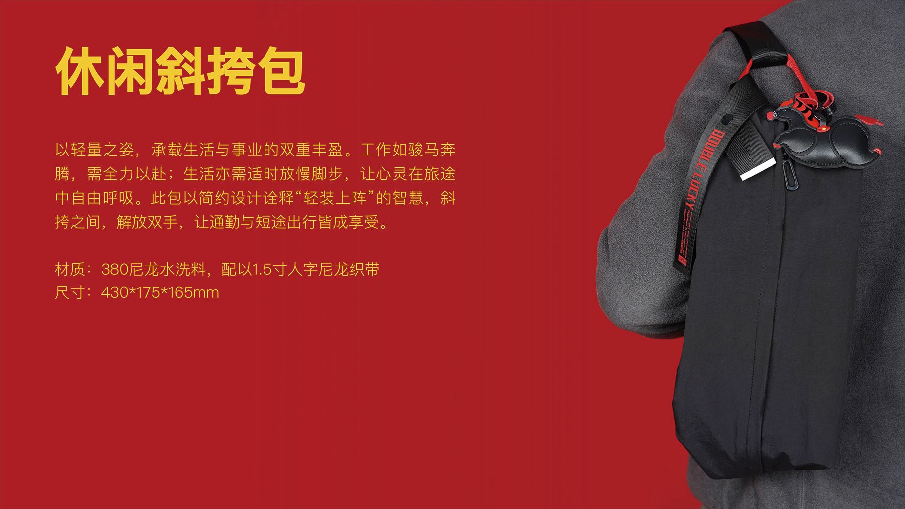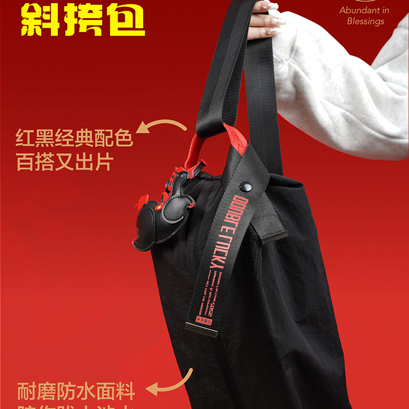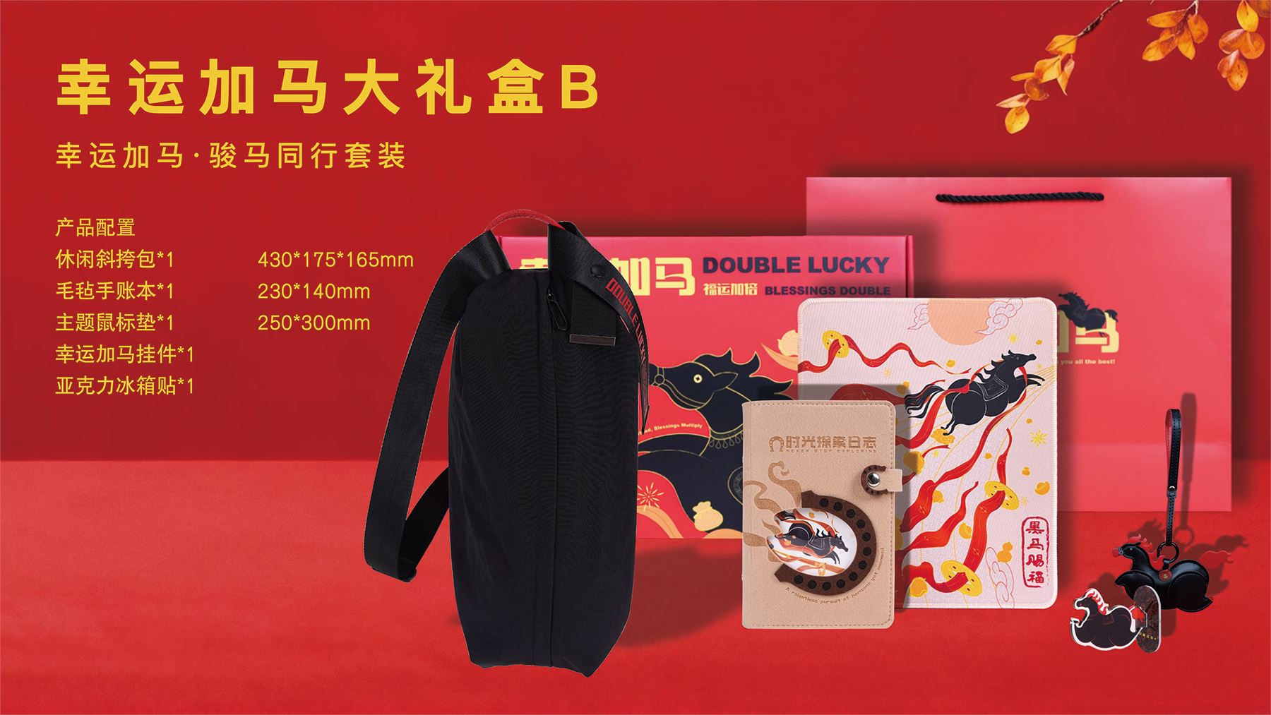 休闲斜挎包*1 430*175*165mm 毛毡手账本*1 230*140mm 主题鼠标垫*1 250*300mm 幸运加马挂件*1 亚克力冰箱贴*1