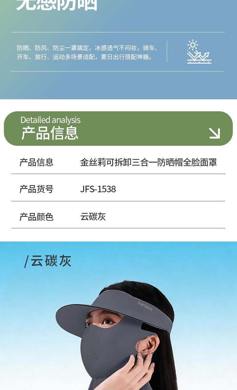 货 号: JFS-1538 颜 色: 云碳灰 尺 寸: 均码 产品卖点: 1.集防晒帽、护脸面罩、护颈披肩于一体,可自由拆卸组合,满足不同场景防晒需求。 2.全脸方位防护,防晒无死角,从头顶、脸颊、口鼻到后颈全面包裹,有效遮挡阳光,户外出行不怕晒黑晒伤。 3.可拆可折叠,便携易收纳,面罩可单独拆卸,帽身轻盈可折叠,出门放包不占空间,通勤、旅游都方便。