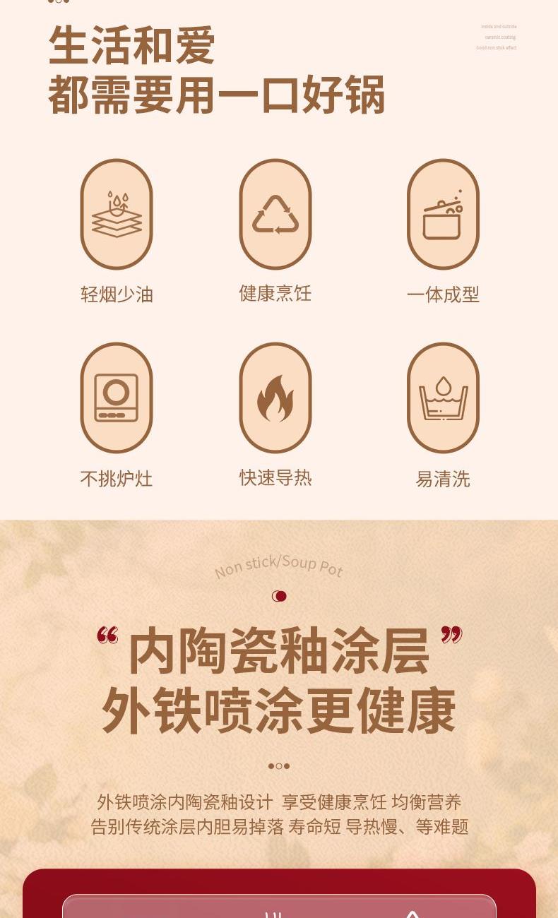 产品参数: 材质:食物接触用精铁 产品规格:汤锅24cm 彩盒尺寸:34.5*27*15 外箱尺寸:62*35.5*57 净重/毛重:1.9kg\2.2kg 产品卖点: 1.材质铁喷涂 2.不粘效果好,焖煮,煲汤 3.双重炽炼不生锈