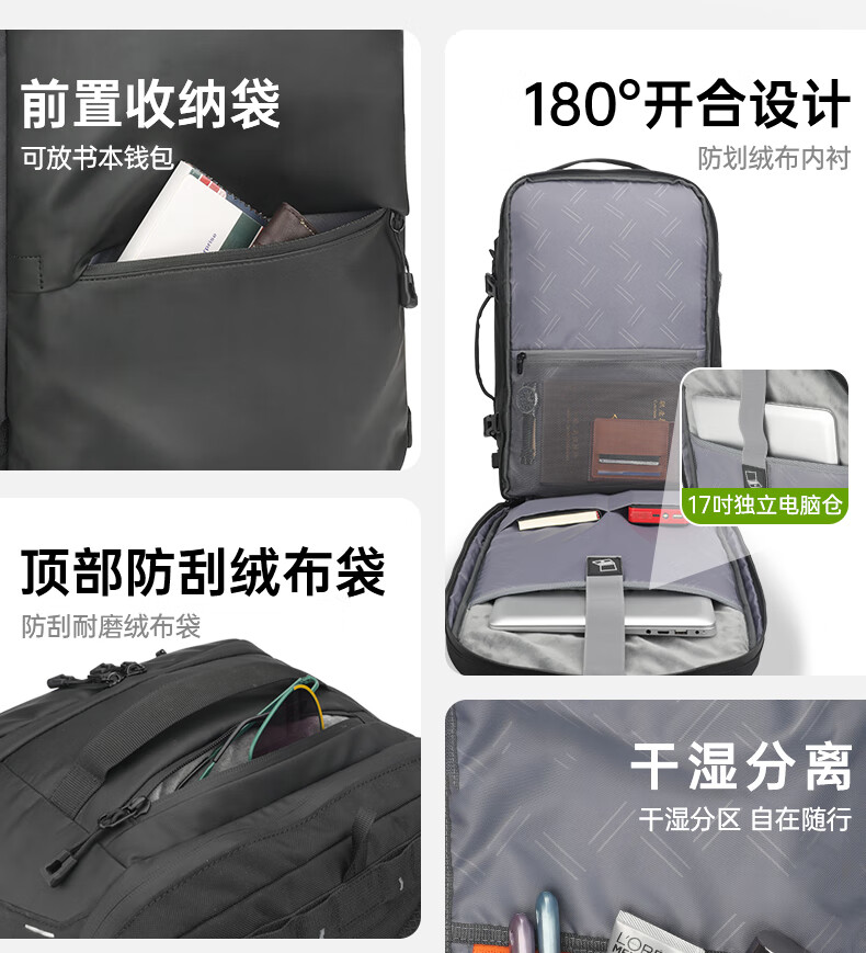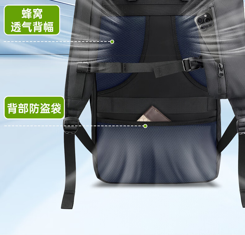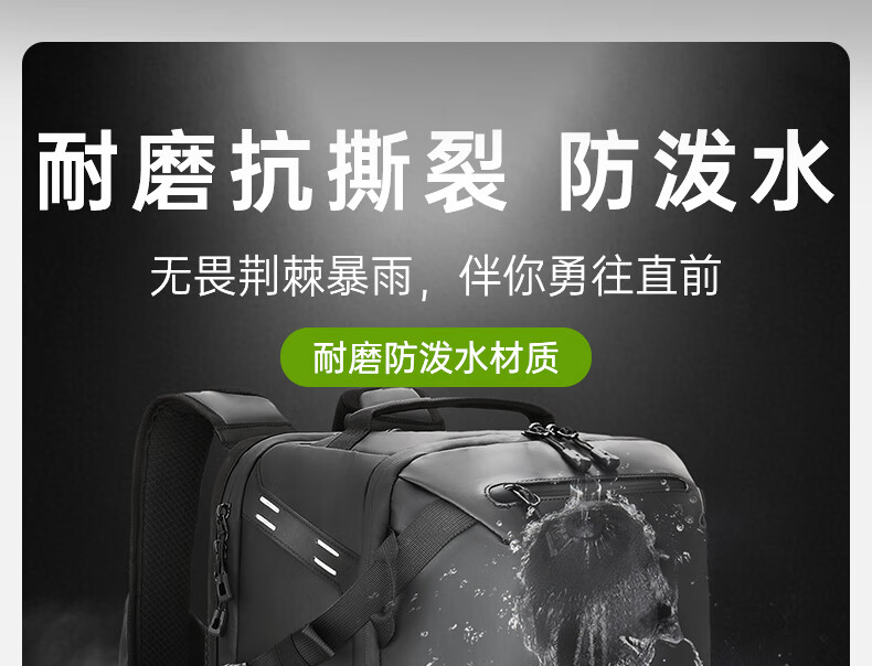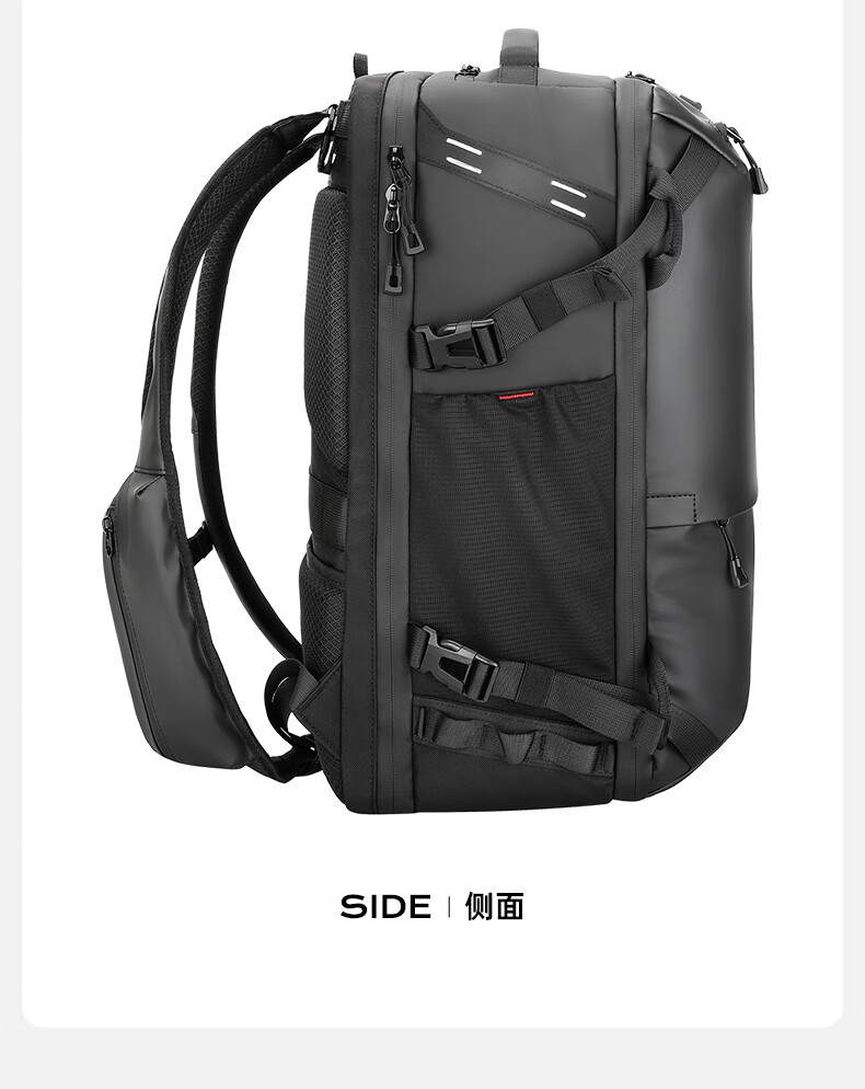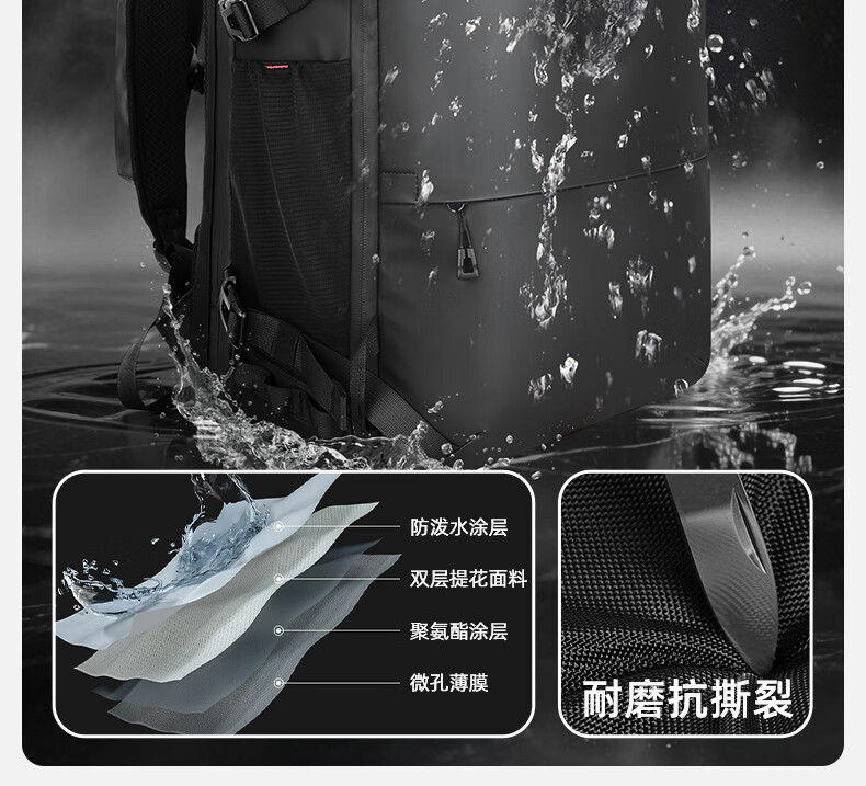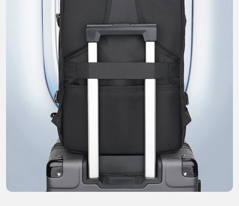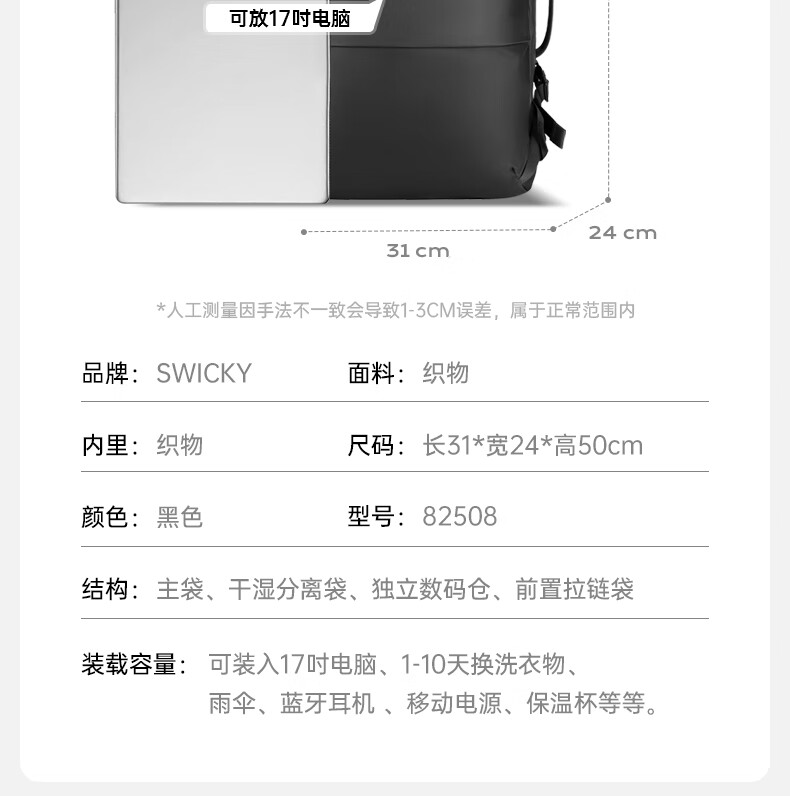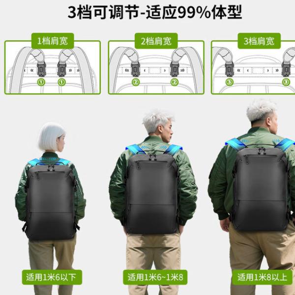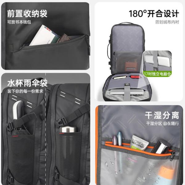 型号:82508京东自营款 尺寸: 31 x 24 x51cm 重量:1.1KG 材质: 涤纶织物 1.多功能商务款,百变随行,2025年京东自营新款. 2.内置17寸电脑隔层,干湿分离收纳仓,文具收纳组,大容量衣物主袋,两侧水杯雨伞袋,背部防盗袋,顶部防划伤绒布袋 3.采用双层提花面料+防水层,经久耐用。 4.外层采用防水拉链,防水,更提升整包品质 。 5.加厚背板,加宽加厚肩带设计,增加受力面积,背负更舒适. 6.肩带上部三档位置调节,下部织带随意调节,带肩带固定扣.肩带隐藏式