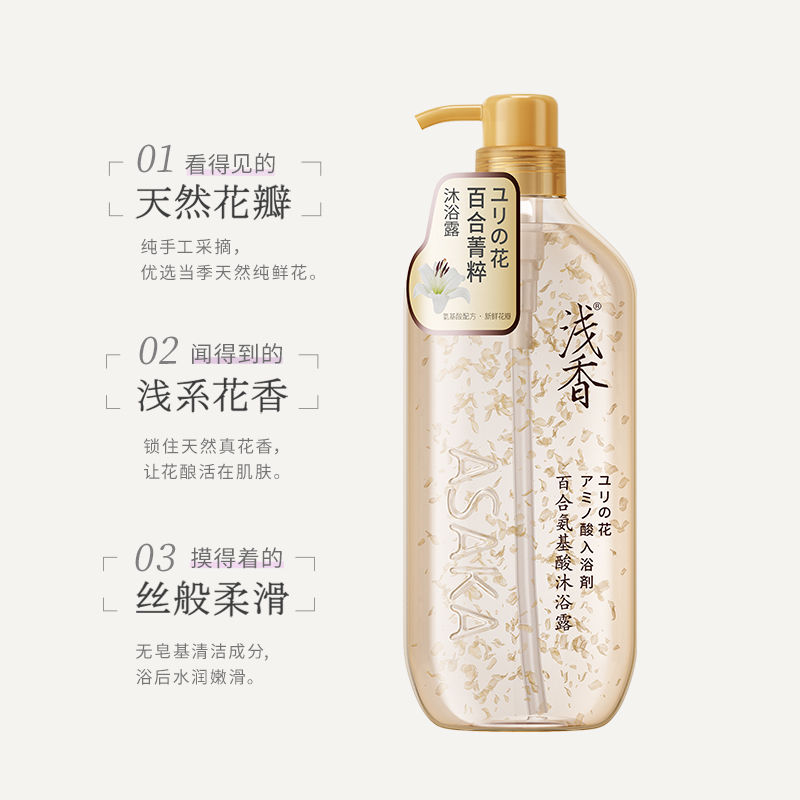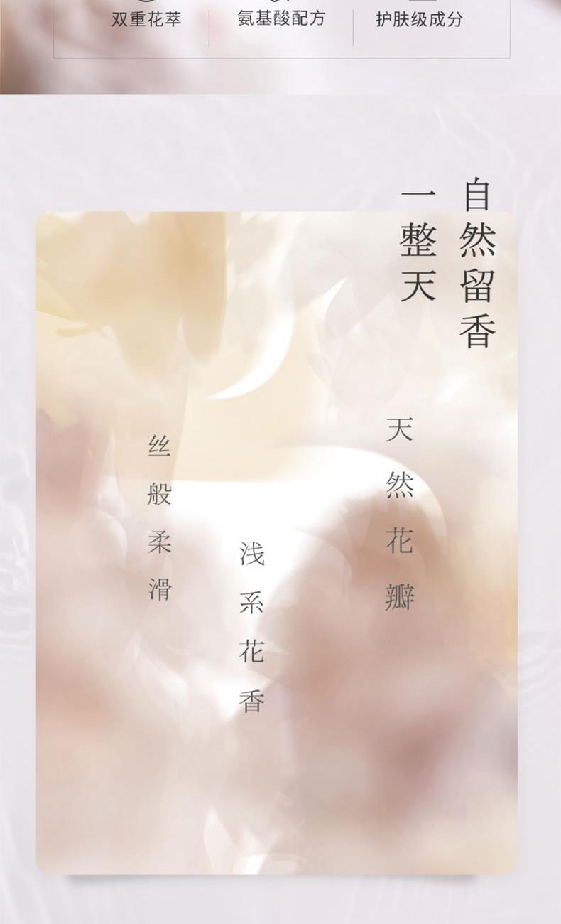 1、看得见的天然花瓣,纯手工采摘,优选当季天然纯鲜花。2、闻得到的浅系花香,锁住天然真花香,让花酿活在肌肤。3、摸得着的丝般柔滑,无皂基清洁成分,浴后水润嫩滑。