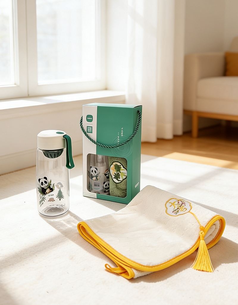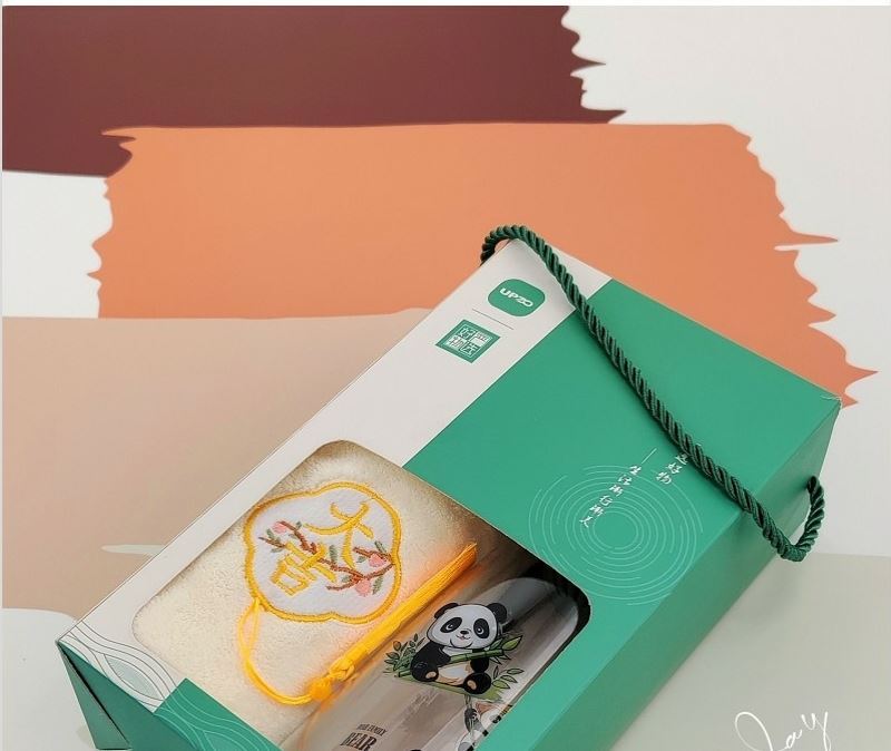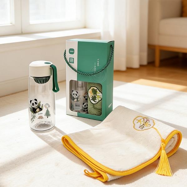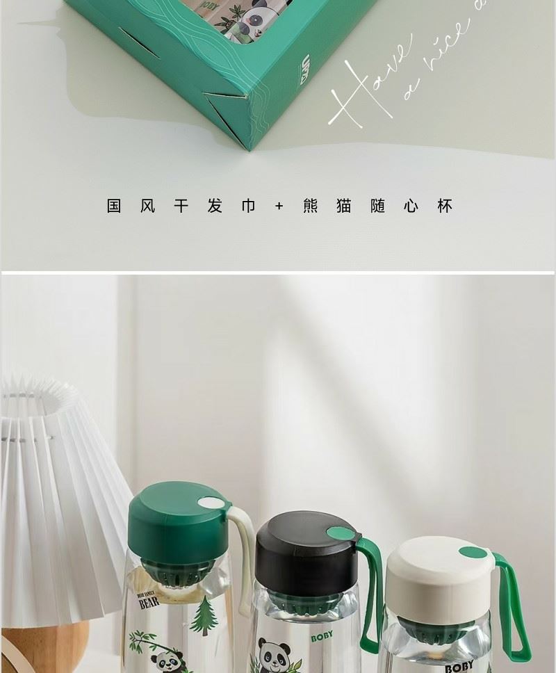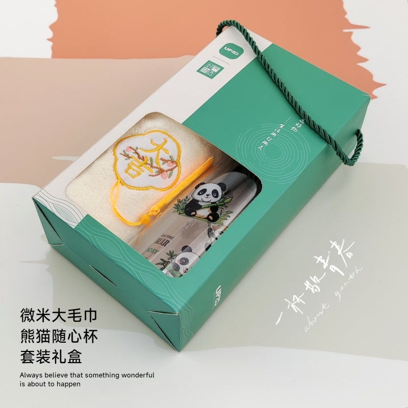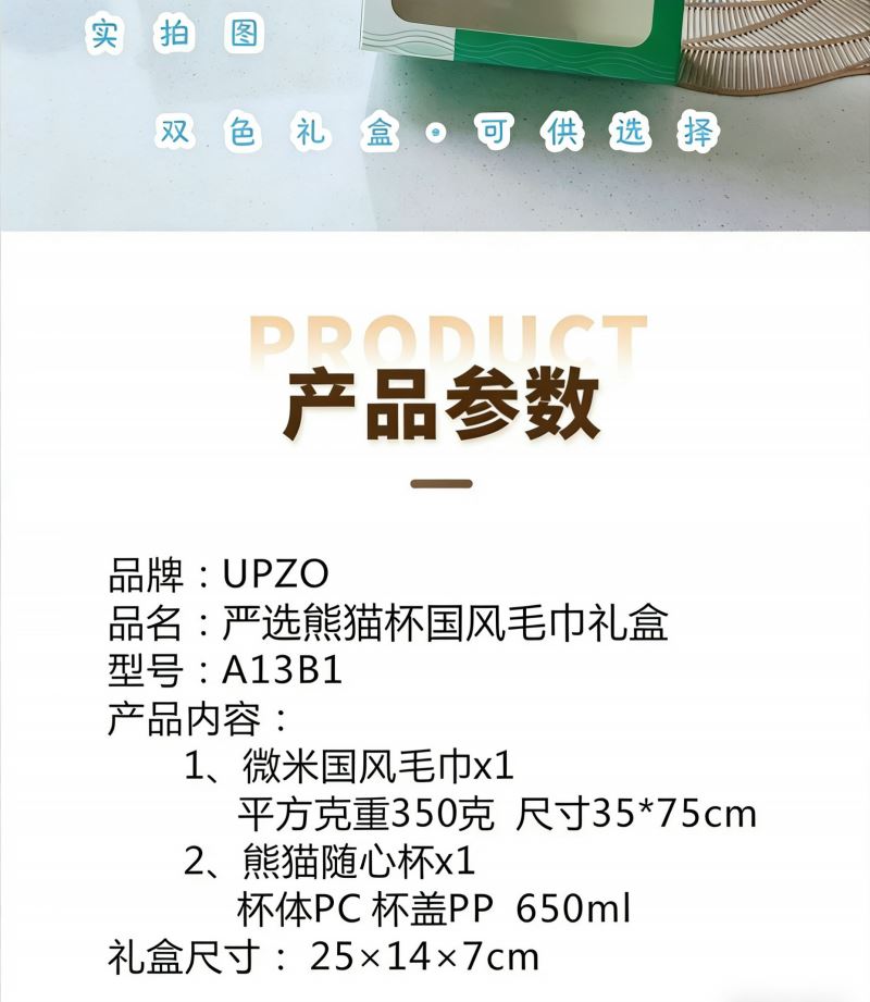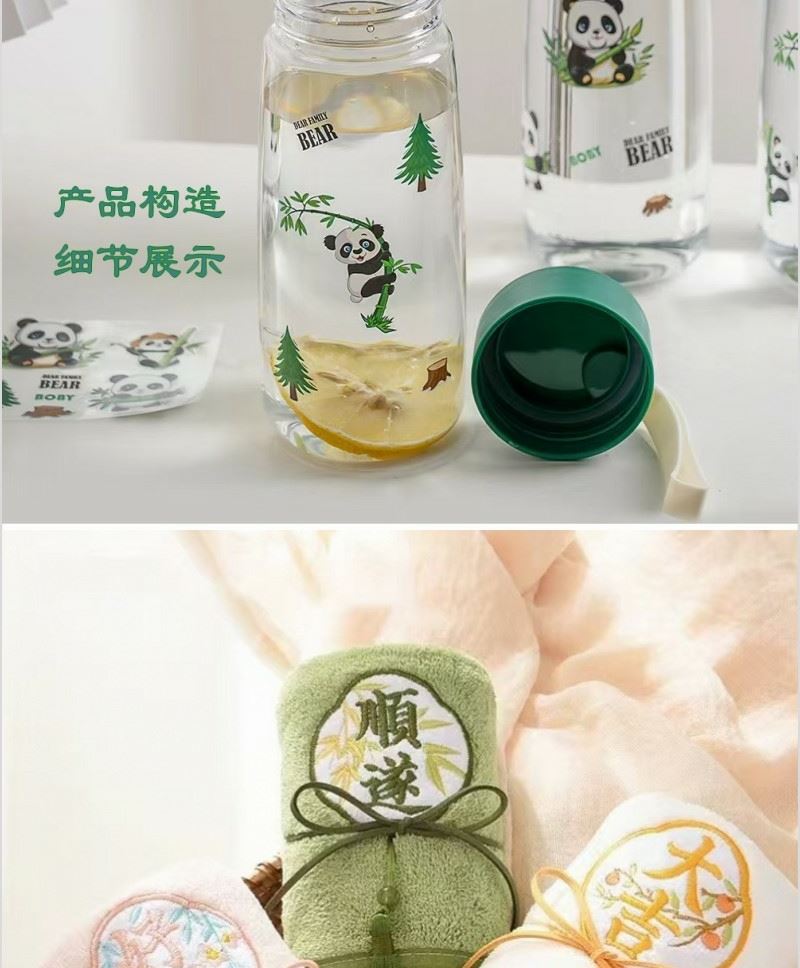 型号: A13B1 产品内容 1、 微米国风系列毛巾×1 微米纱 平方克重350克 规格35*75CM 2、 熊猫随心杯×1 杯体PC 杯盖PP 容量650ML 外盒: 25×14×7cm 熊猫杯创意DIY设计随心贴 空白杯体 可定制专属的客户广告随心贴多重形式 随意打造专属水杯 国风微米毛巾融入祝福理念 面料升级 精工刺绣 为生活添彩