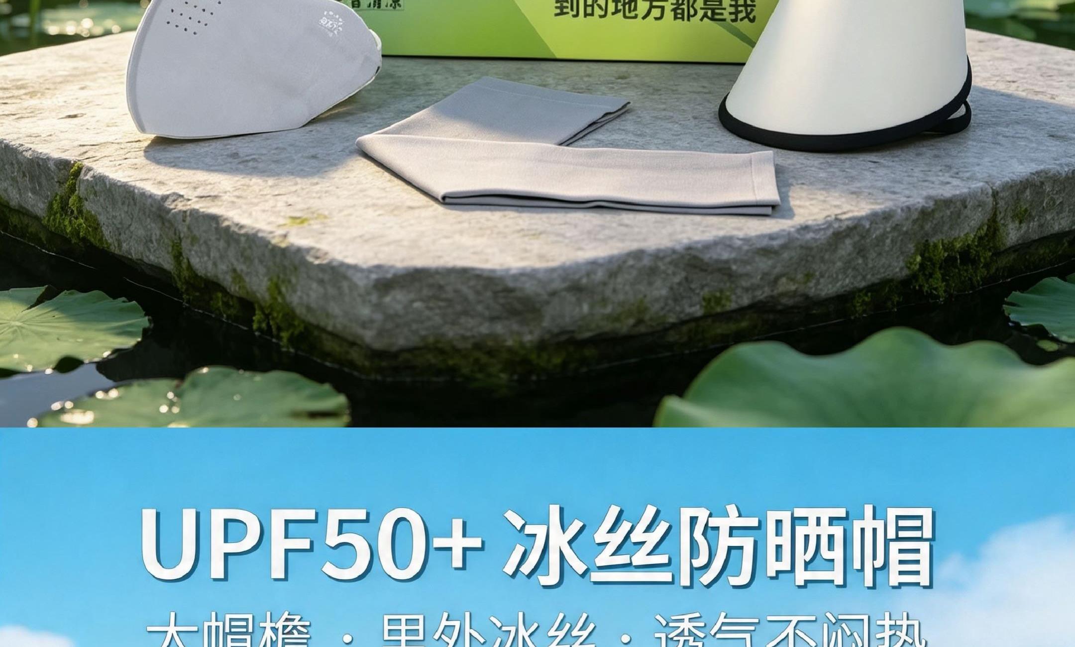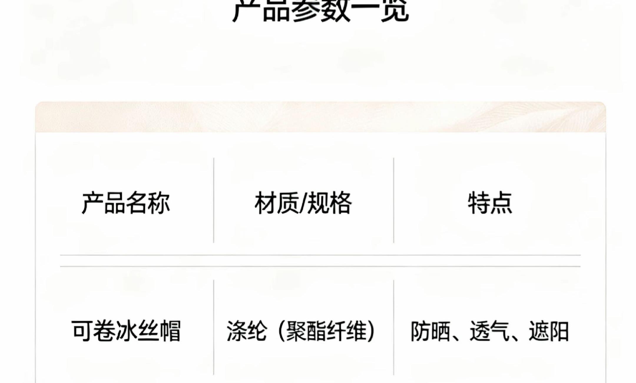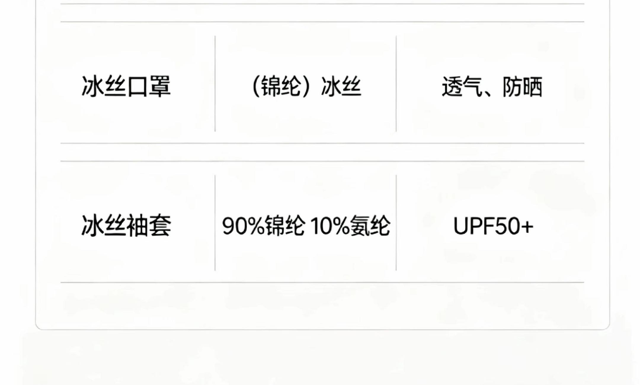 可卷双面冰丝帽*1 冰丝口罩*1 冰丝袖套*1 主要材质和功能: 可卷冰丝帽:涤纶(聚酯纤维),防晒,透气,遮阳 冰丝口罩:(锦纶)冰丝 冰丝袖套:UPF50+,90%锦纶10%氨纶