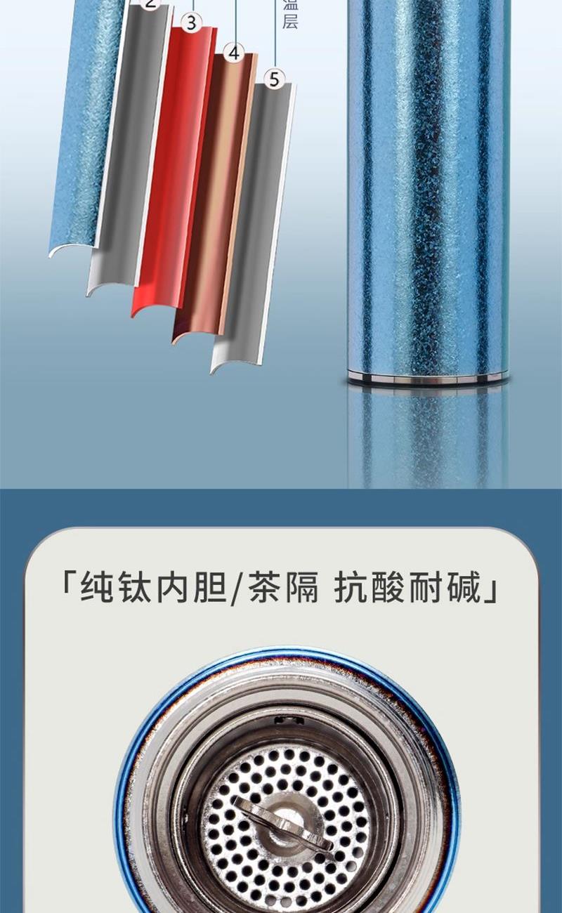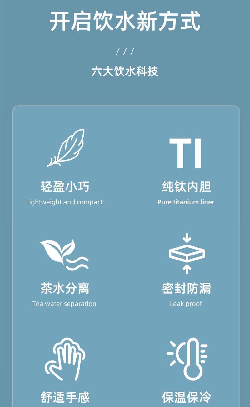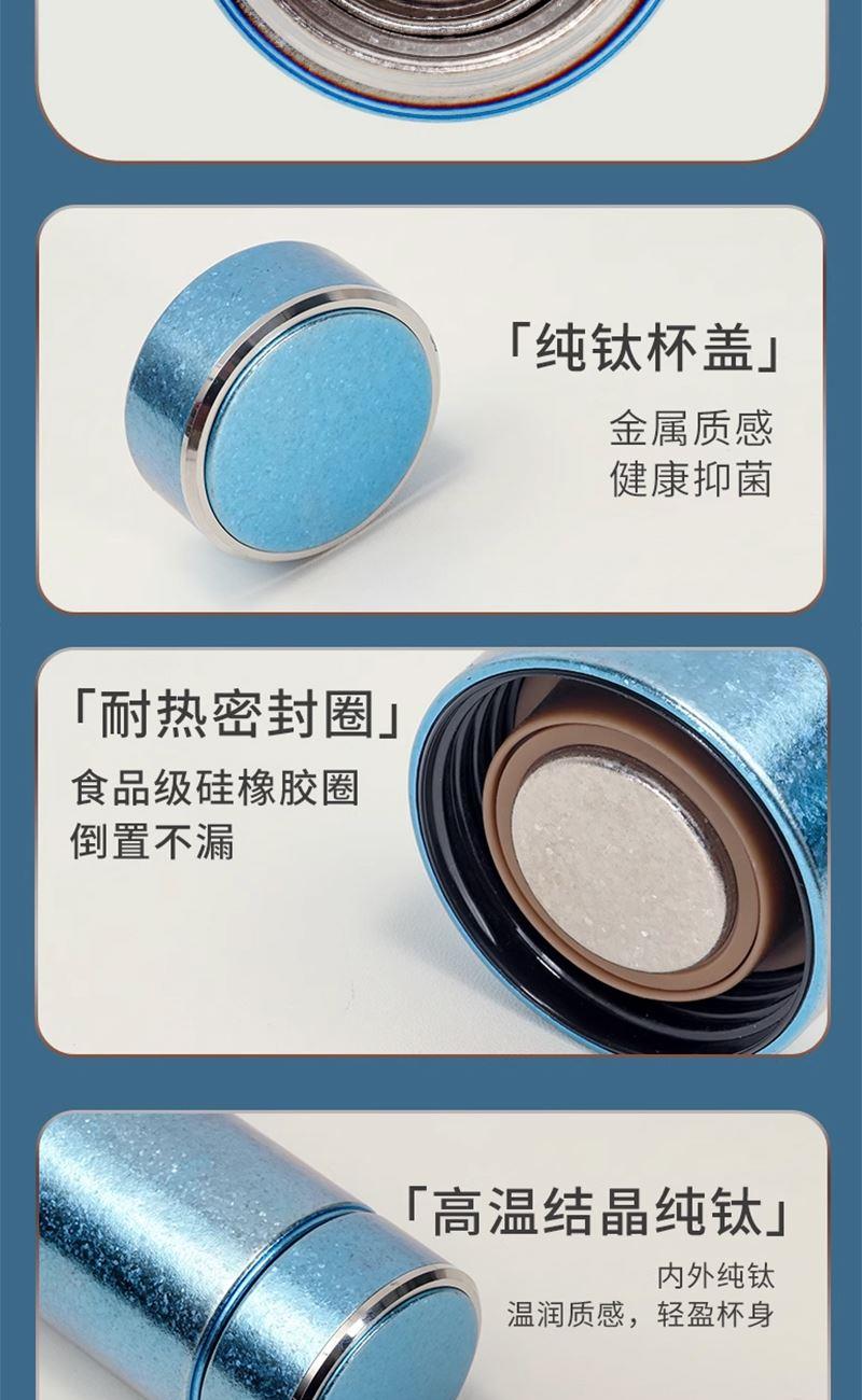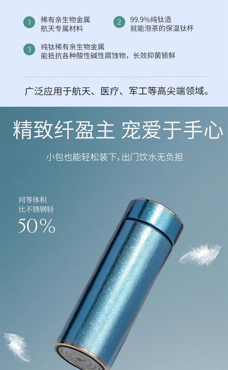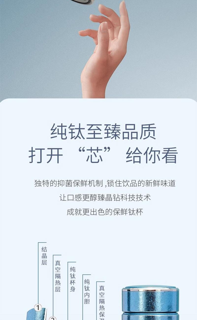 容 量 :470ml 杯 体 材 质 :内外纯钛 塑 料 件:PP (食品接触用) 密 封 圈:硅胶(食品接触用) 颜 色:魅银 / 悠蓝 彩 盒 尺 寸:25.5*12*8.1CM 外 箱 尺 寸:56*31*37CM 毛重(带礼盒):556g 卖点: 杯体采用纯钛材质,含钛量达99.8%。 保冷保温,健康锁鲜。 材质健康安全,不与各类酸碱性饮品产生化学反应,安全无析出,放心盛放日常饮品。 表面色彩不喷漆上色,阳极氧化自然产生色彩,长期使用不掉色。