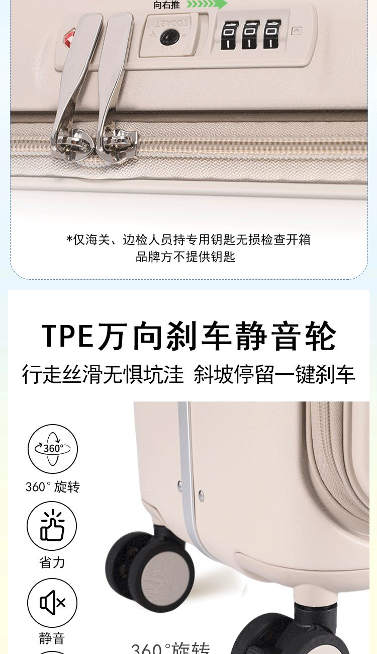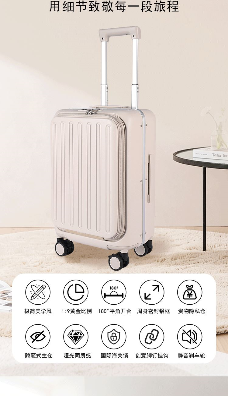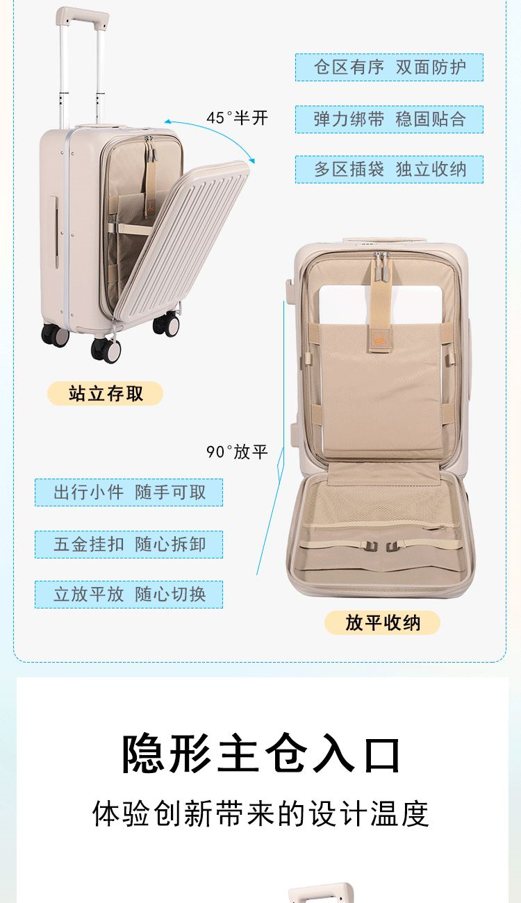 1、极简美学圆润设计,轮廓精致典雅靓丽 2、纯然同配色哑光工艺,自带轻奢质感 3、前置电脑快捷仓,随取随用从容办公快速安检 4、黄金1:9比例布局,科学释放近 99% 储物空间 5、浑然一体大深仓,多层分类归置尽享温度与安心 6、多处创新工艺暗藏巧思,贴心诠释移动出行助理