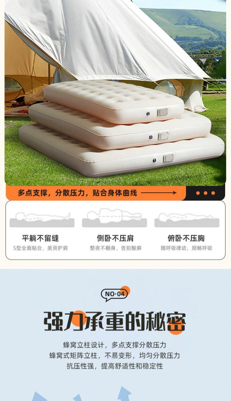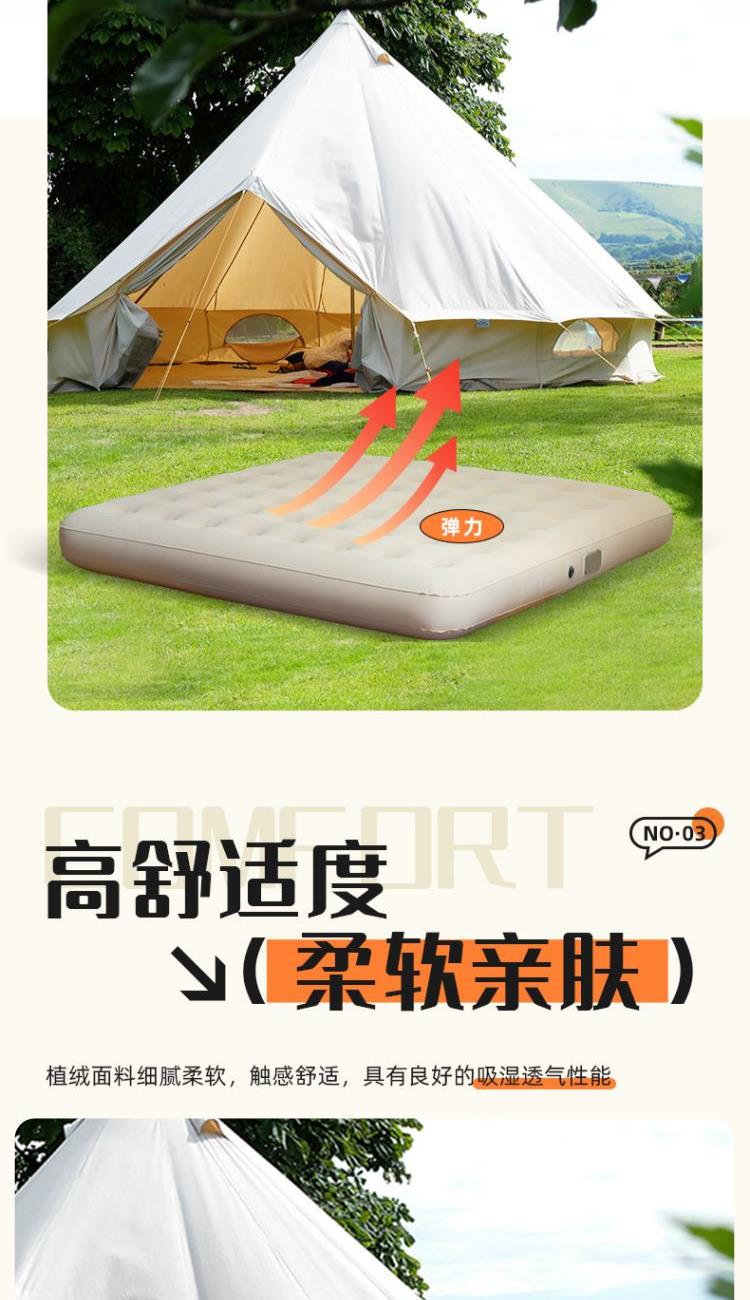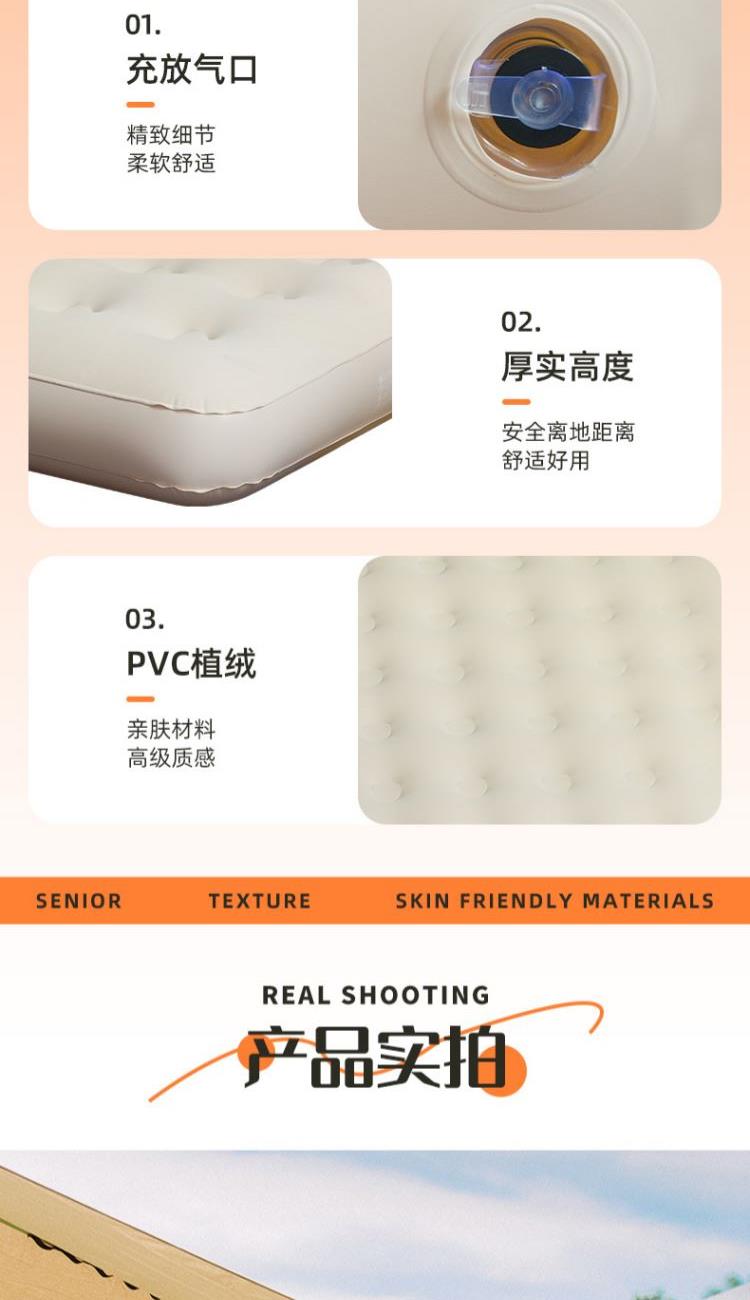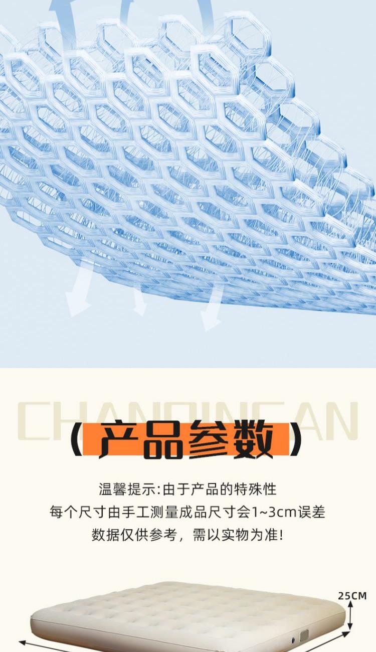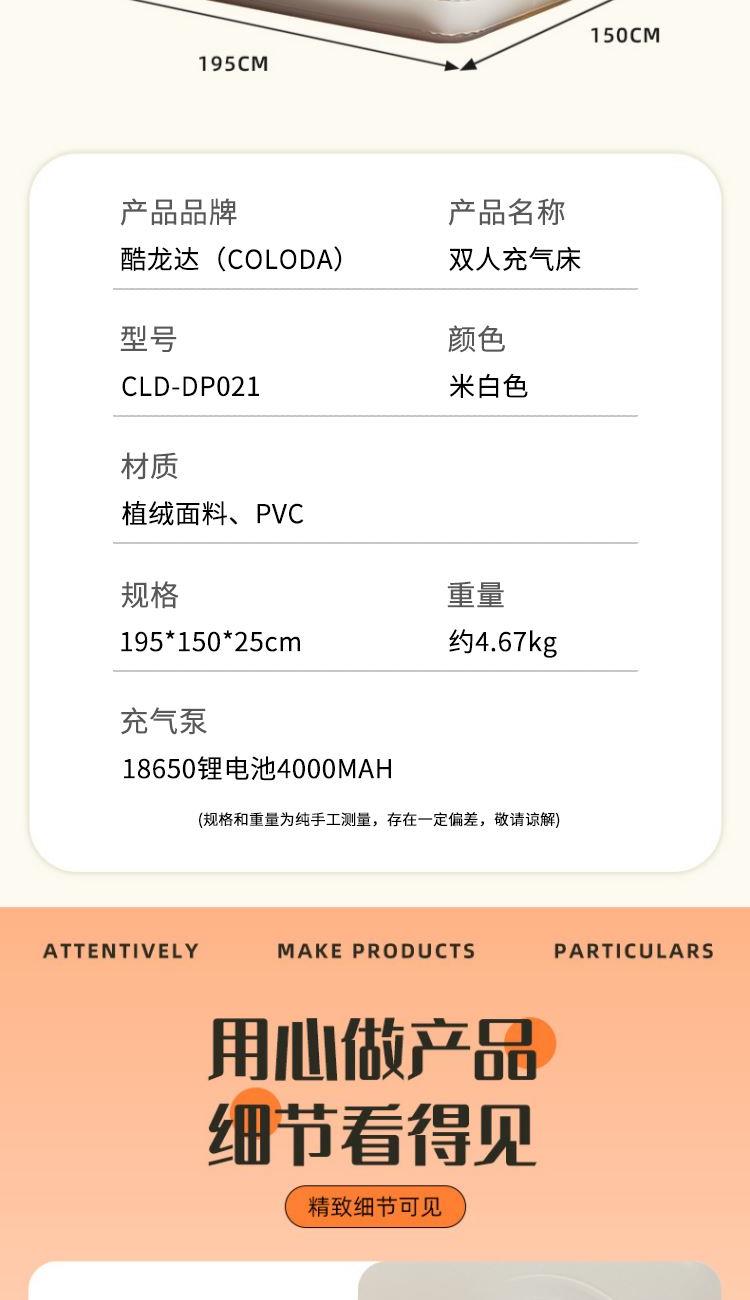 材质:环保PVC植绒 颜色:米白色 尺寸:195*150*25cm 配件:电池入电泵盒+修补片+修补胶+三合一充气口+USB充电线