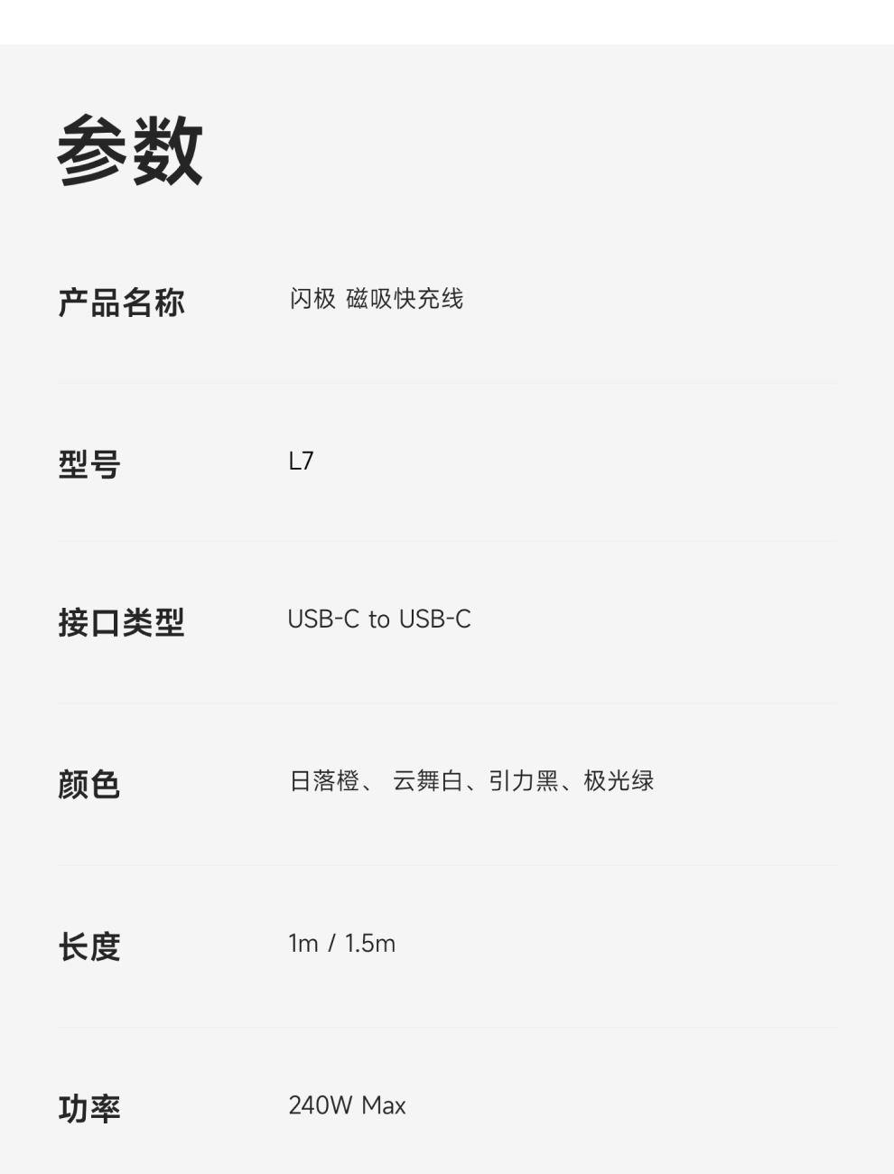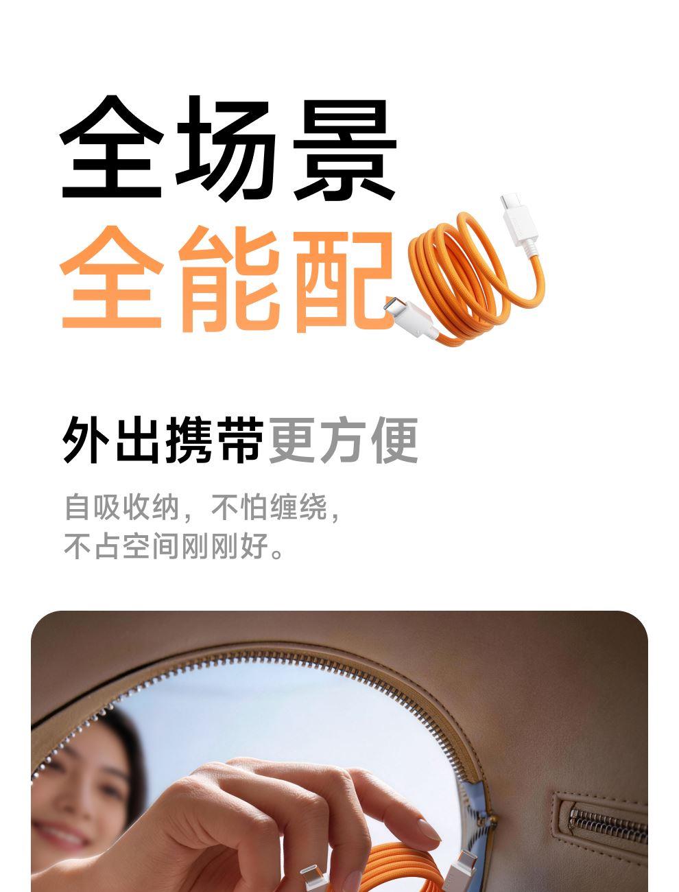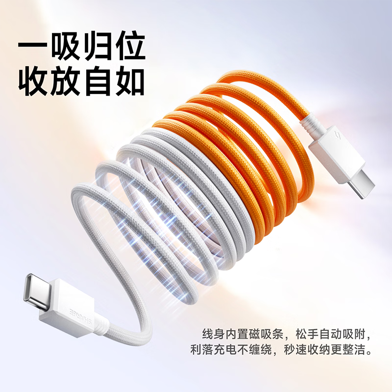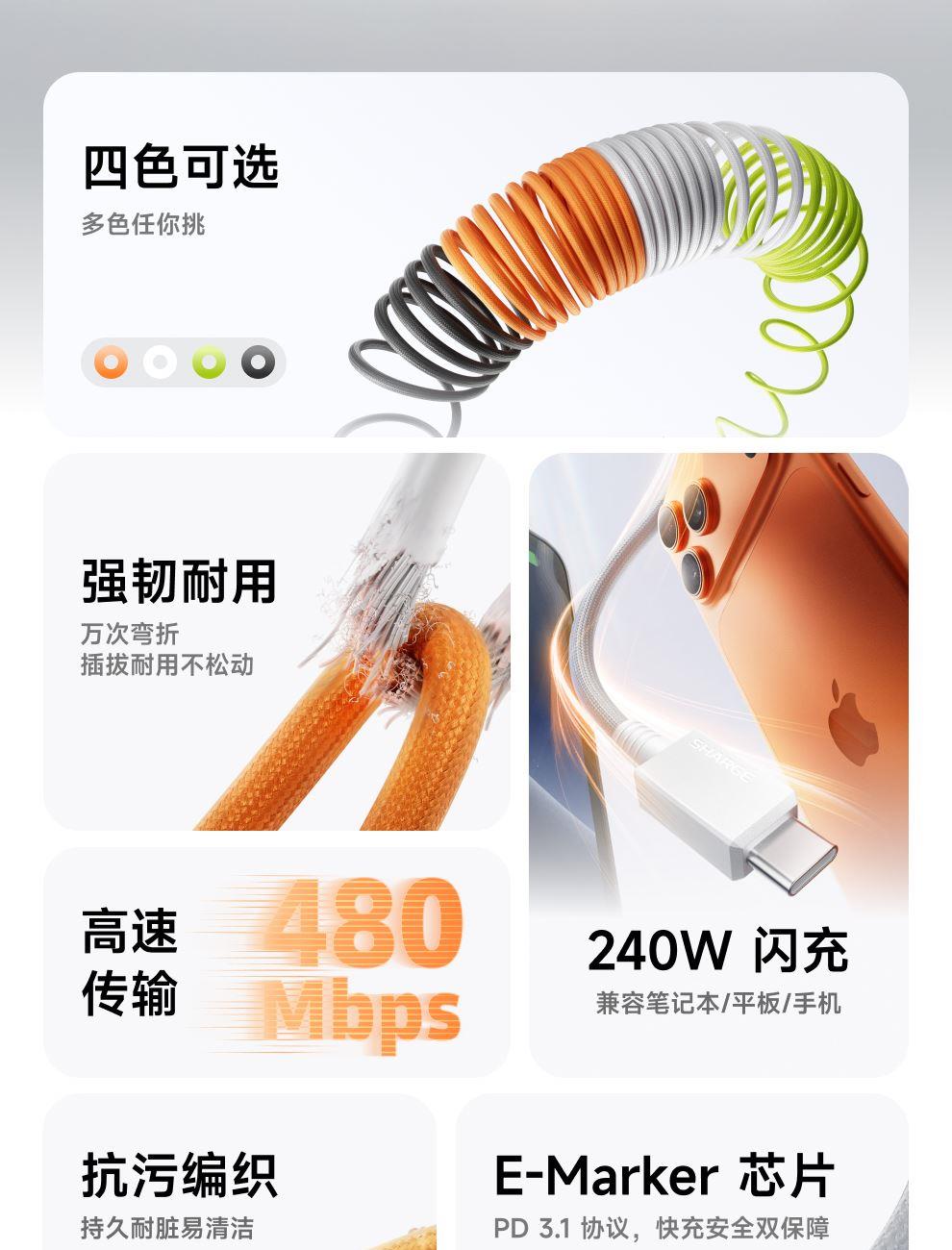 PD3.1协议,240W快充 纳米抗脏涂层编织线,坚韧耐用 E-Marker芯片,智控畅享安全快充 480Mbps传输数据,秒传不等待 手机、平板、笔记本,PD3.1安全快充不伤机 线身内置磁吸条,松手自动吸附收纳
