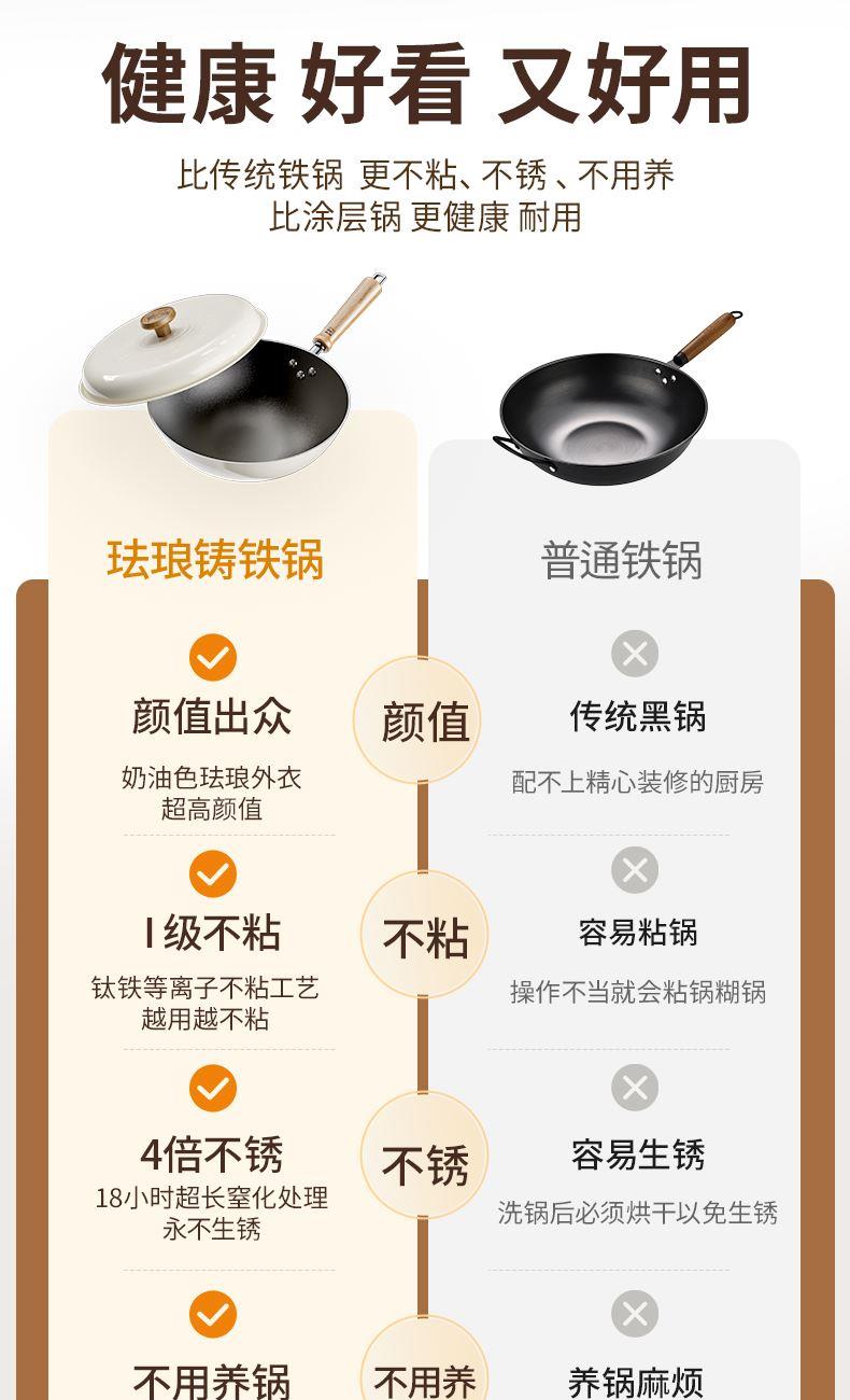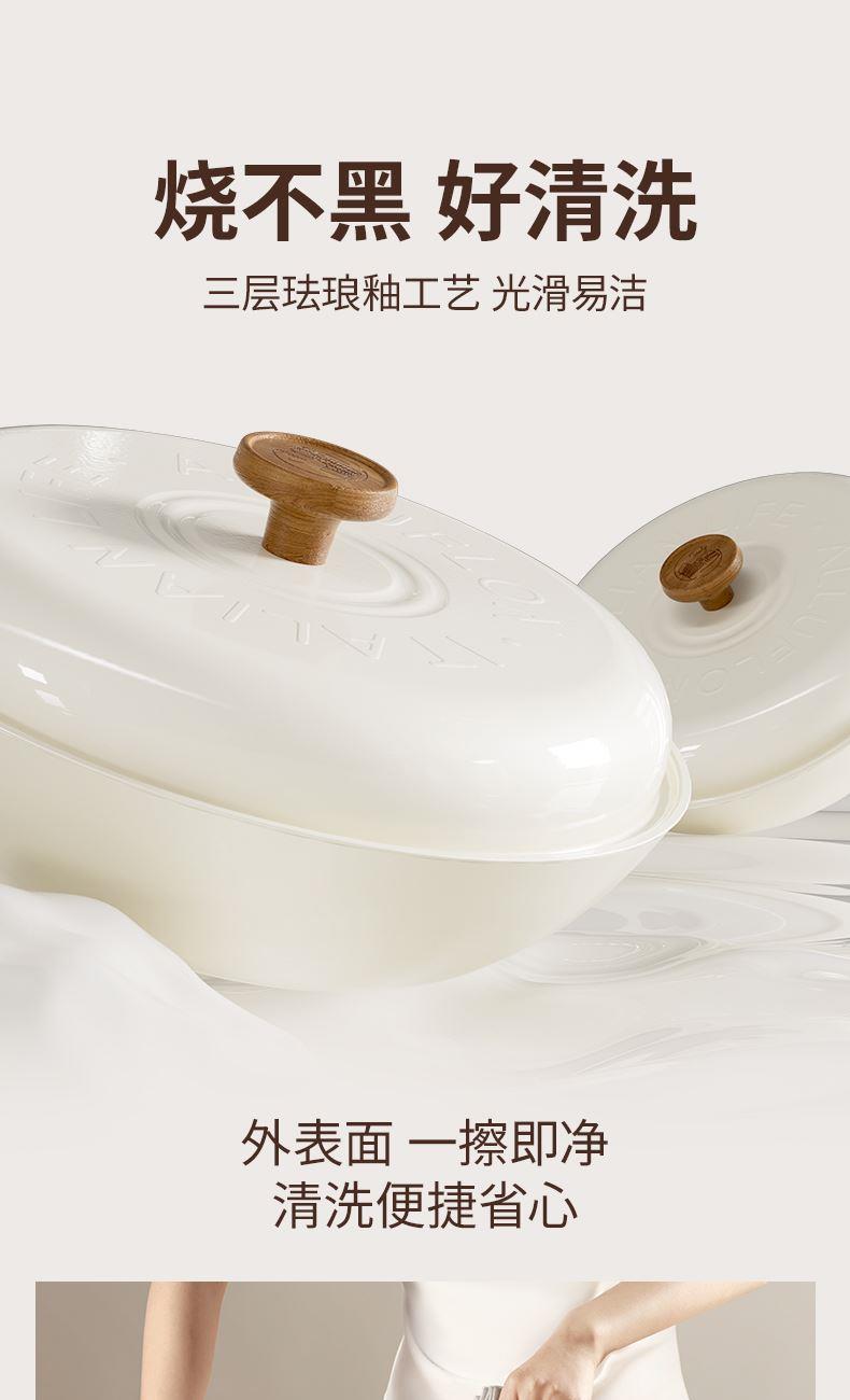 产品规格:24cm 产品货号:2301280432 外箱尺寸:570*390*615mm 彩盒尺寸:548*370*145mm 1、颜值出众,奶油色珐琅外衣 2、I级不粘,等离子不粘工艺 3、4倍不锈,18小时超长窒化处理 4、不用养锅,更适合铁锅新手、懒人