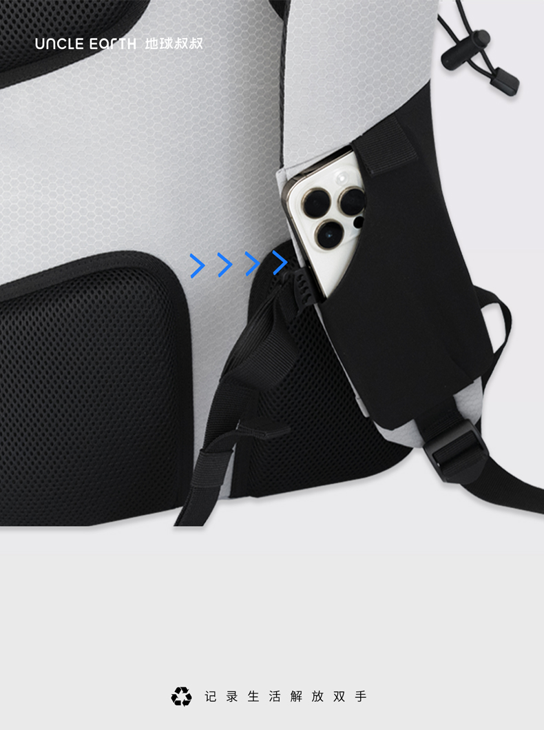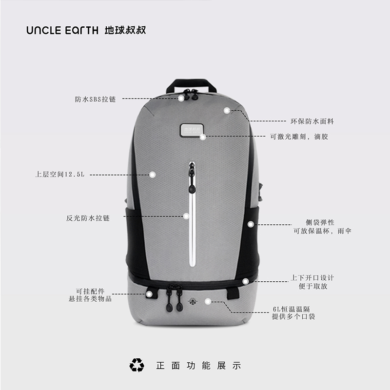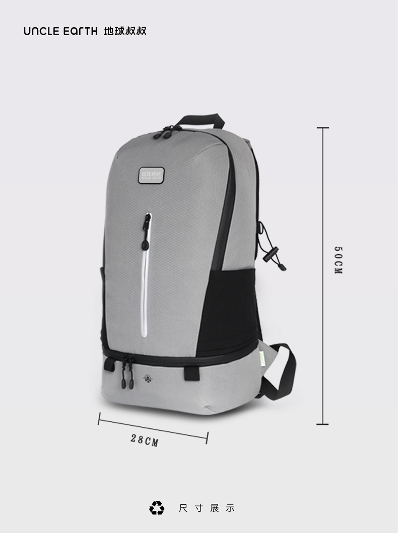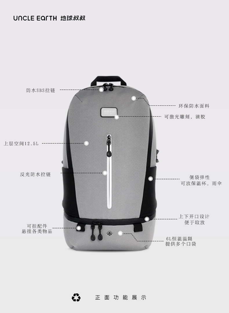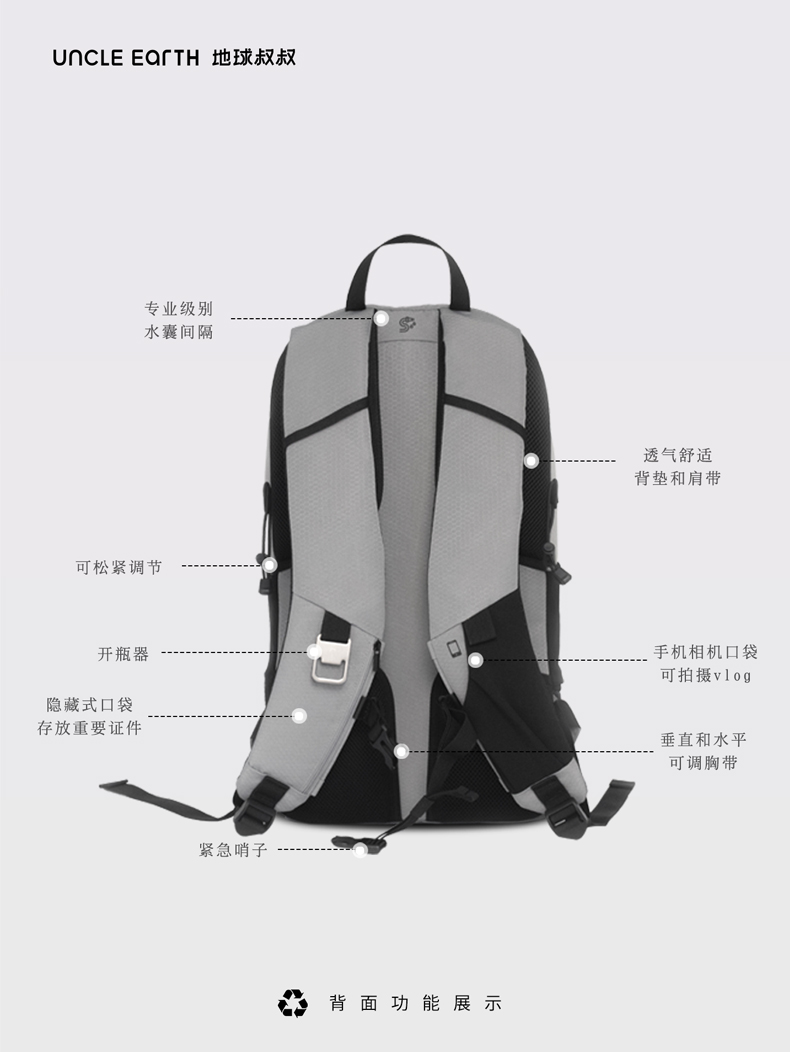 1、由回收塑料瓶制成♻♻♻ 2、男女通用,适合通勤、户外、旅行,黑、灰两个颜色 3、上下两层分离,下层可作为独立的保温保冷仓使用,移动的小冰箱,也可隔离分离干湿物件 4、正面有反光条提醒,3级防水面料,拉链为全密封包裹。 5、胸前减压带,上下可调节,有求救口哨,上部喝水口,肩带左边可以手机,一边走一边摄像,右边有开瓶器,肩带上多个小口袋 6、多处能挂钩设计,适合挂鞋子,帽子,帐篷等 7、背部有透气背垫,肩带为S型,符合人体工学设 8、侧面双口袋,放水杯雨伞 9、产品尺寸: 50*28*17 厘米 10、内部放16寸电脑