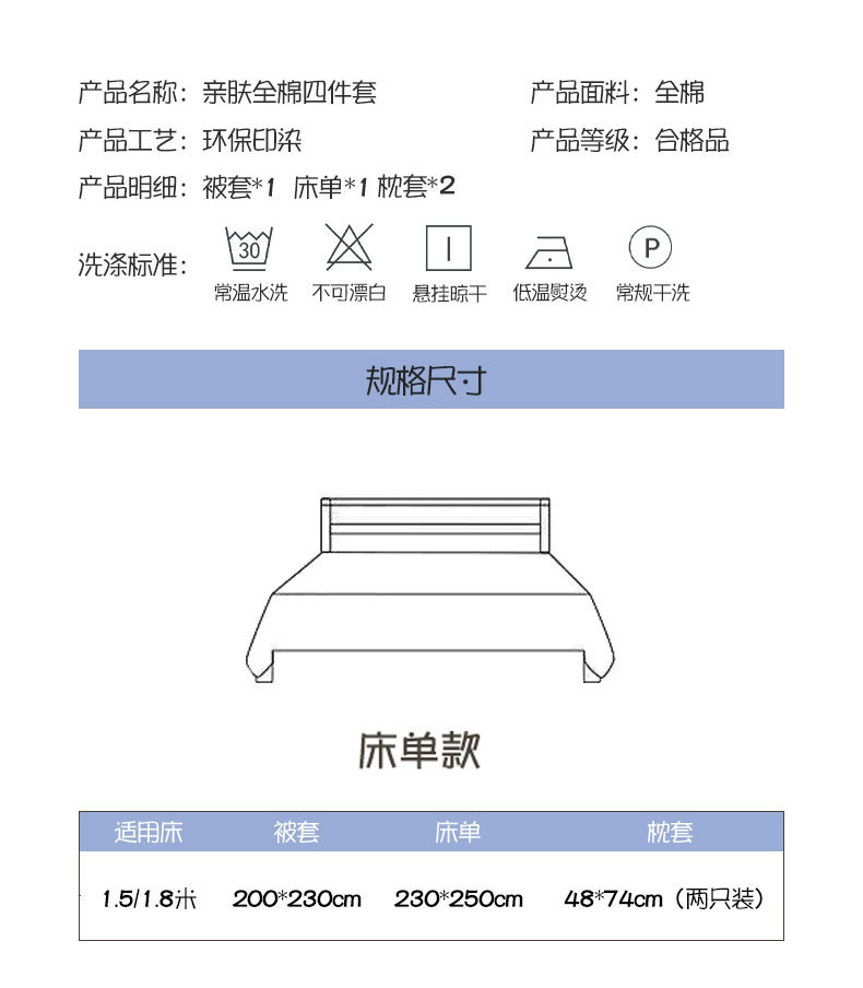 被套:200×230cm 床单:230×250cm 枕套:48×74cm 适用:1.5M-1.8M床 面料:全棉 印染工艺:环保印花 风格:田园风格 包装:手提礼盒 甄选全棉面料,纯净无刺激,柔软亲肤,AB版设计,舒适透气,不易起球。
