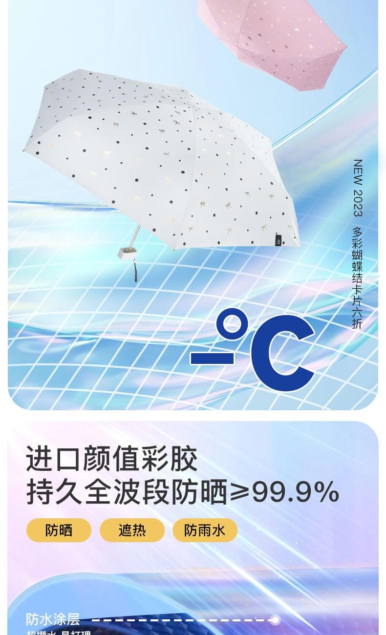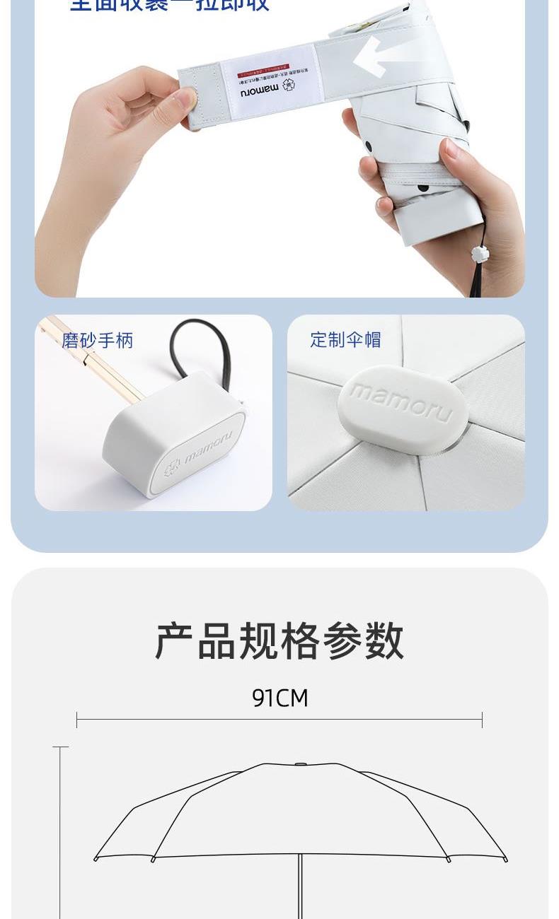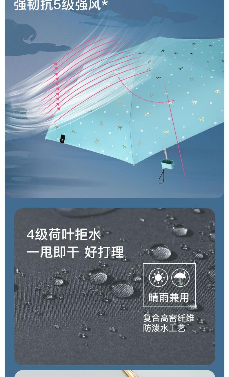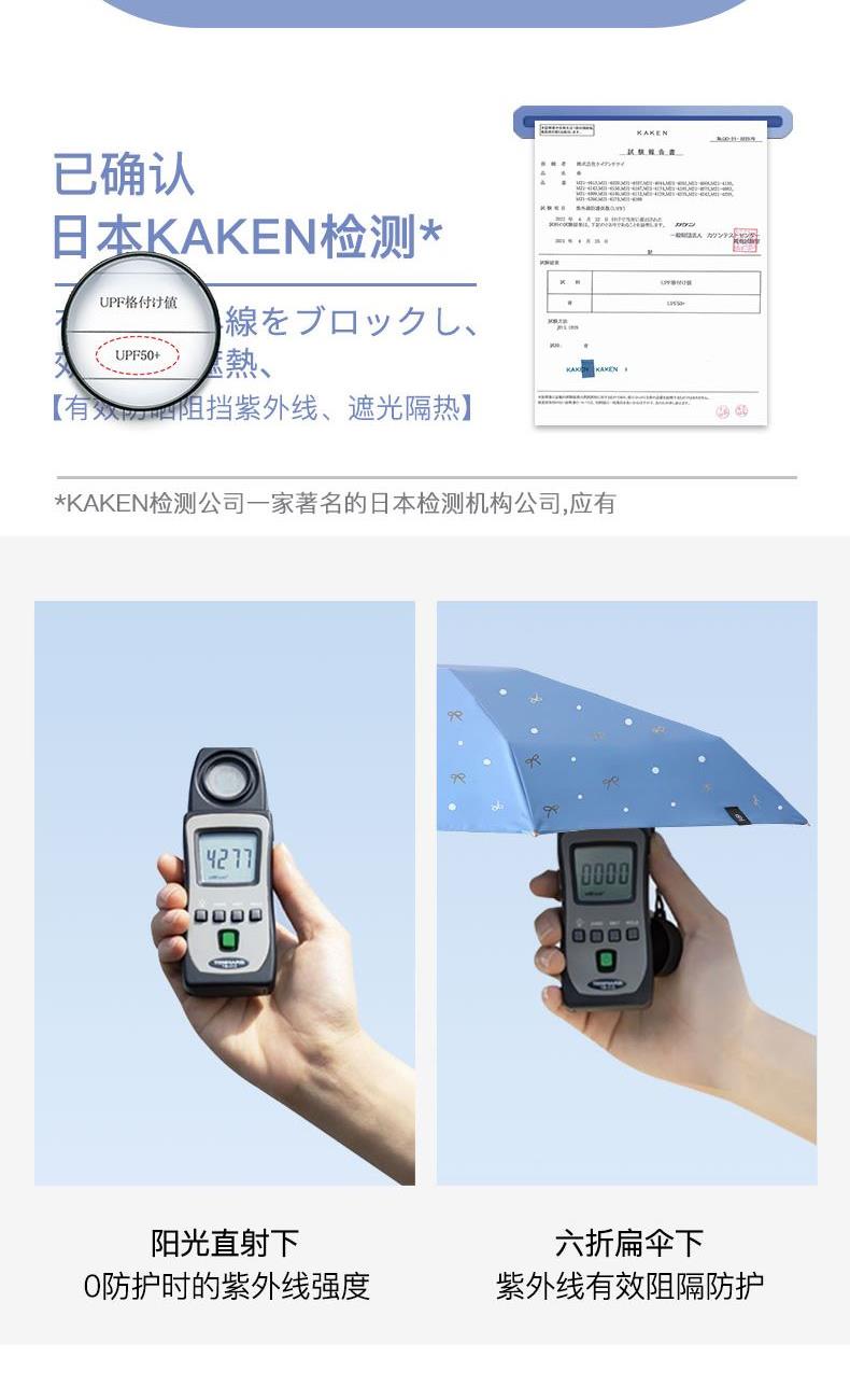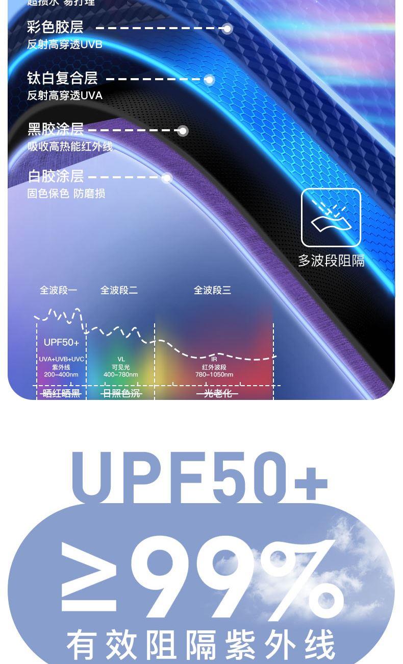 4、采用30D彩胶贴合面料,比普通黑胶大大提高了伞的整体颜值,手感好,遮光99.99%,防晒UPF50+,伞下体感降温超过10°以上,UV防紫外线内外L.R.C.涂层,紫外线阻隔高达800倍,真正做到夏日0负担出门,保护娇嫩肌肤,防止不可逆转的皮肤老化