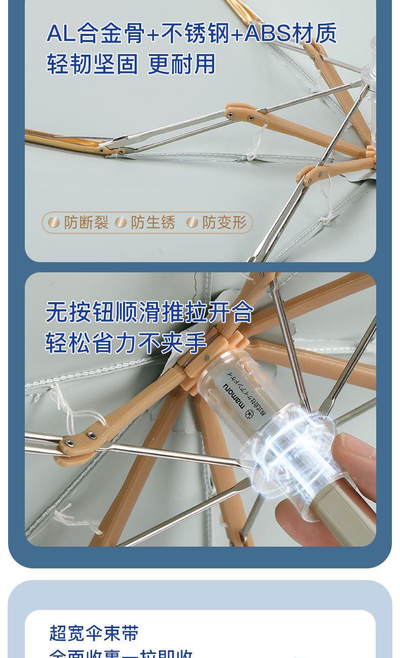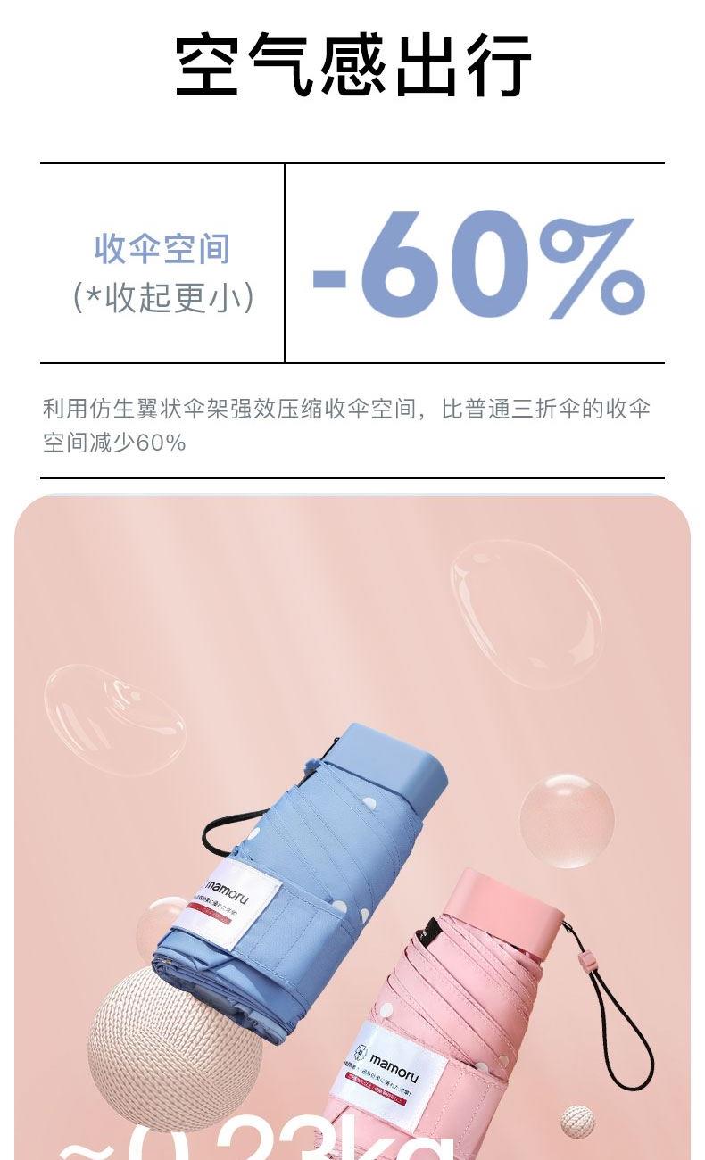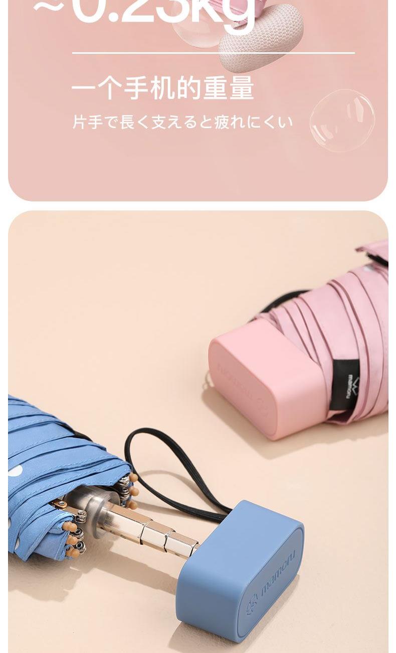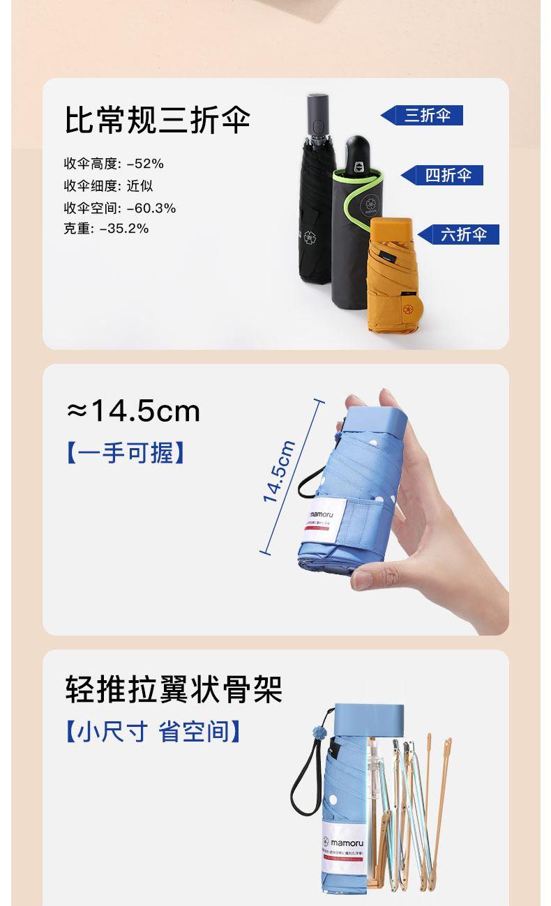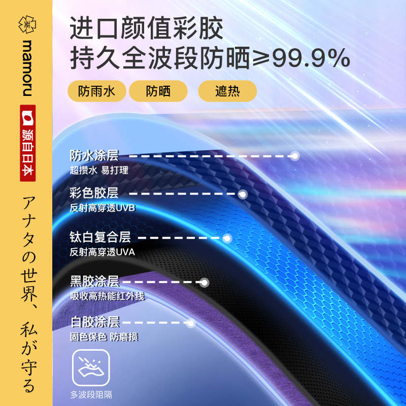 4、采用30D彩胶贴合面料,比普通黑胶大大提高了伞的整体颜值,手感好,遮光99.99%,防晒UPF50+,伞下体感降温超过10°以上,UV防紫外线内外L.R.C.涂层,紫外线阻隔高达800倍,真正做到夏日0负担出门,保护娇嫩肌肤,防止不可逆转的皮肤老化