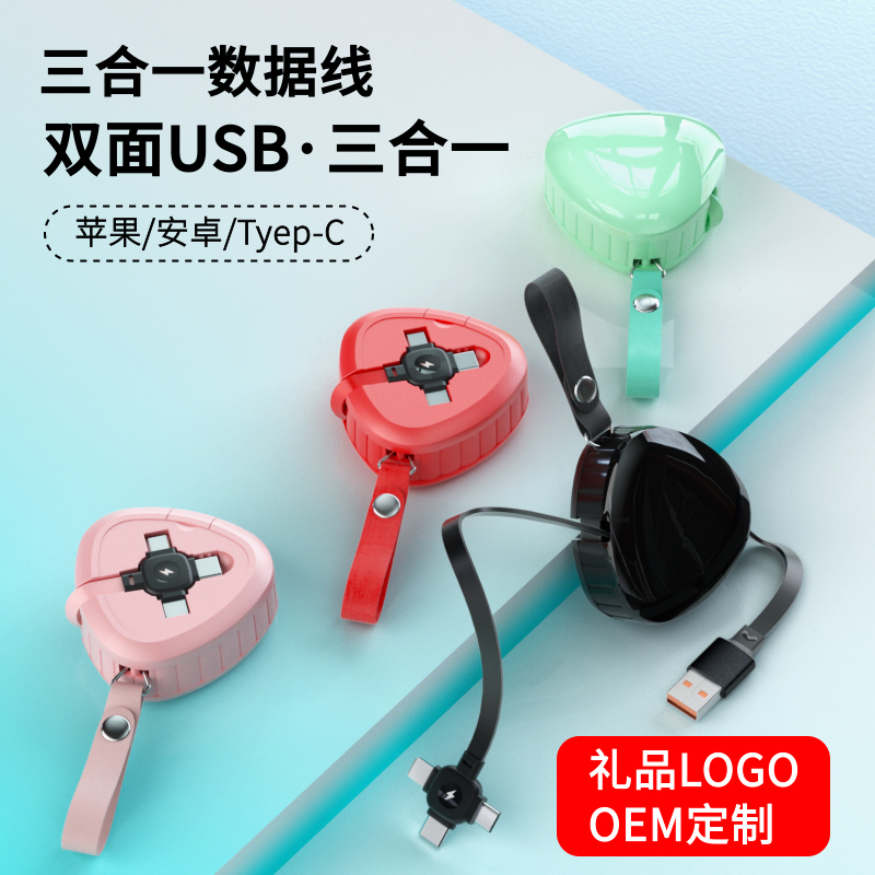 奥苏米三角三合一66W快充数据线 颜色:粉 绿 黑 红 材质:TPE线 尺寸:1M 包装:彩盒包装 【功能特点】: 5A快充数据线,充电更快 三种接口满足各种手机 1米长度设计,使用方便 TPE材质耐用,不易折断 可大面积彩印客户logo 五档伸缩调节
