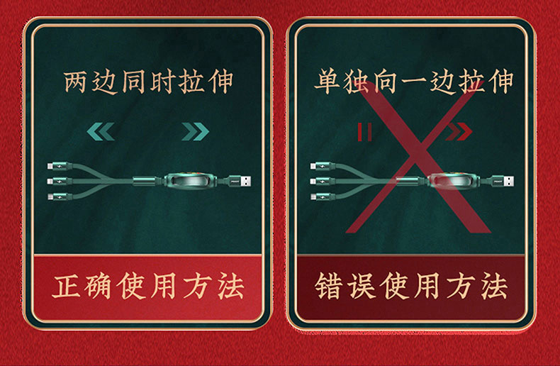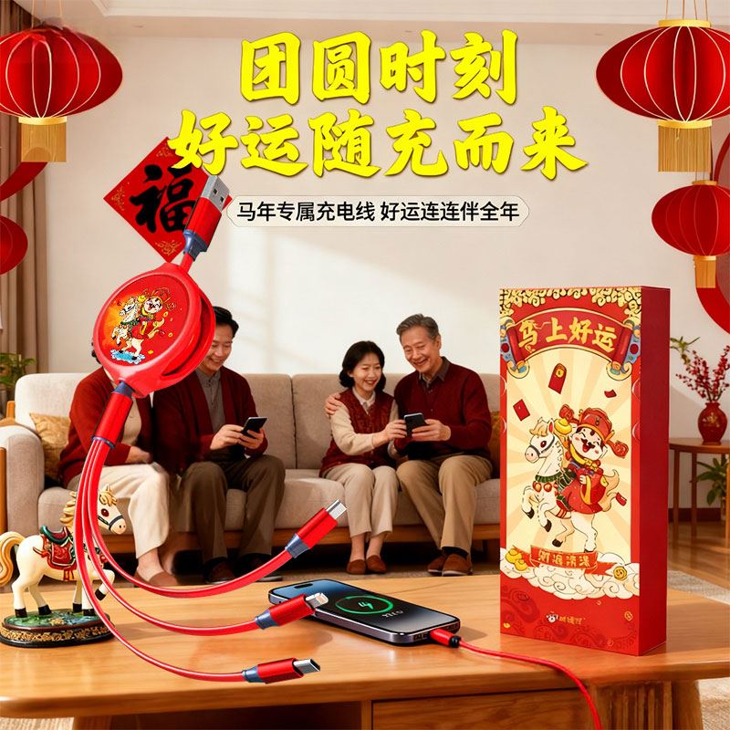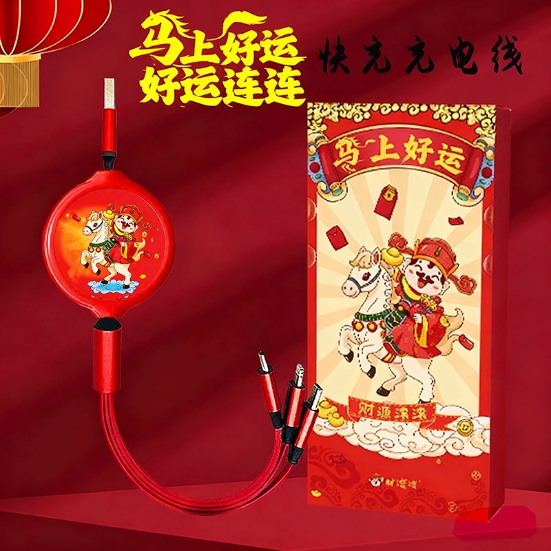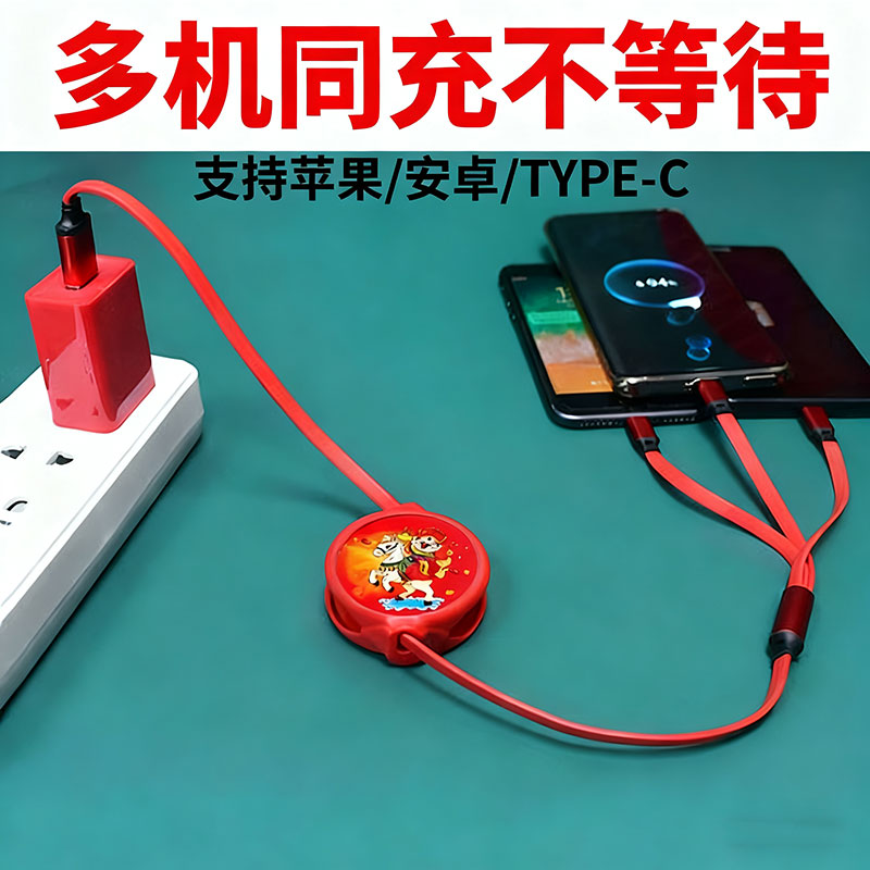 数据线长度:120cm 分线接头数量:一托三 颜色:红色 材料:硅胶+铝金合头 适用机型:苹果/安卓/Type-C • 一拖三数据线:可充电任何手机,数码设备接口。 • 自由伸缩,小巧便携。 • 正面财神,背面可定制LOGO宣传 • 经济实用性价比高 出货速度快
