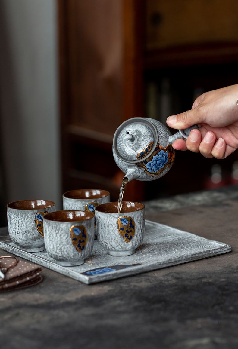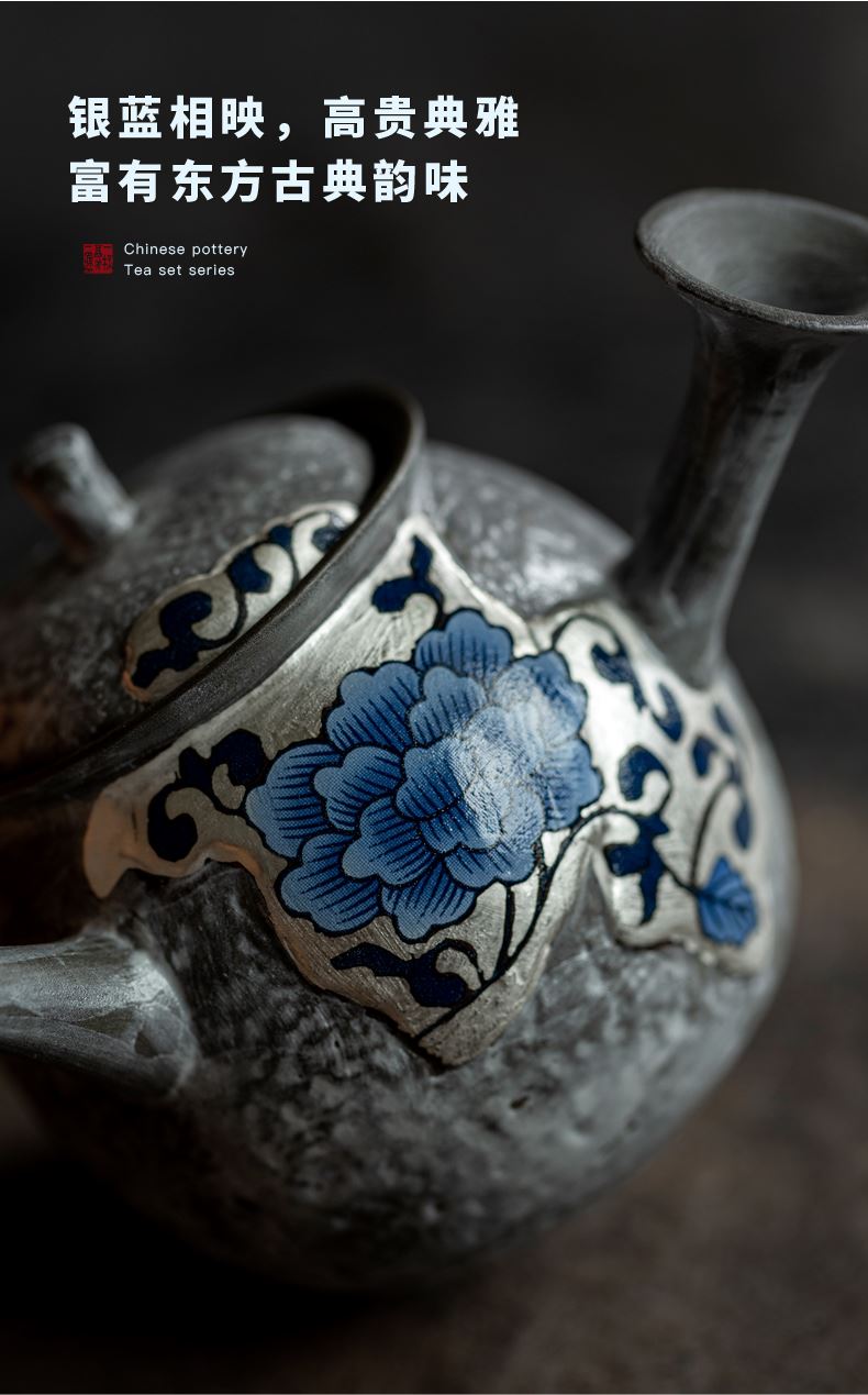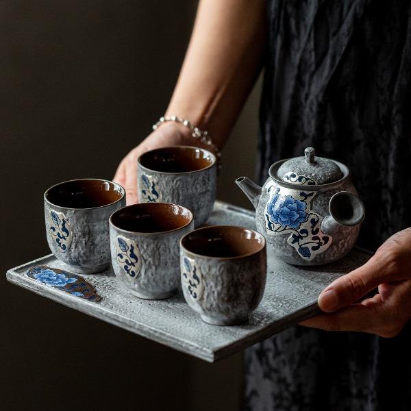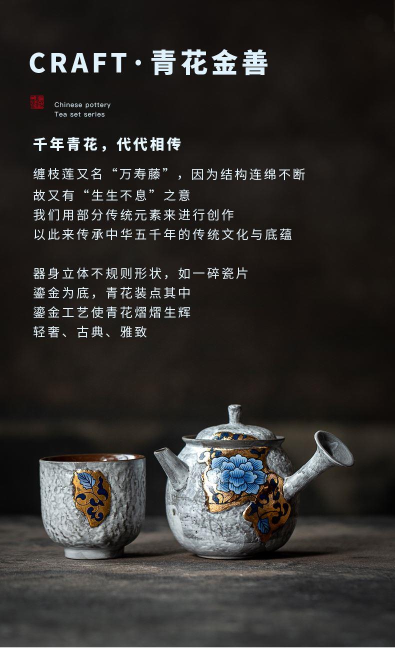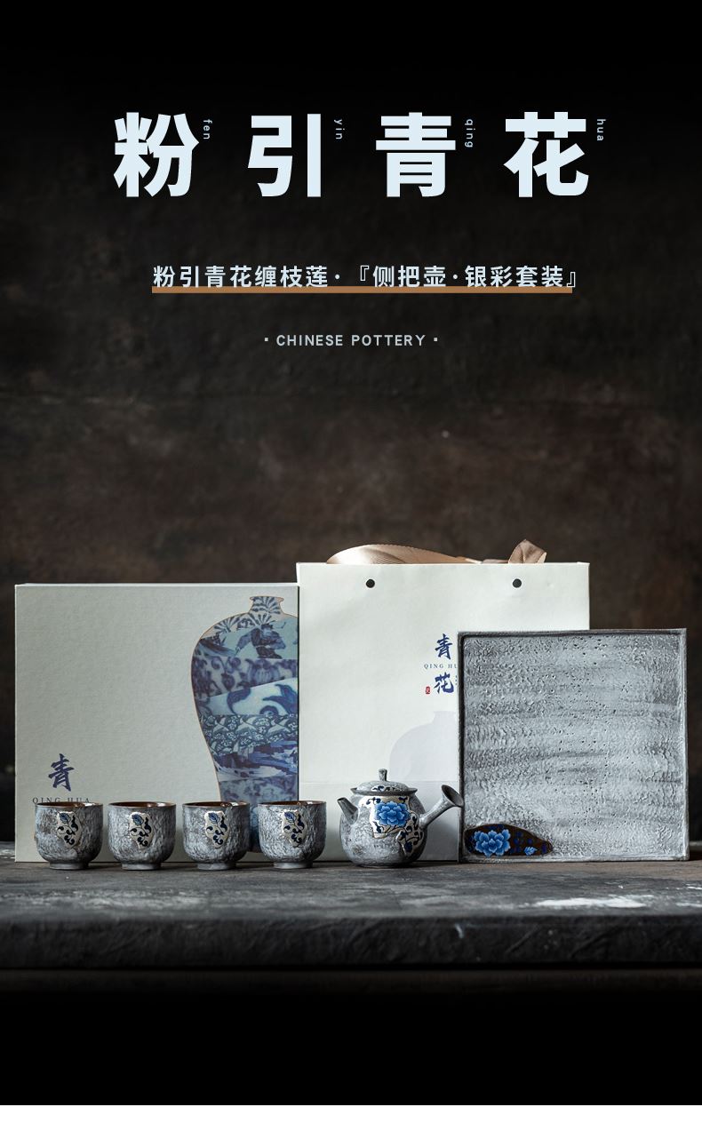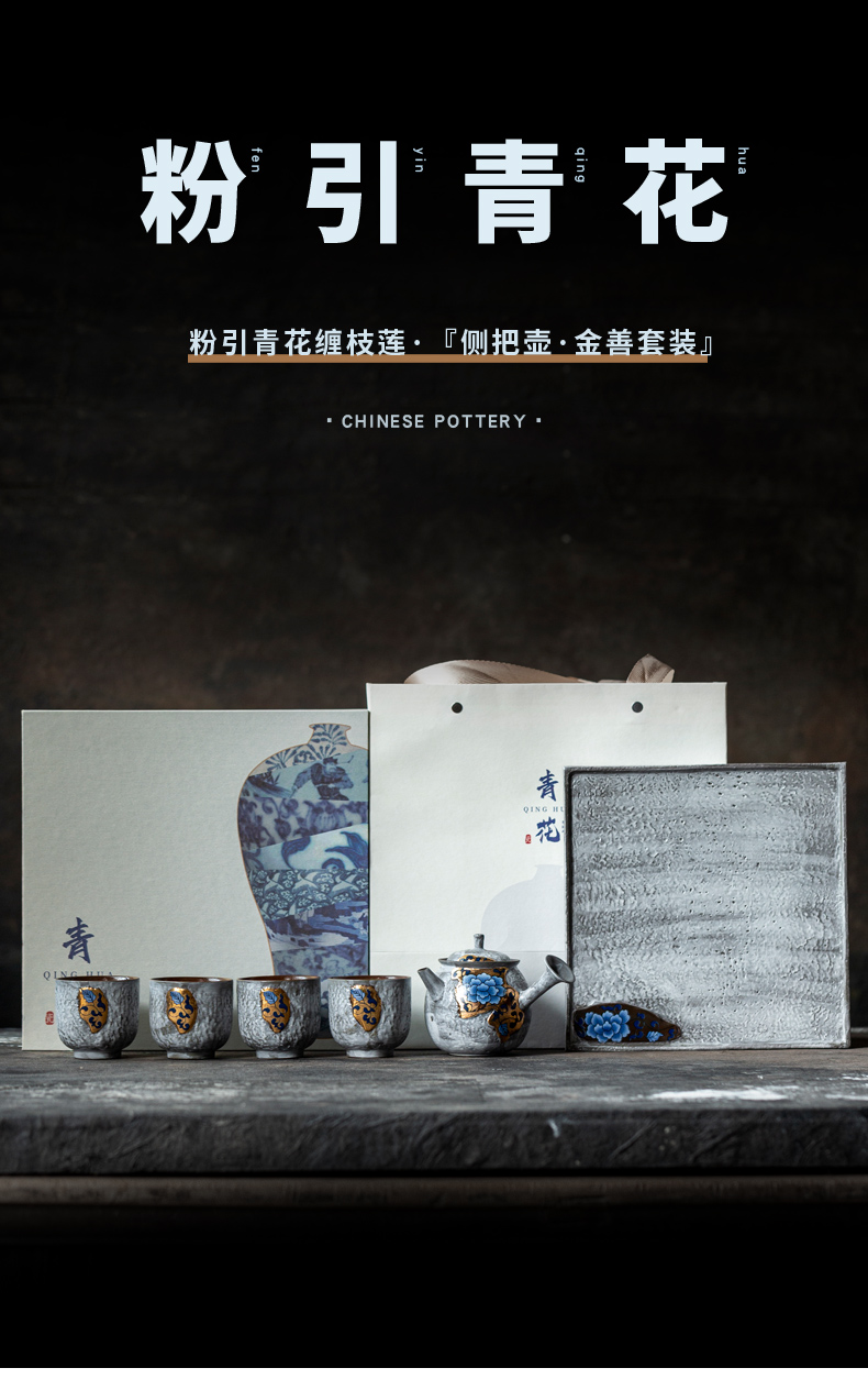 尾桥下窑粉引青花缠枝莲古典侧把壶茶具套装节日茶室商务礼品
