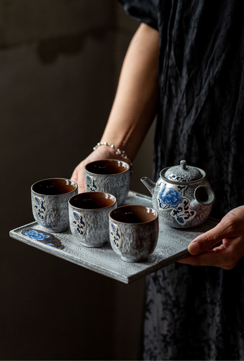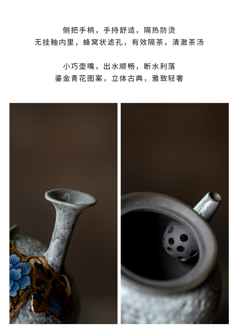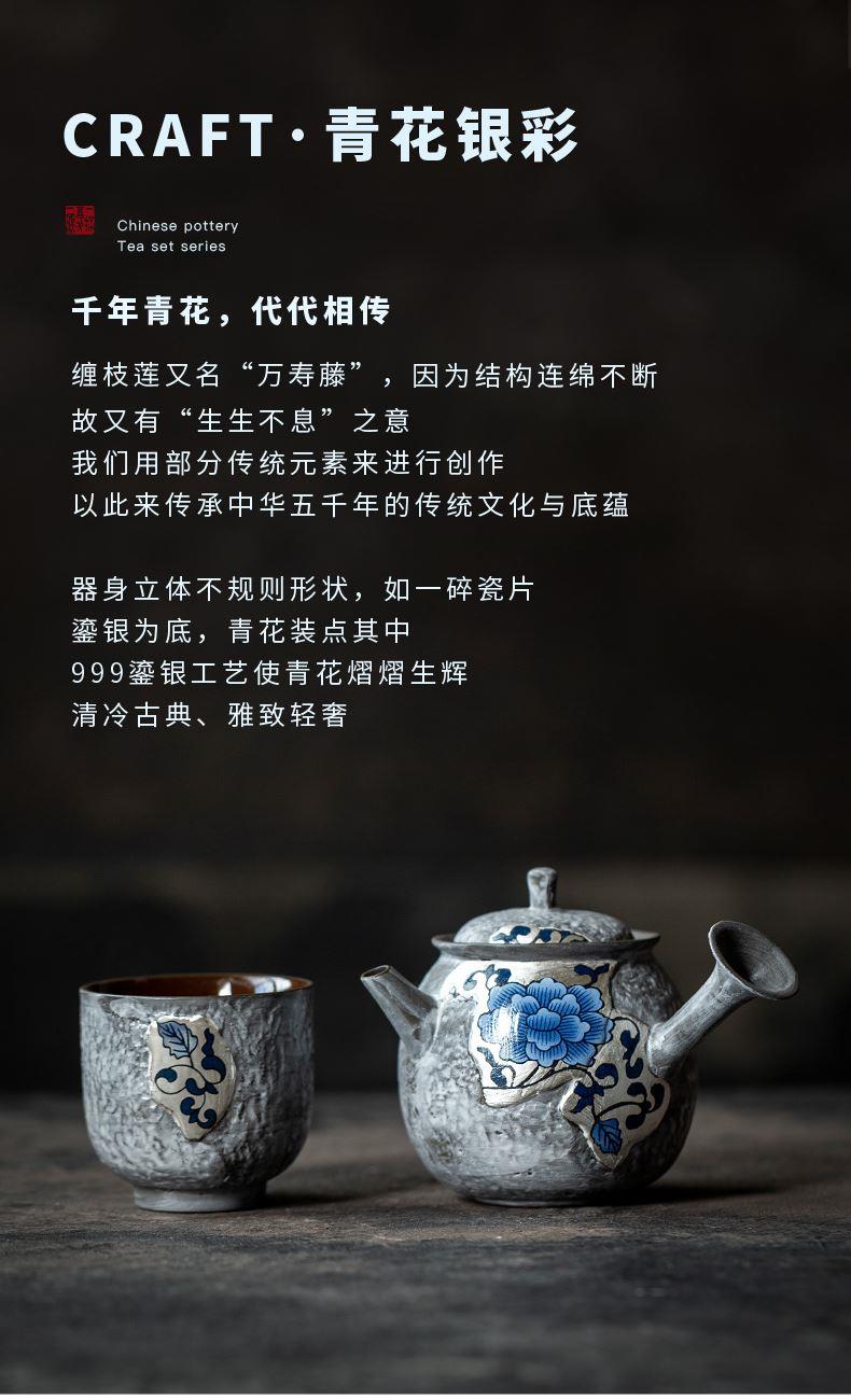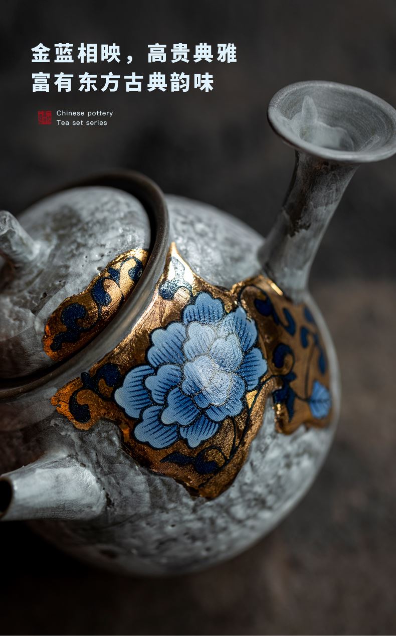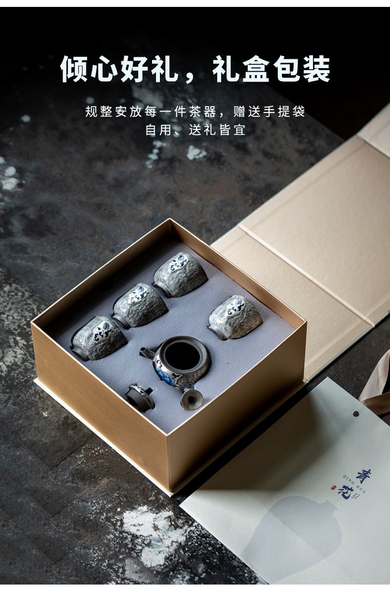 尾桥下窑粉引青花缠枝莲古典侧把壶茶具套装节日茶室商务礼品