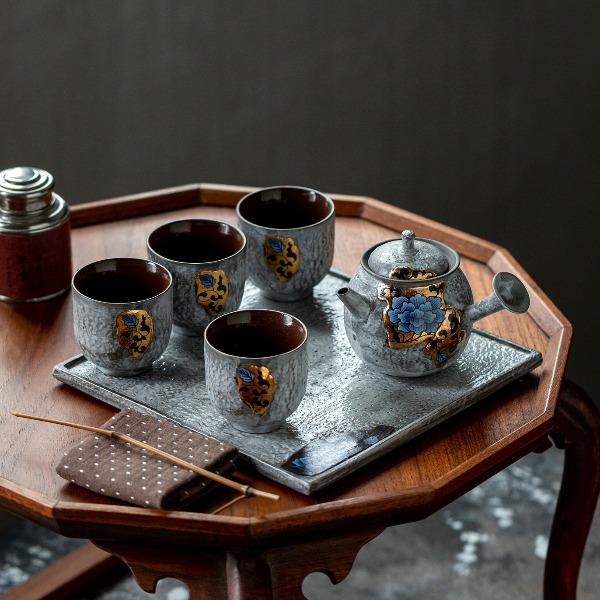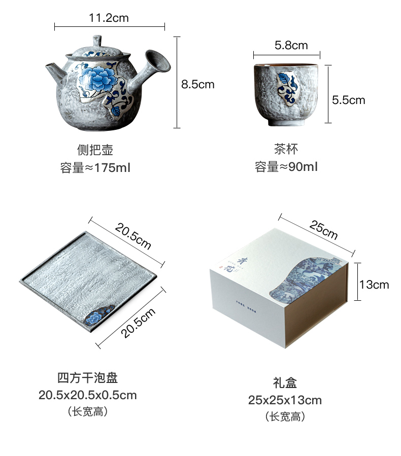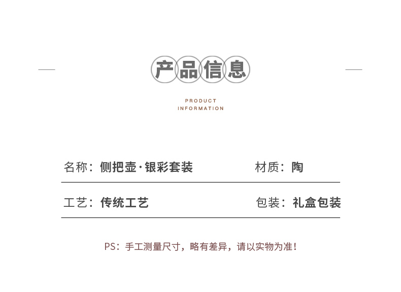 配置:侧把壶*1,茶杯*2,干泡盘*1. 颜色:鎏金/鎏银 尺寸:侧把壶11.2*8.5cm 容量175ml , 茶杯5.8*5.5cm 容量90ml, 干泡盘20.5*20.5*0.5cm。 礼盒:25*25*13cm。