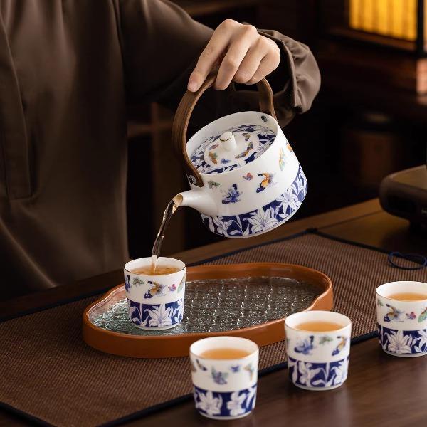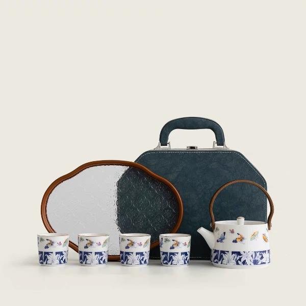 尾桥下窑青花百合蝶舞旅行茶具套装羊脂玉瓷茶具伴手礼年会礼品
