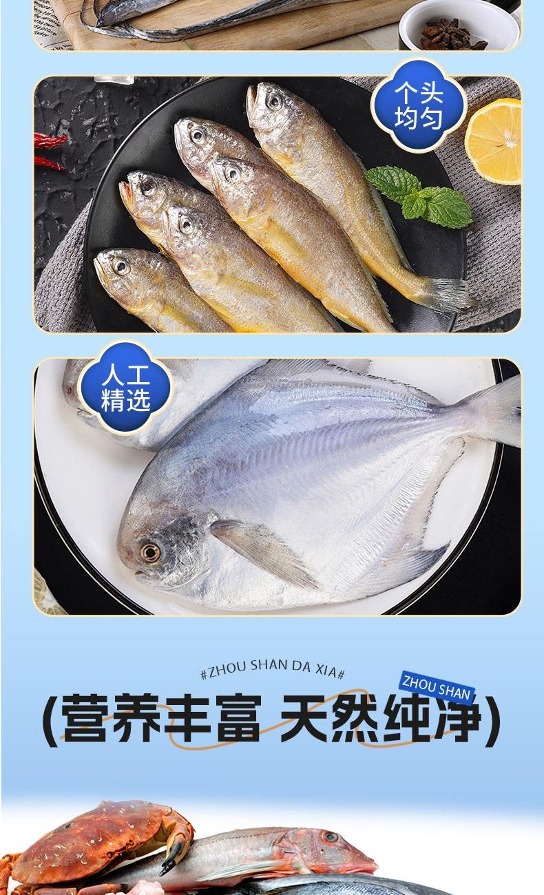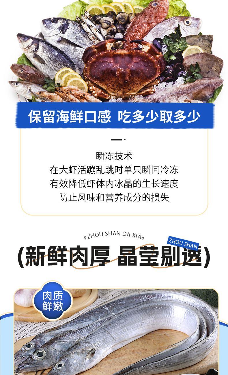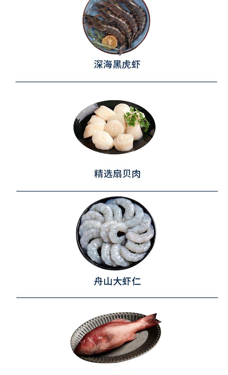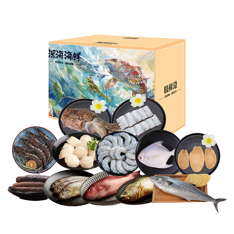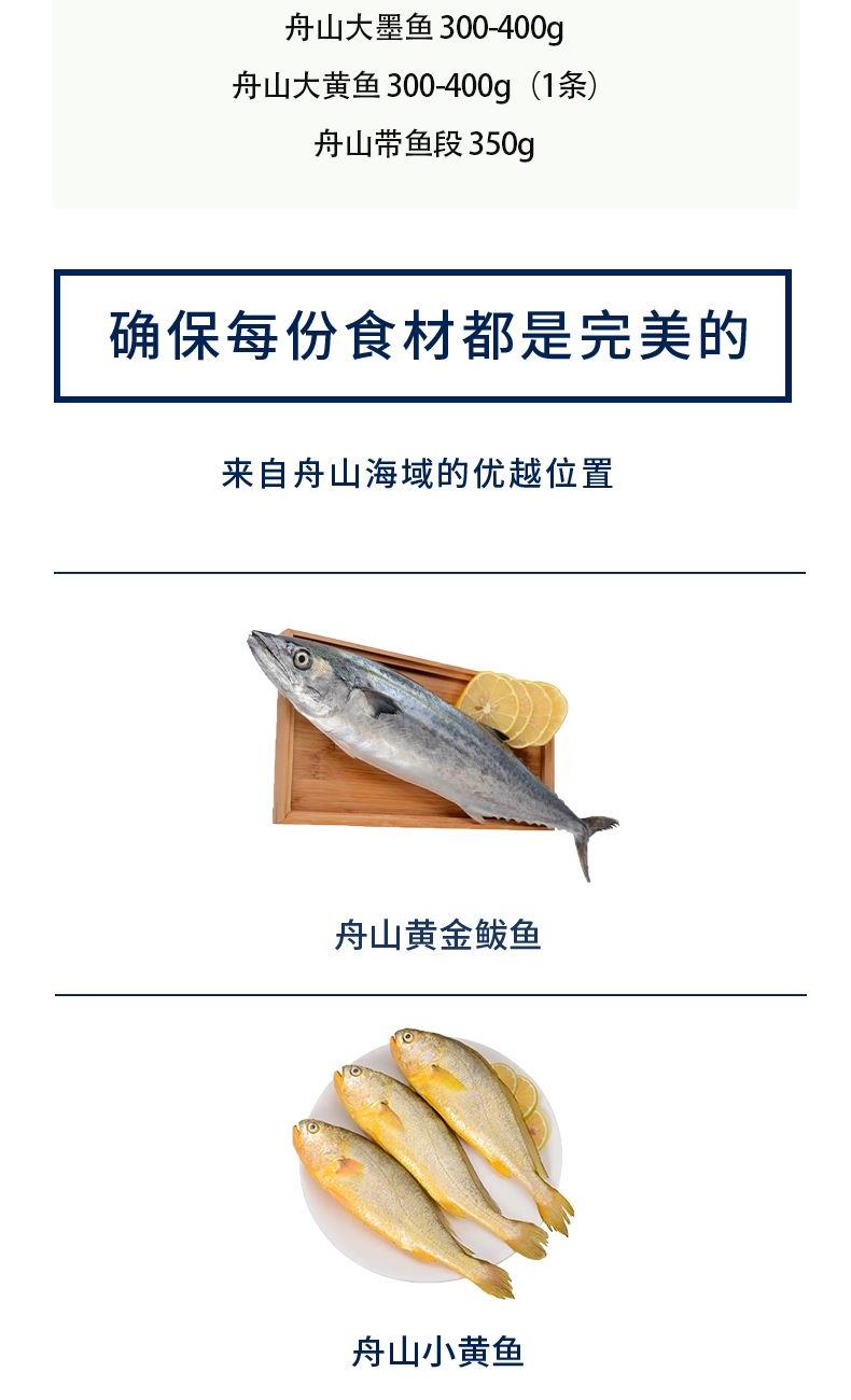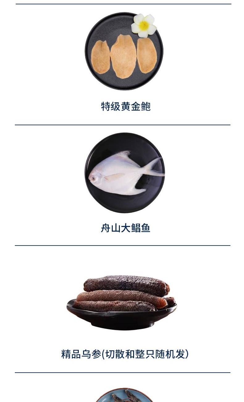产品内配:舟山黄金鲅鱼 500-700g舟山小黄鱼 400g(6-8条)特级黄金鲍 400g舟山大鲳鱼300g-400g(1条)精品乌参 300g深海黑虎虾 300g精选扇贝肉300g舟山大虾仁 300g舟山石斑鱼 300-400克舟山大墨鱼 300-400g舟山大黄鱼 300-400g(1条)舟山带鱼段 350g