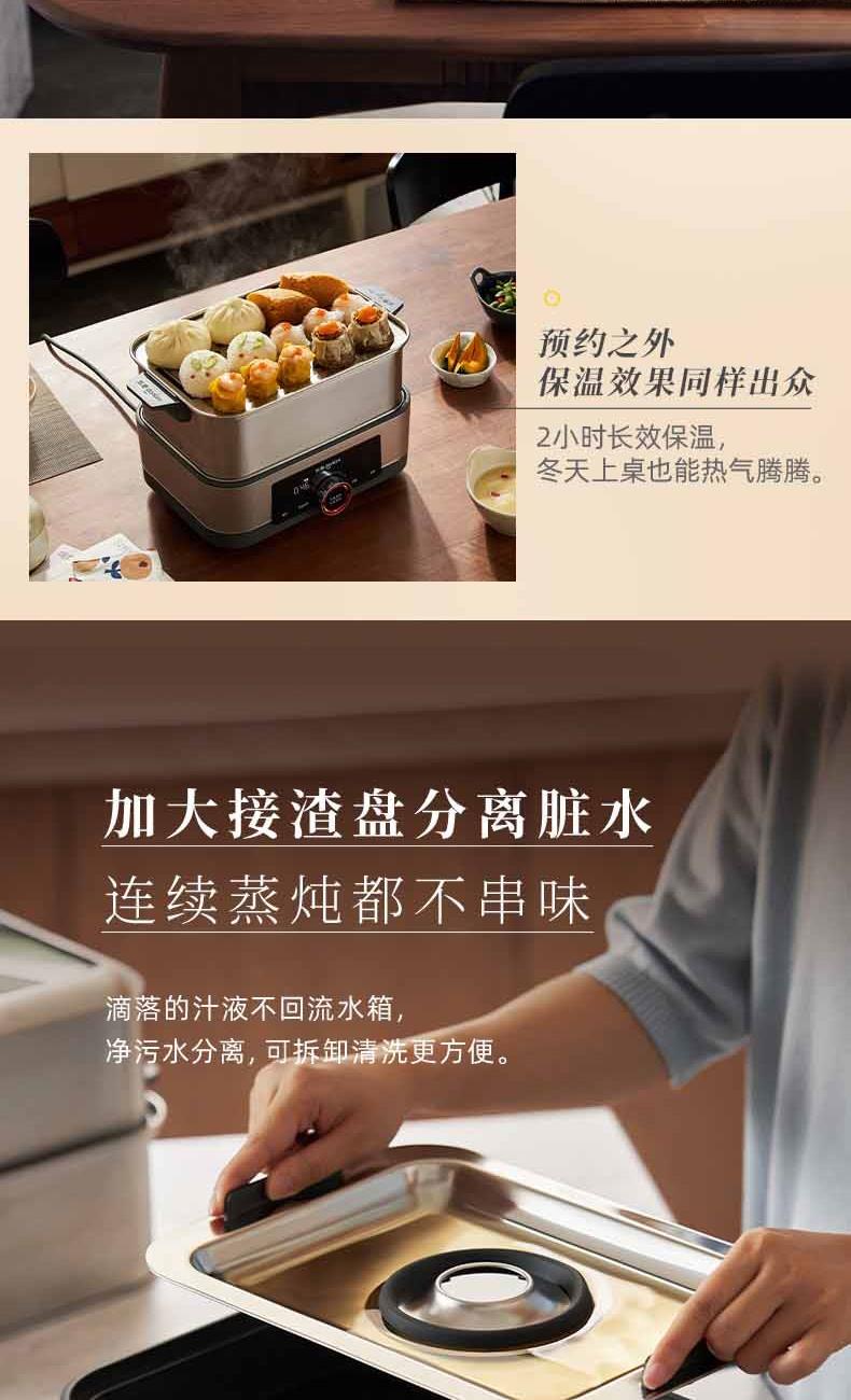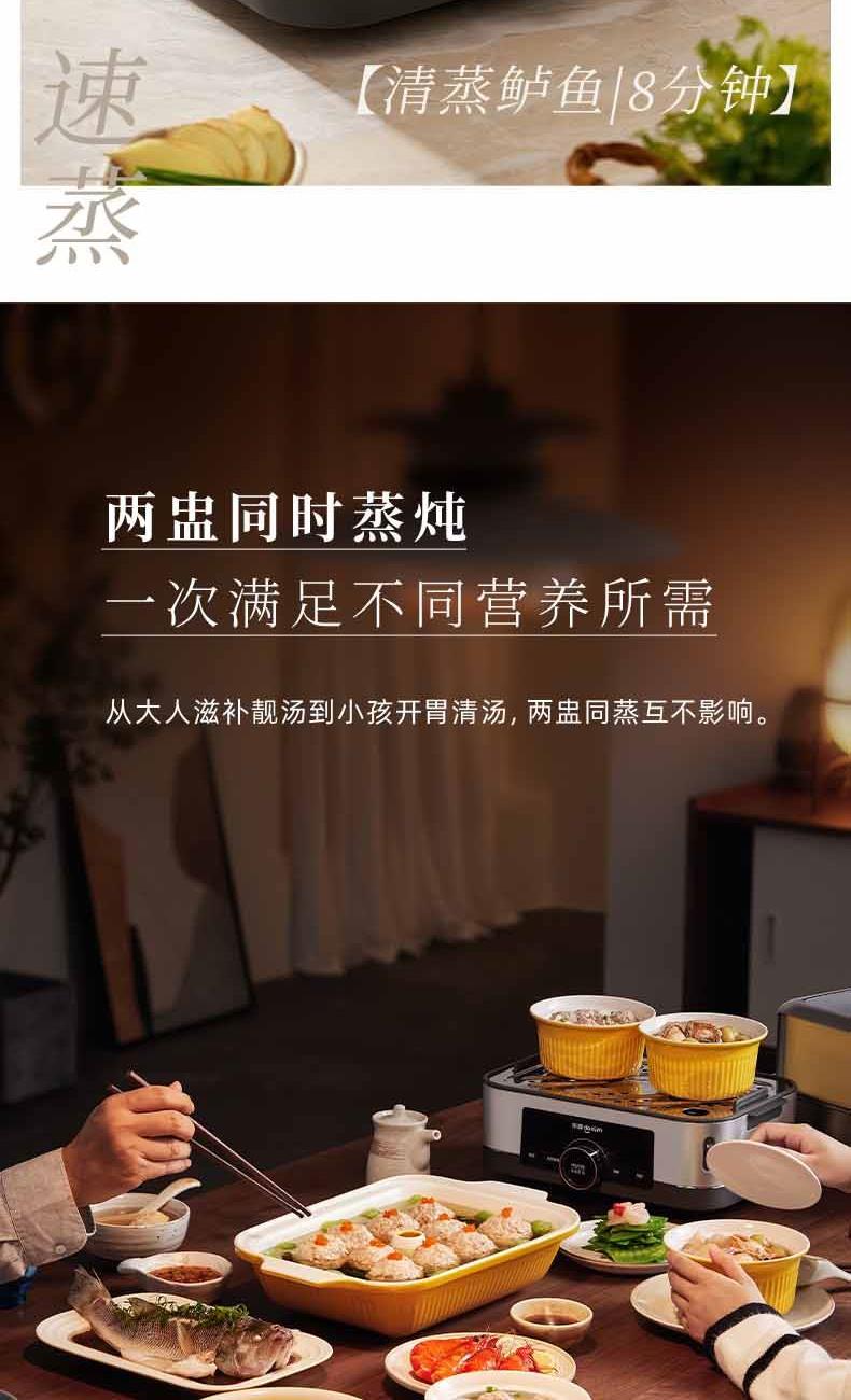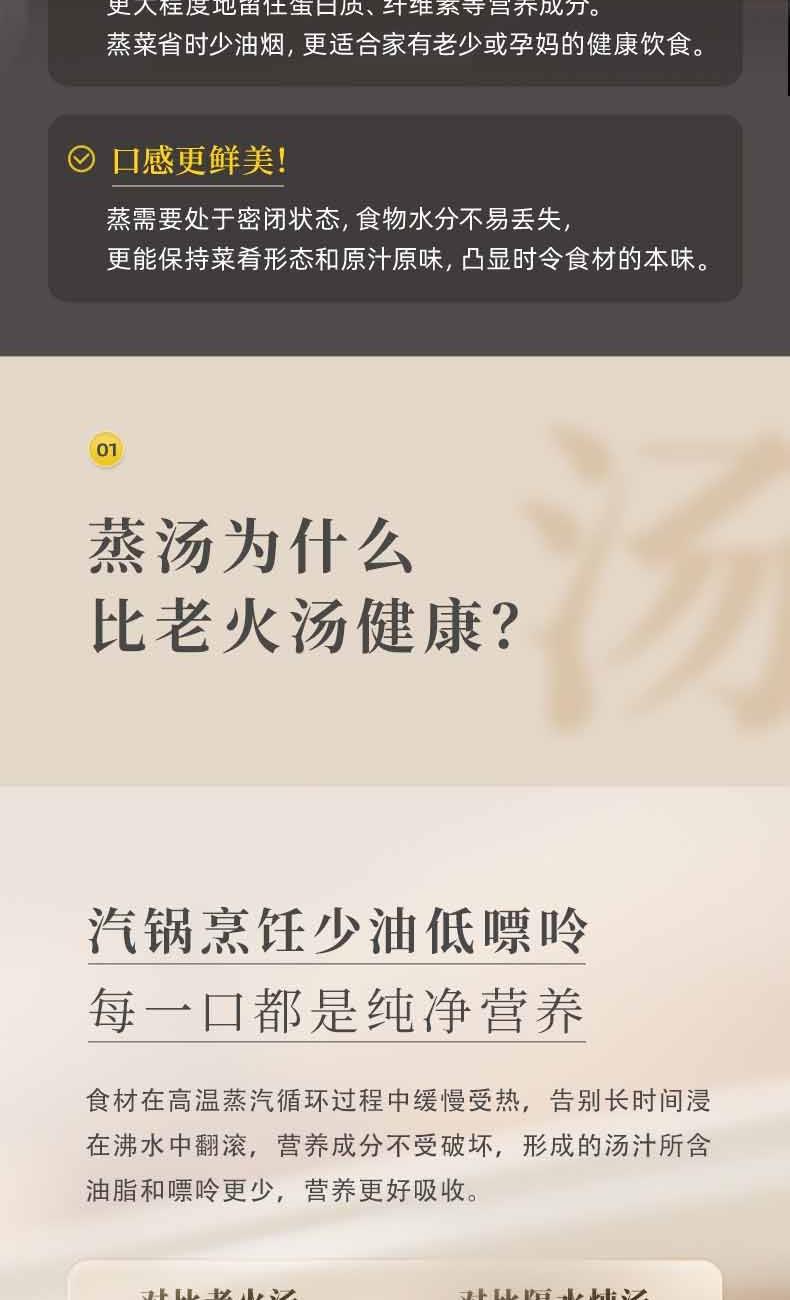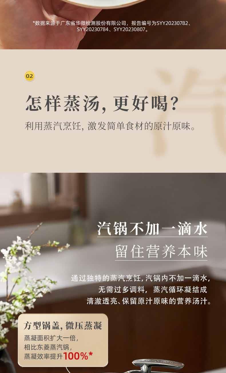 3.专 利汽锅模式,原汁原味,汤清少油低嘌呤4.速蒸/汽锅/蒸炖,百搭烹饪不闲置