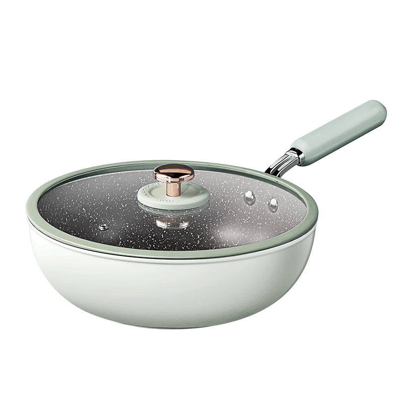 材质:铝合金、规格:28cm 产品特点: 1、厚底薄壁,节能少油烟。 2、 复合锅底不挑灶具。 3、陶瓷外壁+不粘内壁,一冲即净。