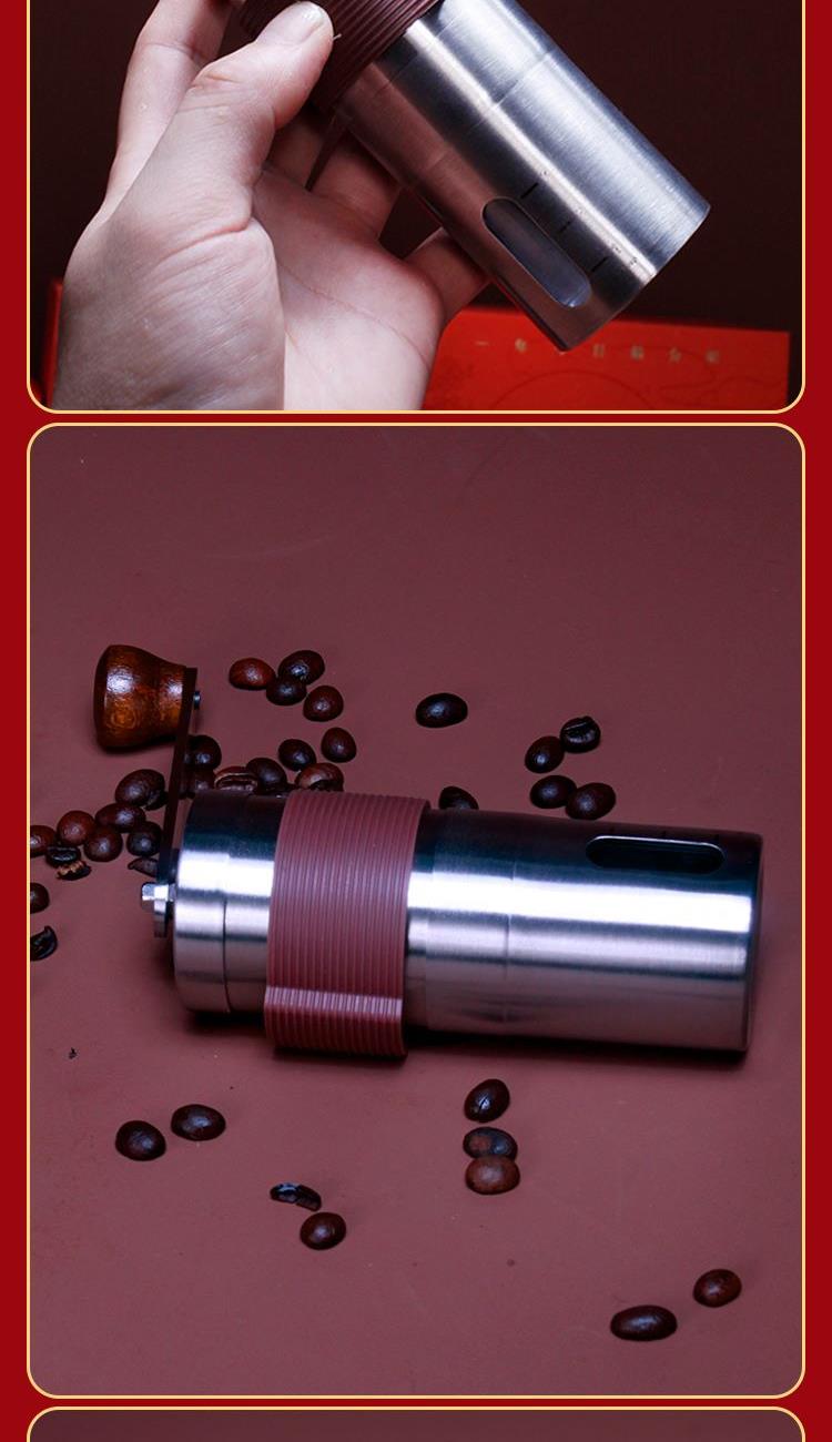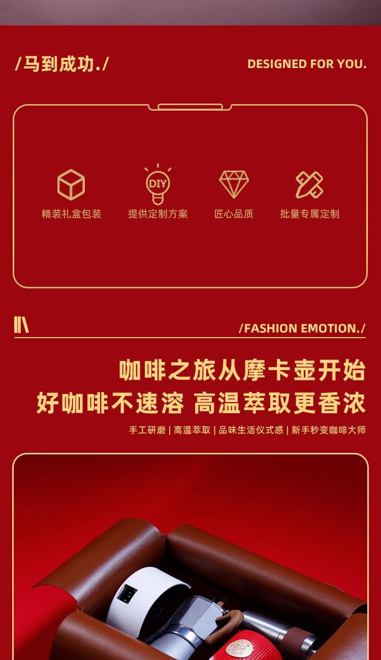 配置 手磨咖啡机*1 意式拼配咖啡豆*1袋(100克) 星空灰色摩卡壶*1 150毫升 约3杯 红色咖啡杯*1说明书*1 600w摩卡壶加热炉*1 尺寸6*14cm 皮质手提礼盒*1 材质 榉木-黑瓷机芯-骨瓷--食品级硅胶- 尺寸 礼盒:247*346*100mm 企业定制-免费/场景呈现/赠送重要人士/私人赠送/随手礼