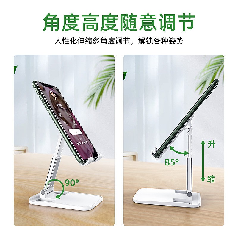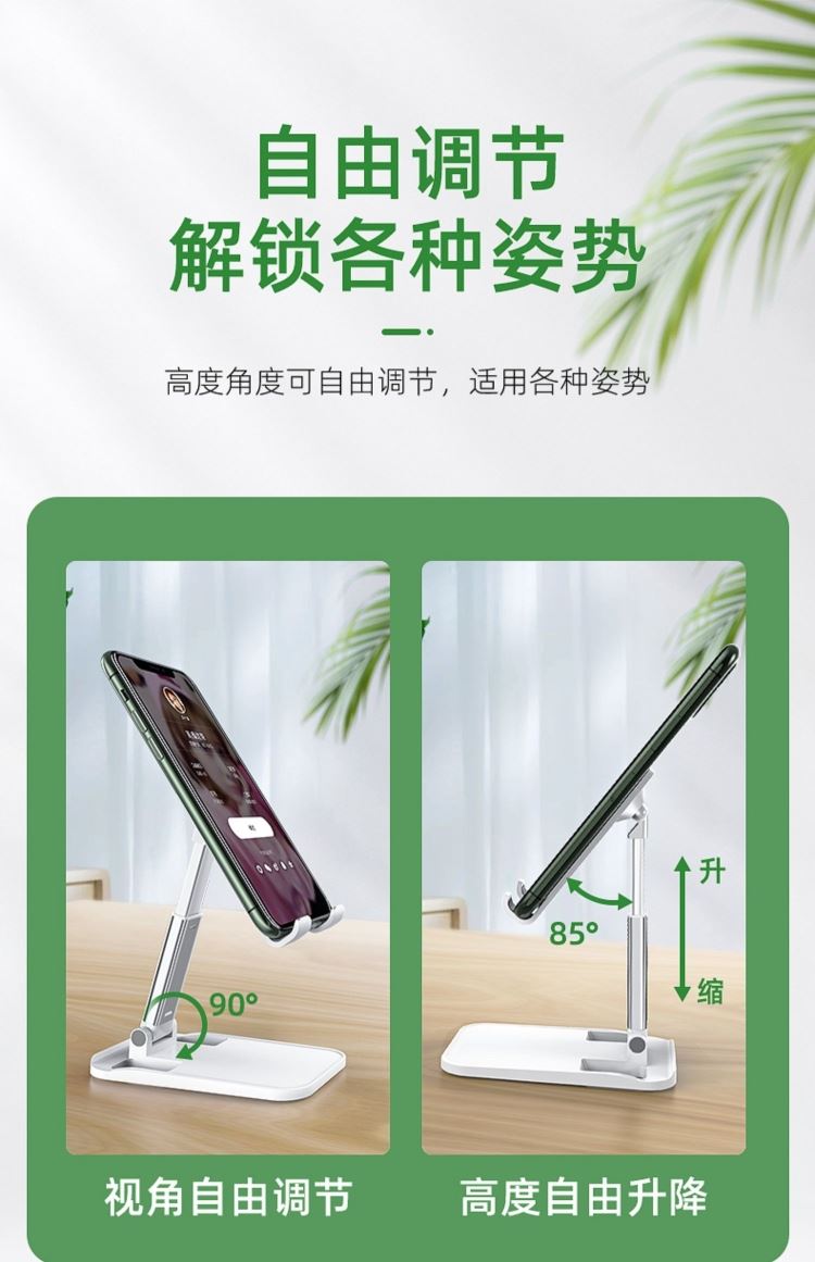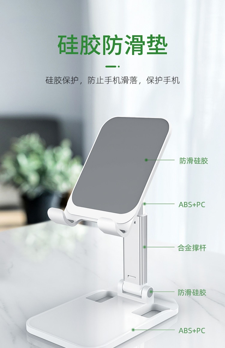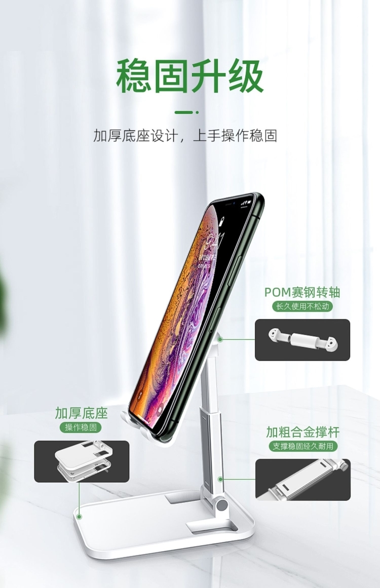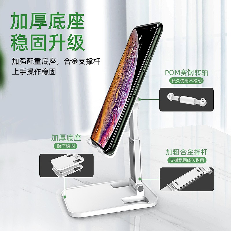 产品规格:12*7.5*12cm 材 质:合金+PC+ABS 颜 色:黑色 白色 产品净重:153g 适用机型:手机 平板电脑 产品特点 轻松收纳 生活更简单 上下72度 随意调节 稳固防滑 不易晃动 迷你小巧 便于携带 高度可升降 多角度调节固定