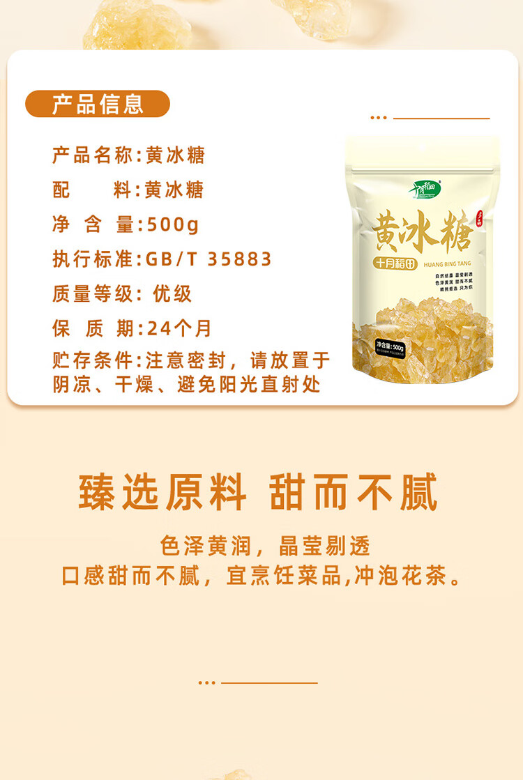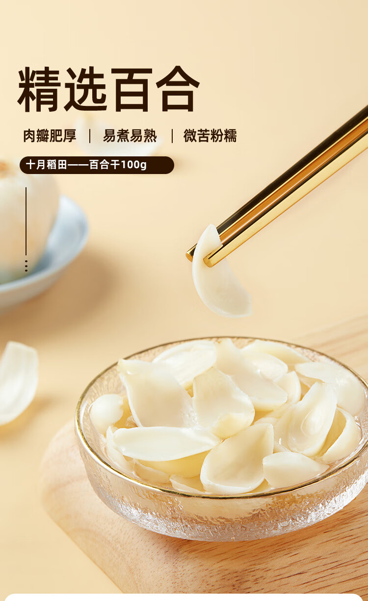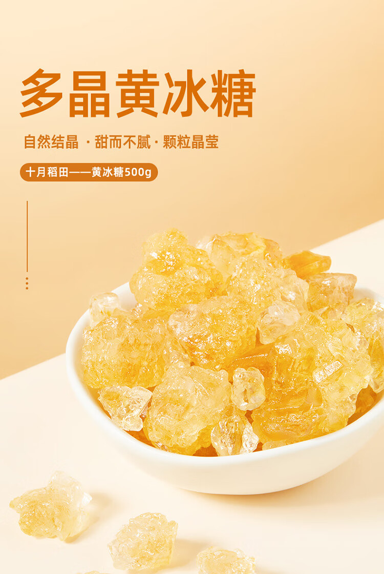 十月稻田 黄冰糖百合干组合 规格:黄冰糖500g+百合干100g 保质期:12个月 多晶黄冰糖,自然结晶,甜而不腻,颗粒晶莹。精选龙山百合,内瓣肥厚,易煮易熟,微苦粉糯,自然微黄,拒绝熏硫。 备注:冰糖税率13% 百合税率9%,按单品开票