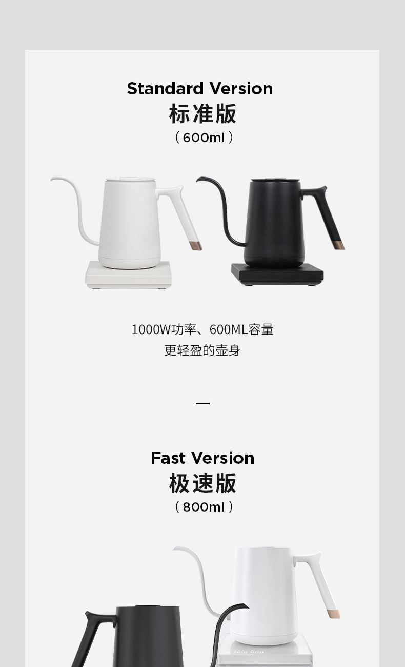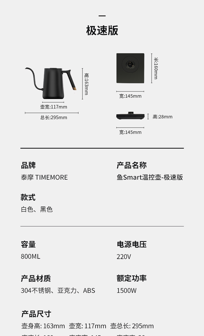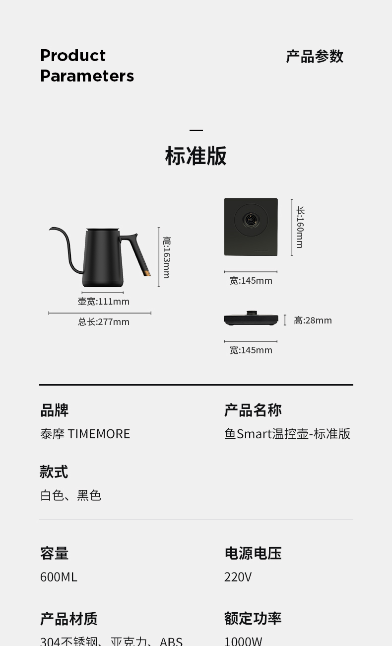 容量:600ML 产品材质:304不锈钢、亚克力、ABS 电源电压:220V 额定功率:1000W 产品尺寸 壶身高: 163mm壶宽:111mm 壶总长:277mm底座长:160mm 底座宽:145mm 底座高:28mm 优雅的细嘴设计,90度垂直水流操控,英国STRIX温控器,温度,干烧自动断电;新型滑动式调温,随心设定目标温度;搭配平衡手柄,顺畅注水无负担。
