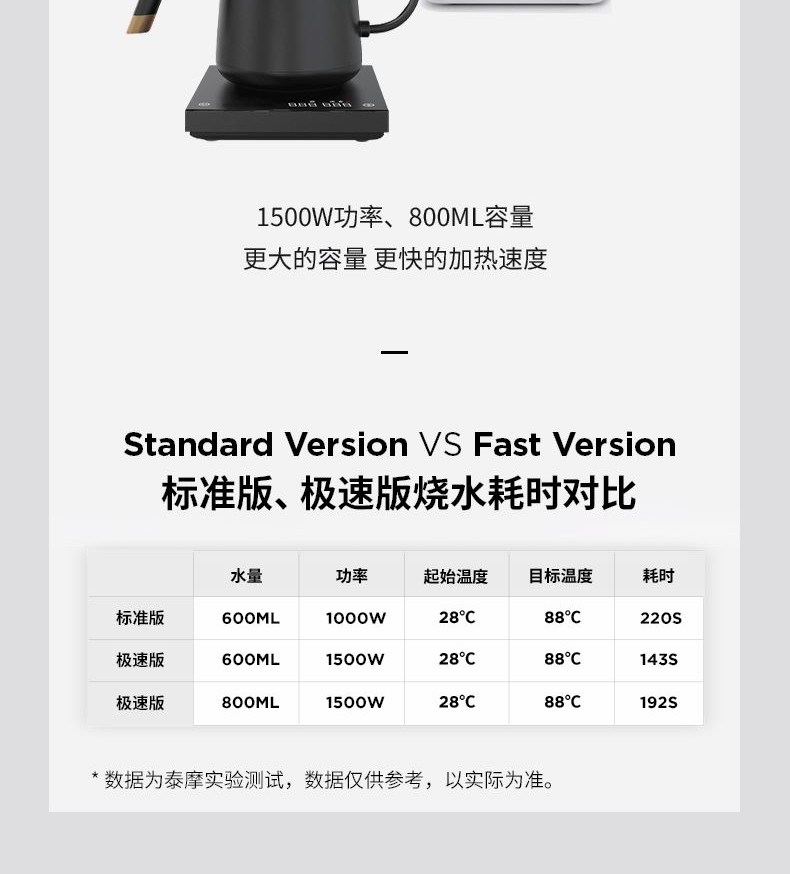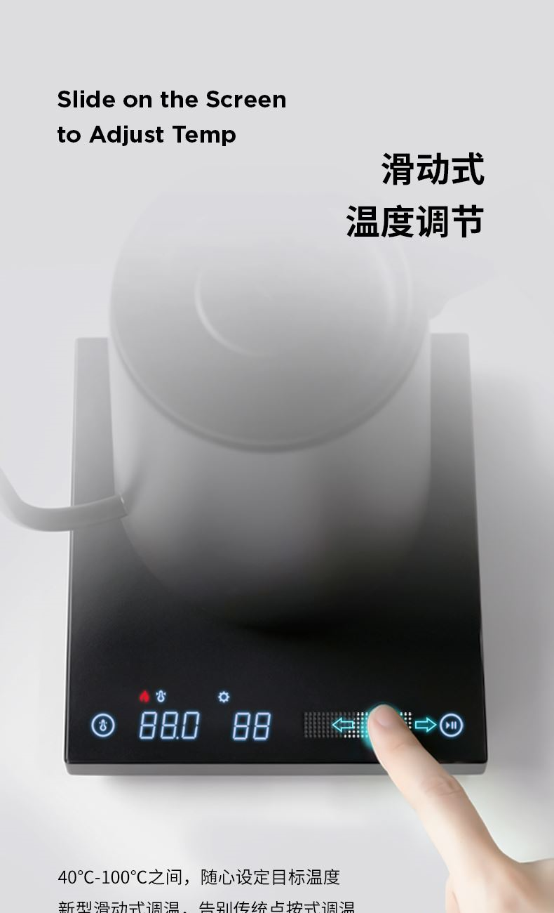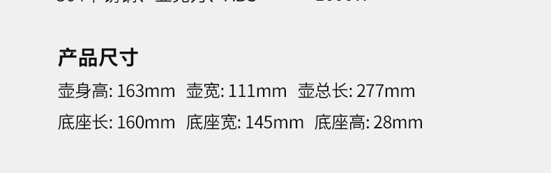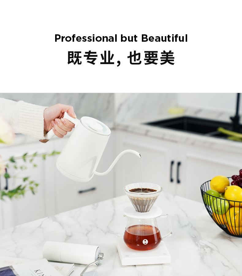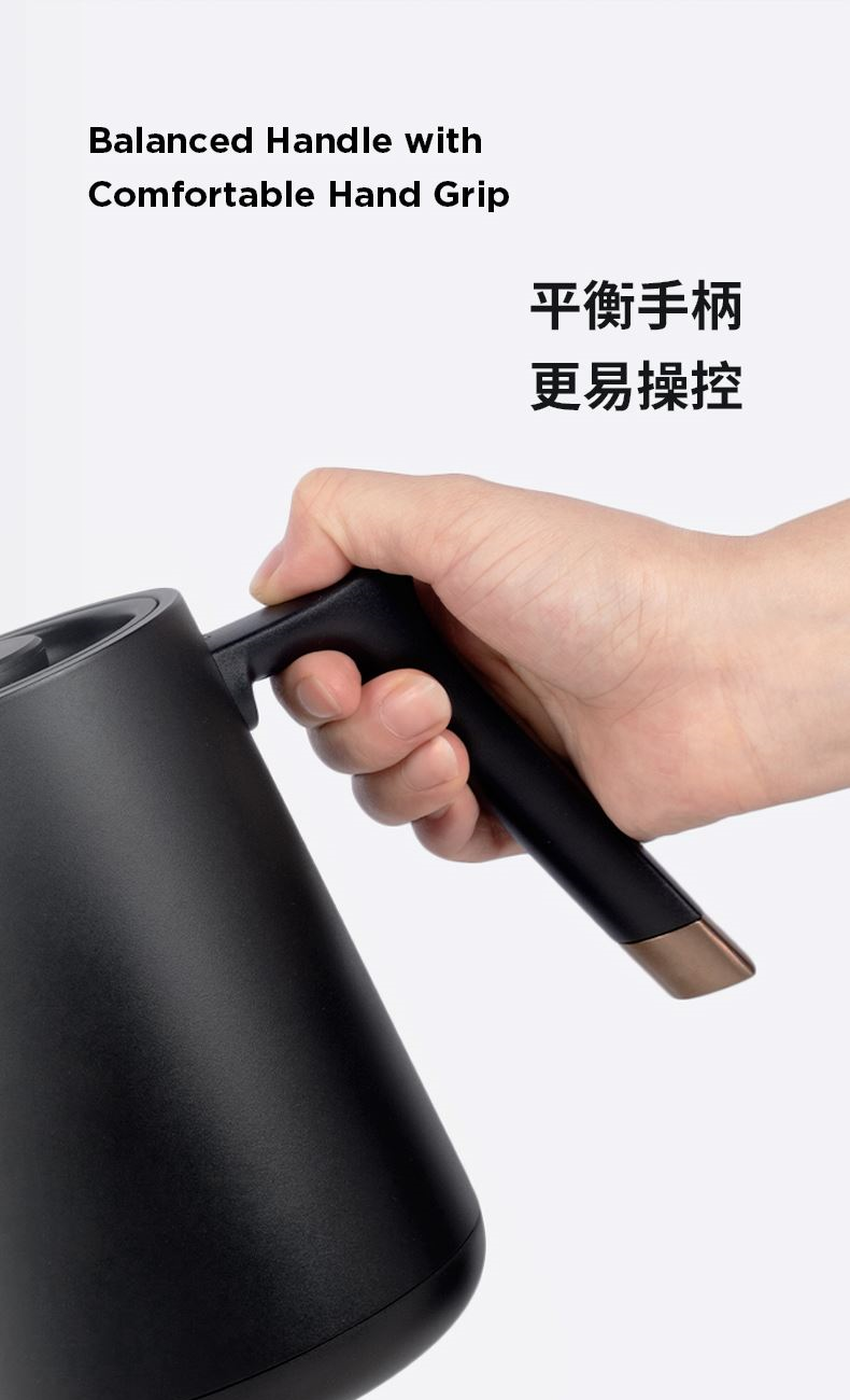容量:600ML 产品材质:304不锈钢、亚克力、ABS 电源电压:220V 额定功率:1000W 产品尺寸 壶身高: 163mm壶宽:111mm 壶总长:277mm底座长:160mm 底座宽:145mm 底座高:28mm 优雅的细嘴设计,90度垂直水流操控,英国STRIX温控器,温度,干烧自动断电;新型滑动式调温,随心设定目标温度;搭配平衡手柄,顺畅注水无负担。