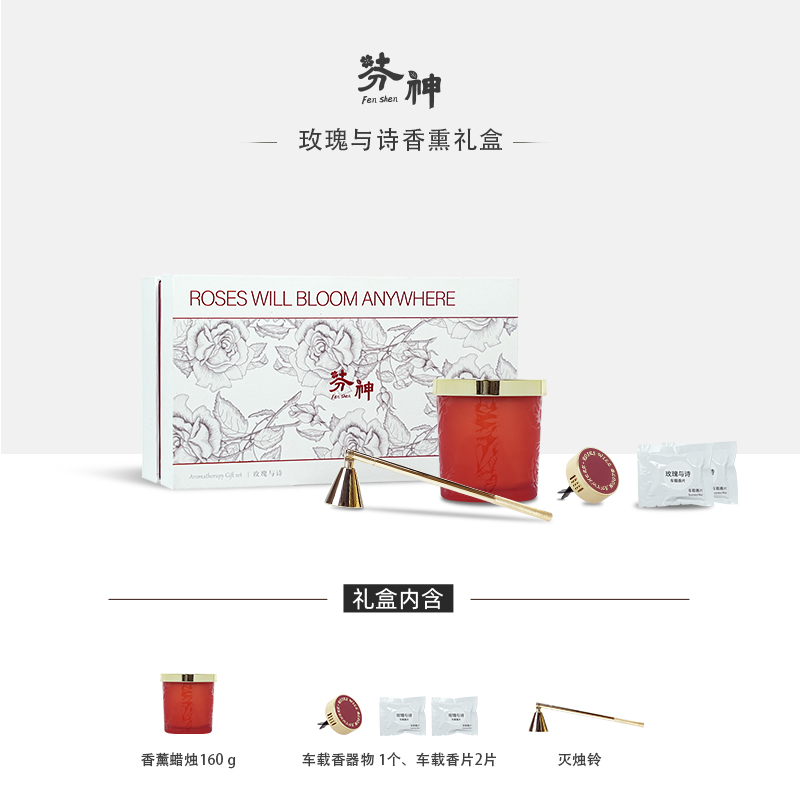产品规格:香薰蜡烛160g,车载香片2片 礼盒尺寸:26.5 x 18 x 9.5 cm 香味:丝玫乌木 前调:玫瑰、丁香 中调:广藿香、藏红花 后调:愈创木、麝香