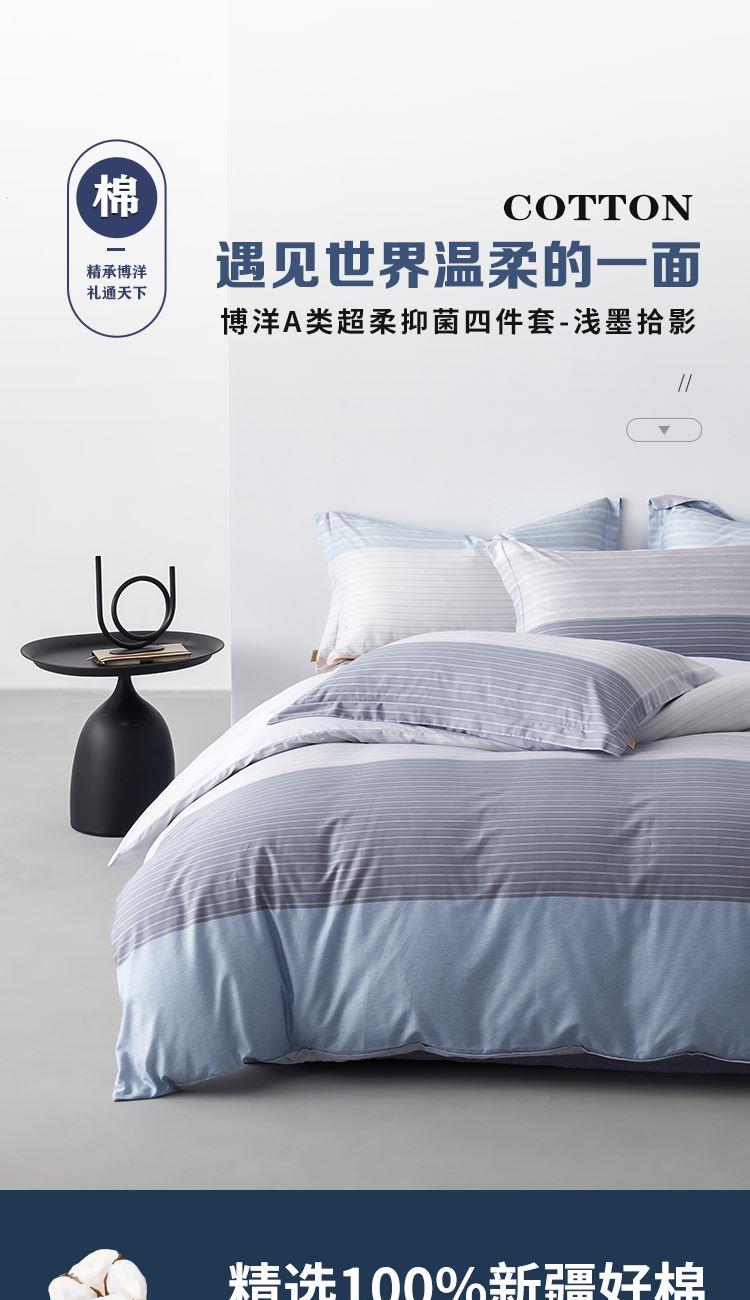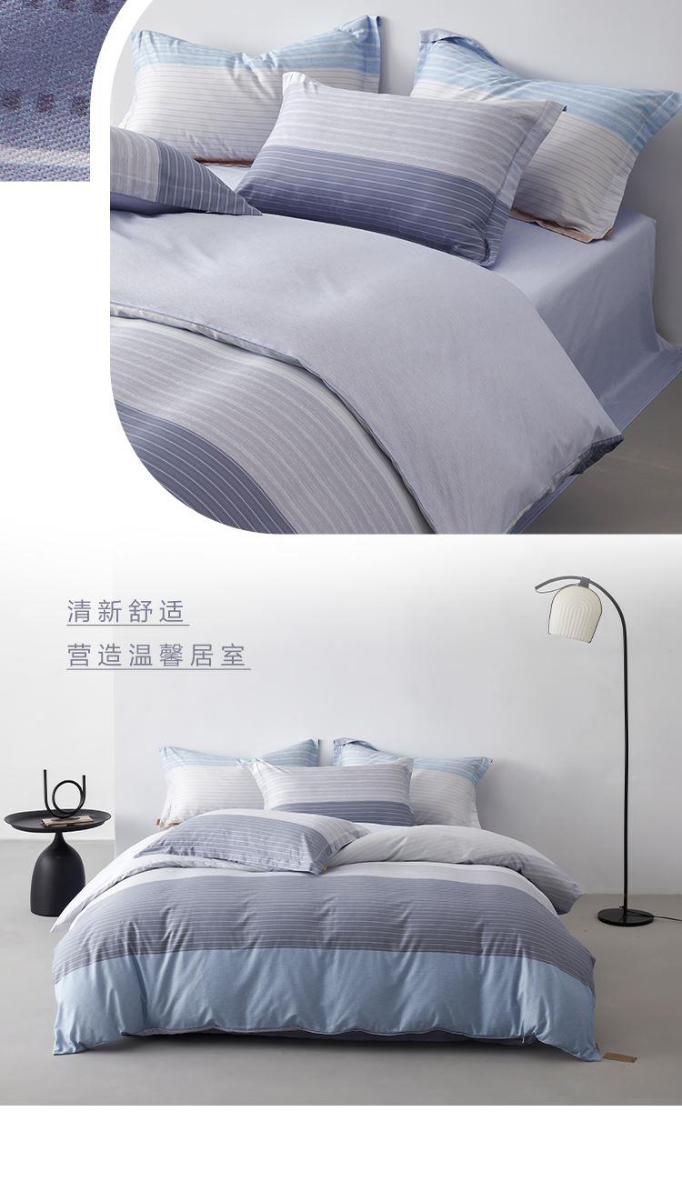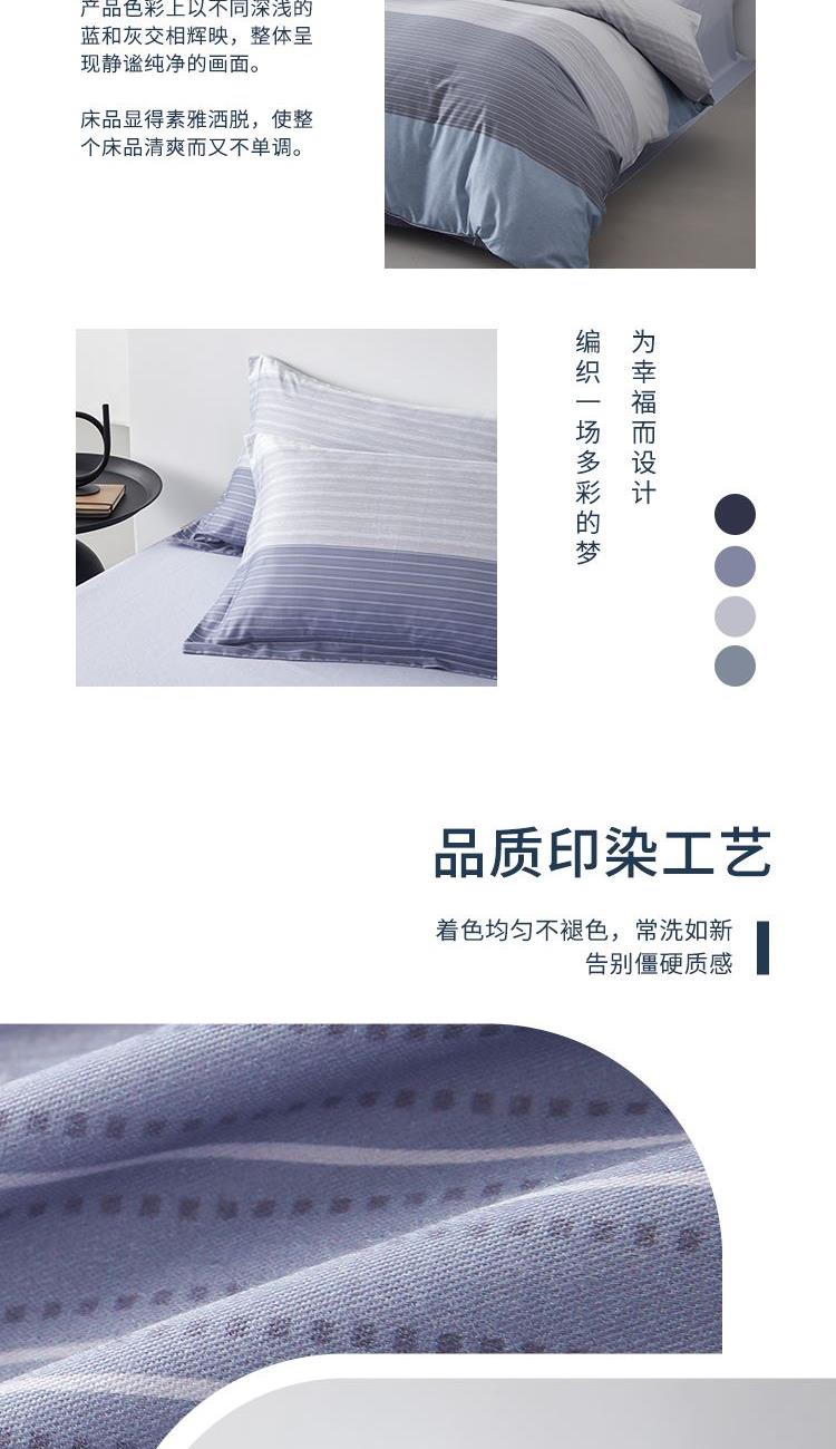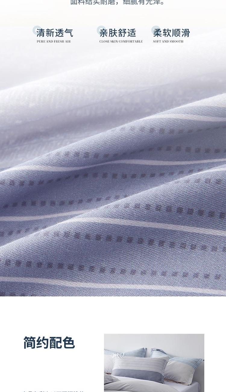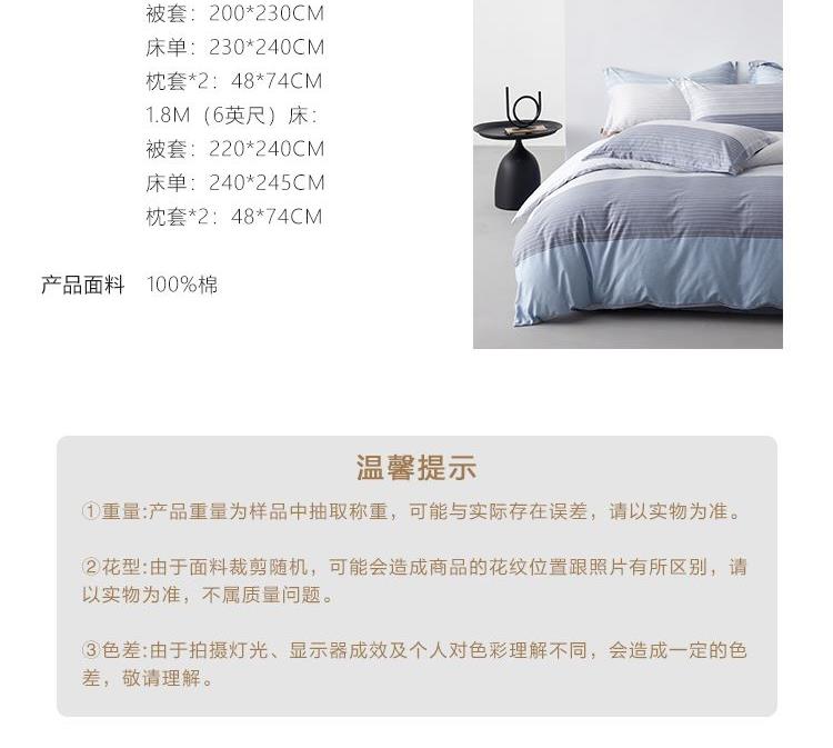 产品规格:1.5m床: 被套:200*230cm 床单:230*240cm 枕套*2:48*74cm 产品材质:棉 1、本品采用高密全棉面料,面料更柔软轻盈,触感温润,贴合肌肤透气性好。精湛印染工艺,色牢度高,床品不易褪色不易起球。 2、产品色彩上以不同深浅的蓝和灰交相辉映,整体呈现静谧纯净的画面,床品显得素雅洒脱,使整个床品清爽而又不单调。 3、全棉面料机洗方便,解放双手,久洗如新。