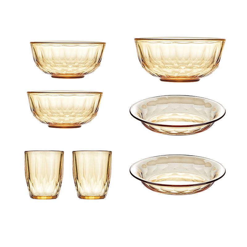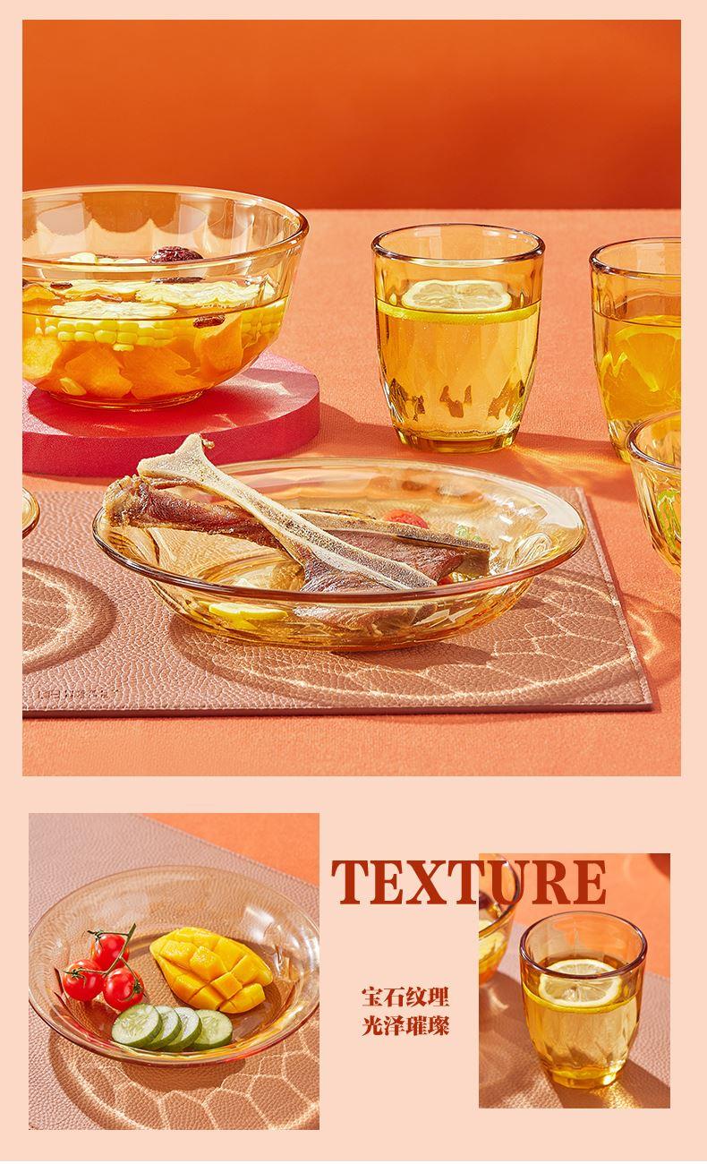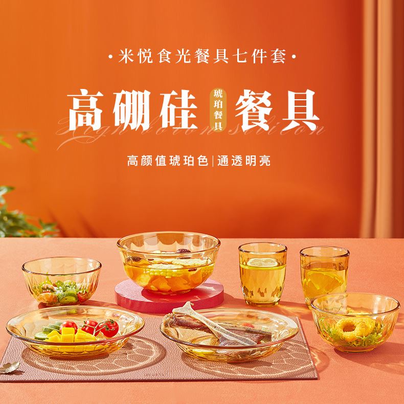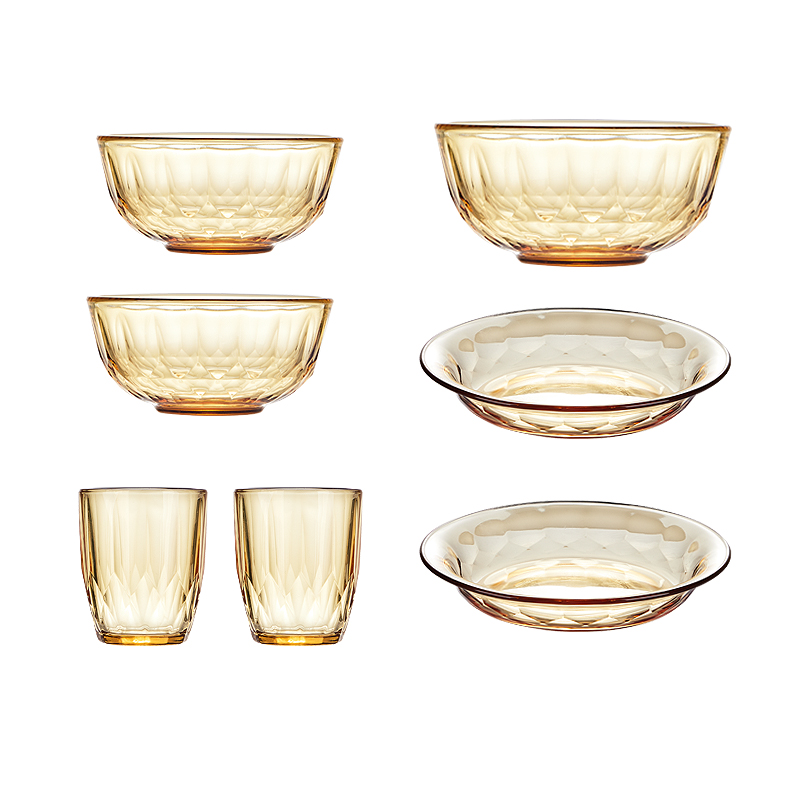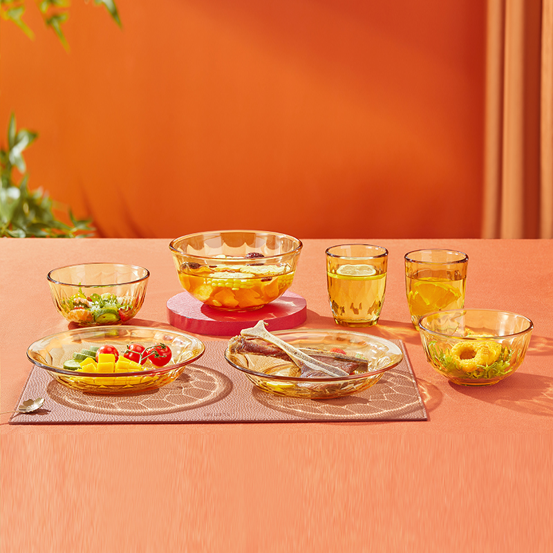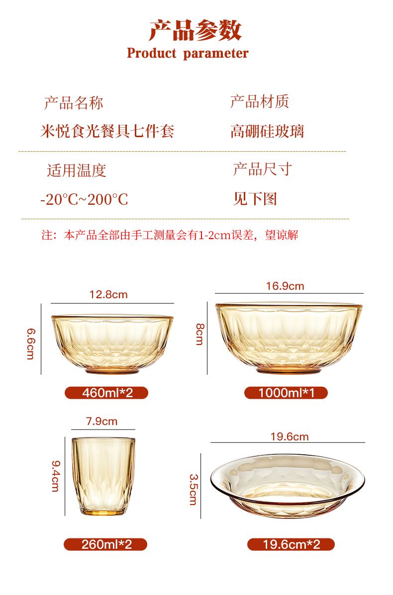 产品规格:小碗460ml*2、 盘196mm*2、杯260ml*2、大碗1000ml*1 产品材质:高硼硅玻璃 -20°C-200°C 彩盒尺寸:415*90*343mm 外箱尺寸:56.4*42.9*35.9cm 外箱毛重:18kg 产品特点: 1.产品采用高硼色料玻璃材质,颜色与生俱来,永不退色。烤箱、微波炉、冰箱冷冻放心使用。2.星境高硼餐具设计理念,用线条勾勒几何切面,以面为境折射时光、徜徉星空。3.触感温润,为您的餐桌增添一抹高雅。