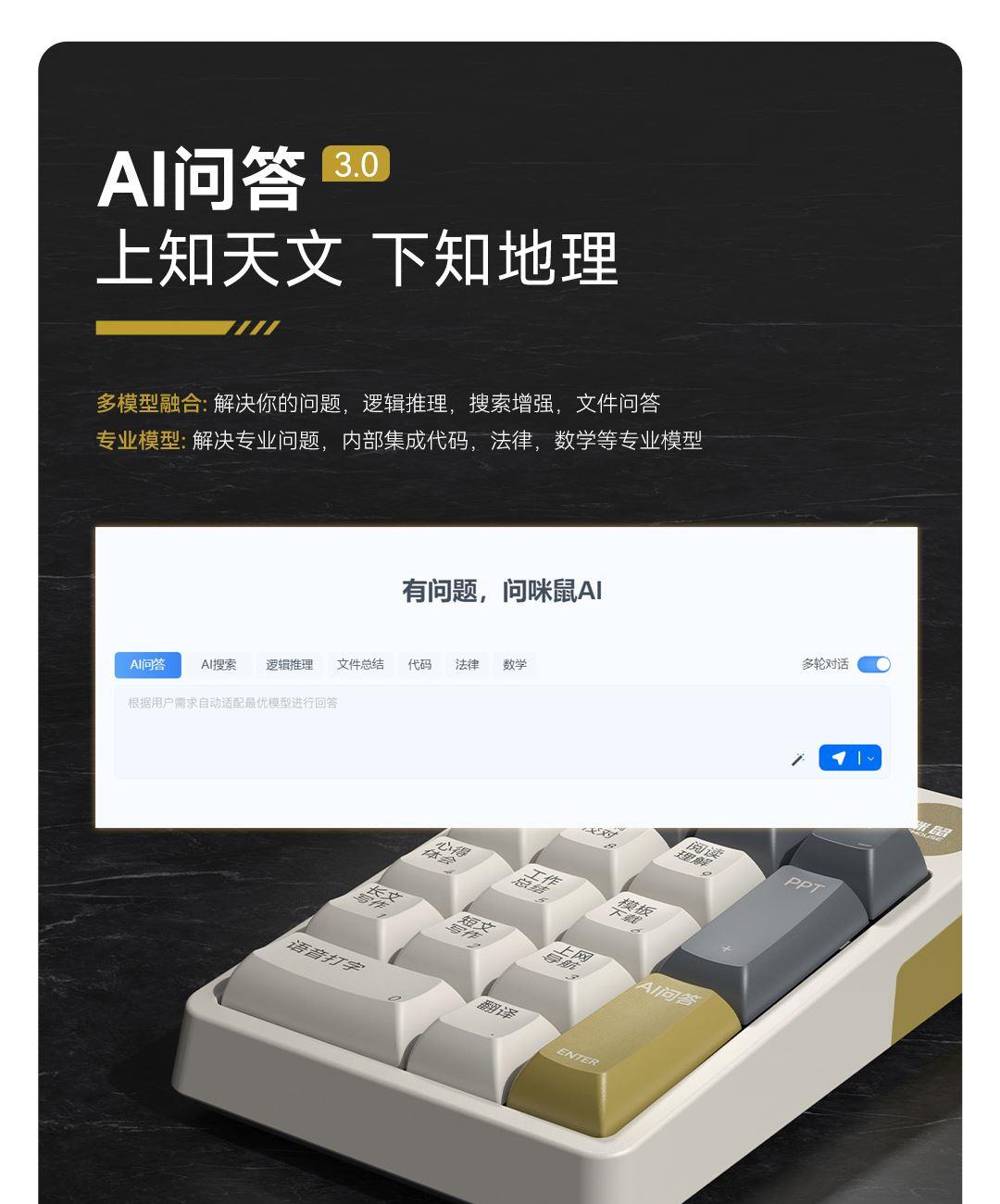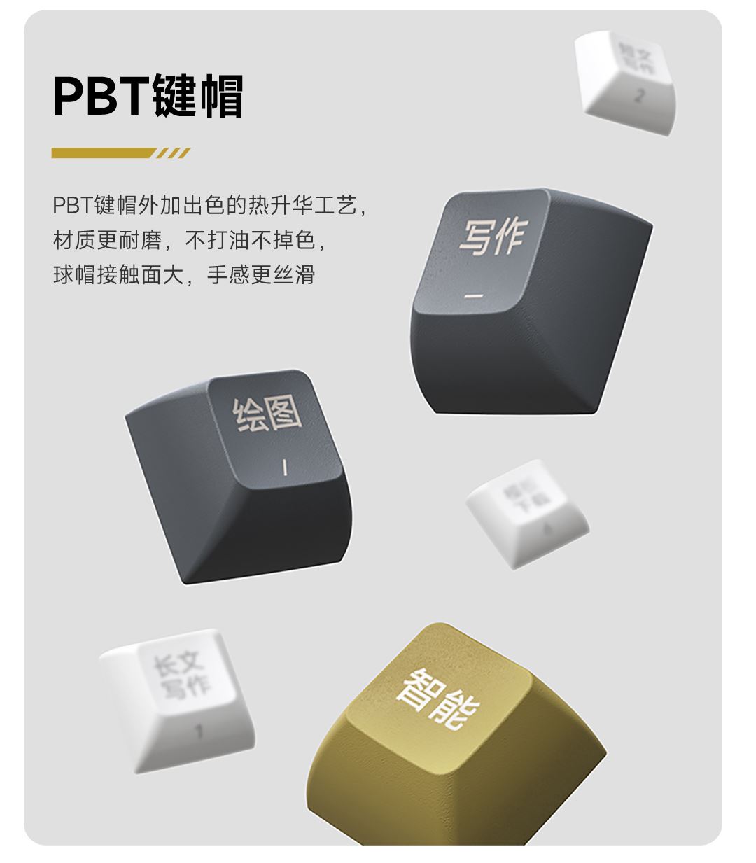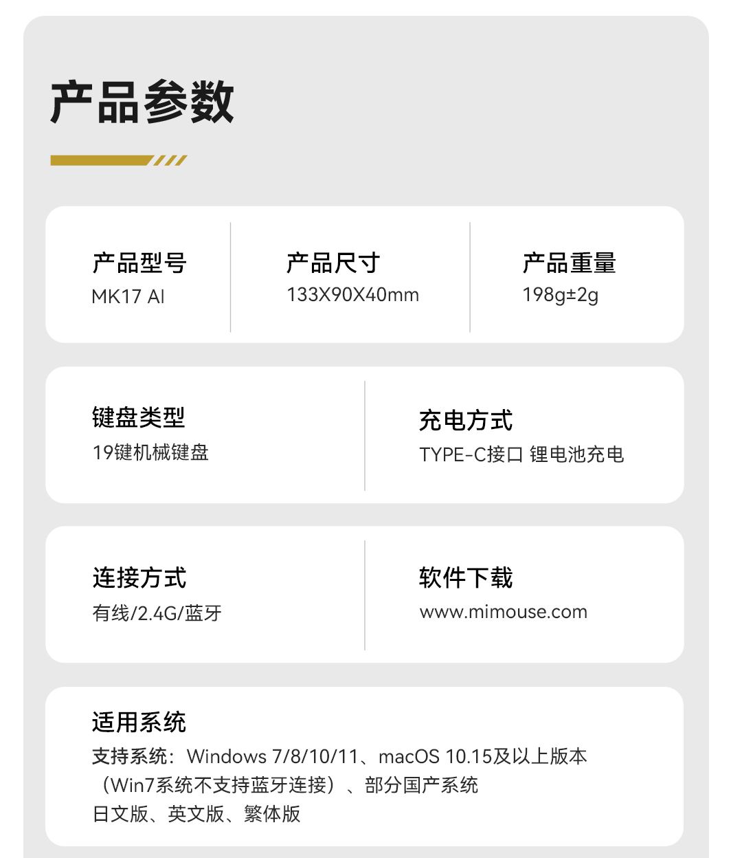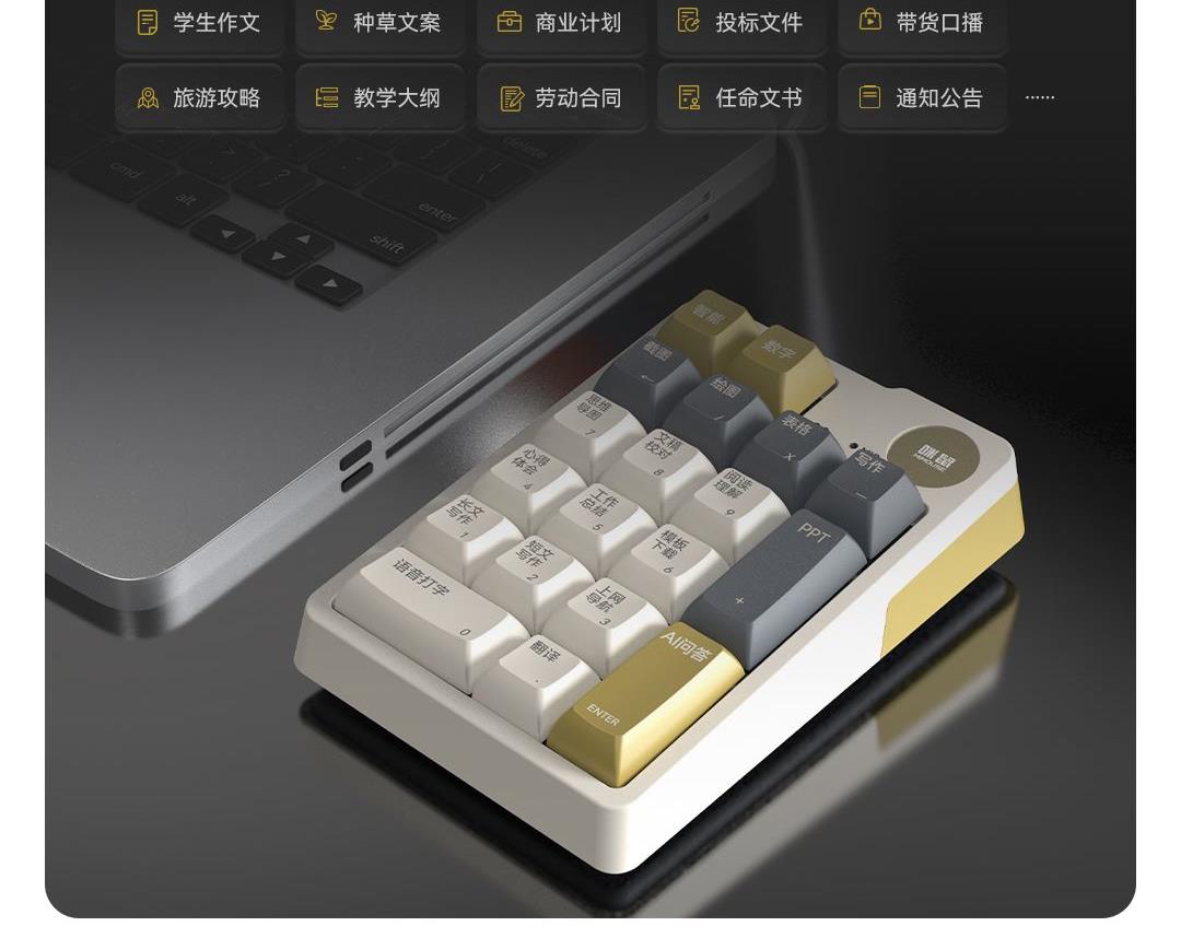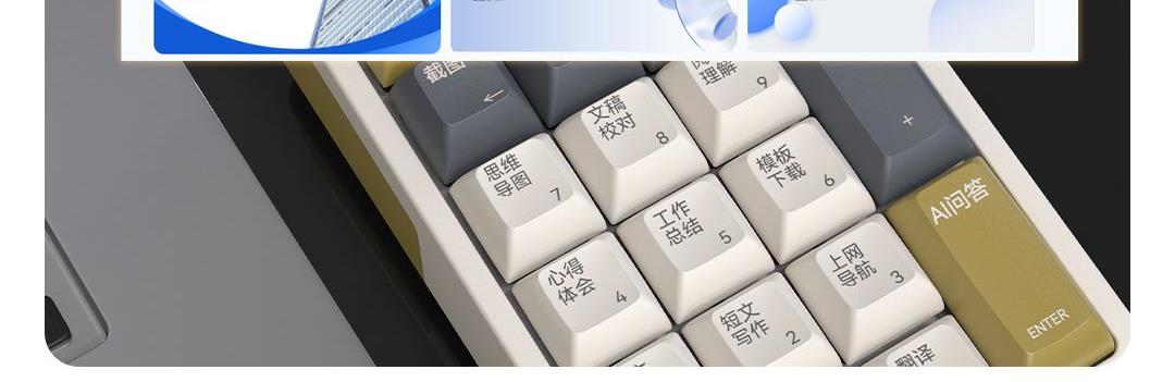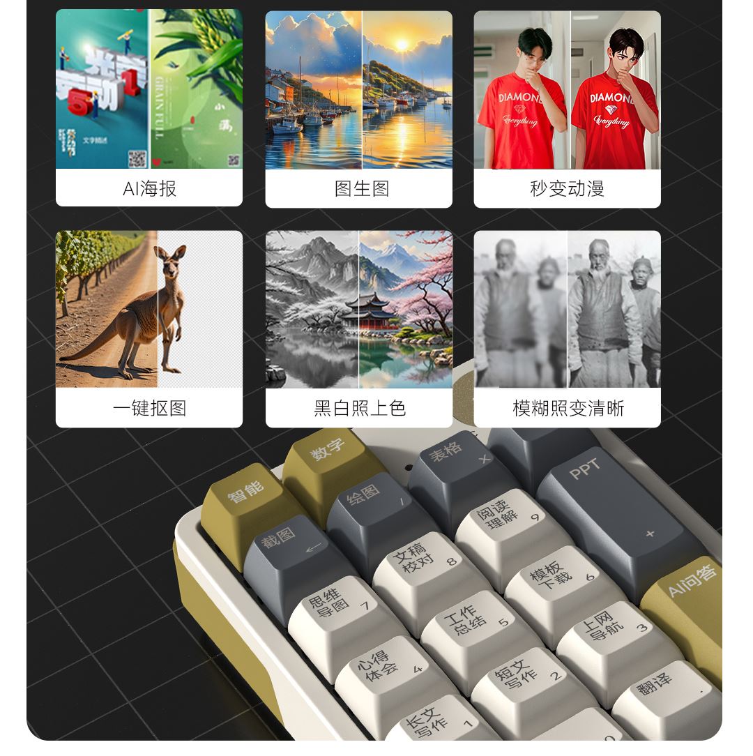 1.材质:ABS 2.搭载AI大模型:搭载9款 AI大模型 3.同时连接设备数量:3台 4.连接方式:无线2.4G 蓝牙 5.兼容系统:兼容多系统 6.按键数:≤60键 7. 供电方式:充电电池 8.电池容量650Ah 1.搭载Deepseek-R1模型6大通用模型+3大专业模型 2.AI问答 3.0 上知天文 下知地理 3.AI写作 3.0写有用的文章 4.AI PPT 3.0 做专业的PPT 5.AI绘图3.0绘专业的图片 6.AI智能体 3.0 解决专业问题更轻松 7.AI 3.0表格做全面的表格 8.AI 3.0 表格做全面的表格 9.语音打字3.0 一分钟400字 10.语音打字3.0 一分钟400字 11.AI截图 3.0一键截图提取 轻松编辑 12.双模更便利 13. 多系统兼容
