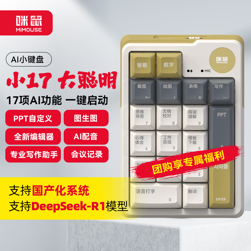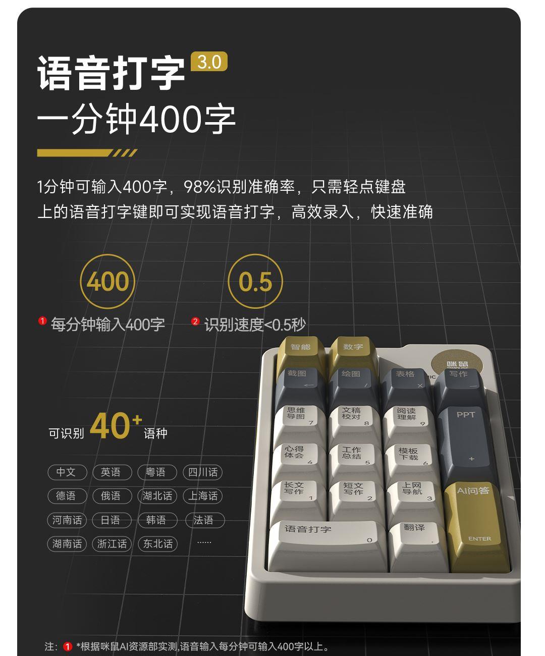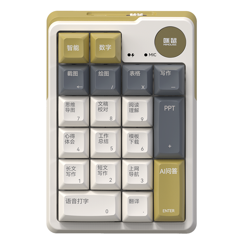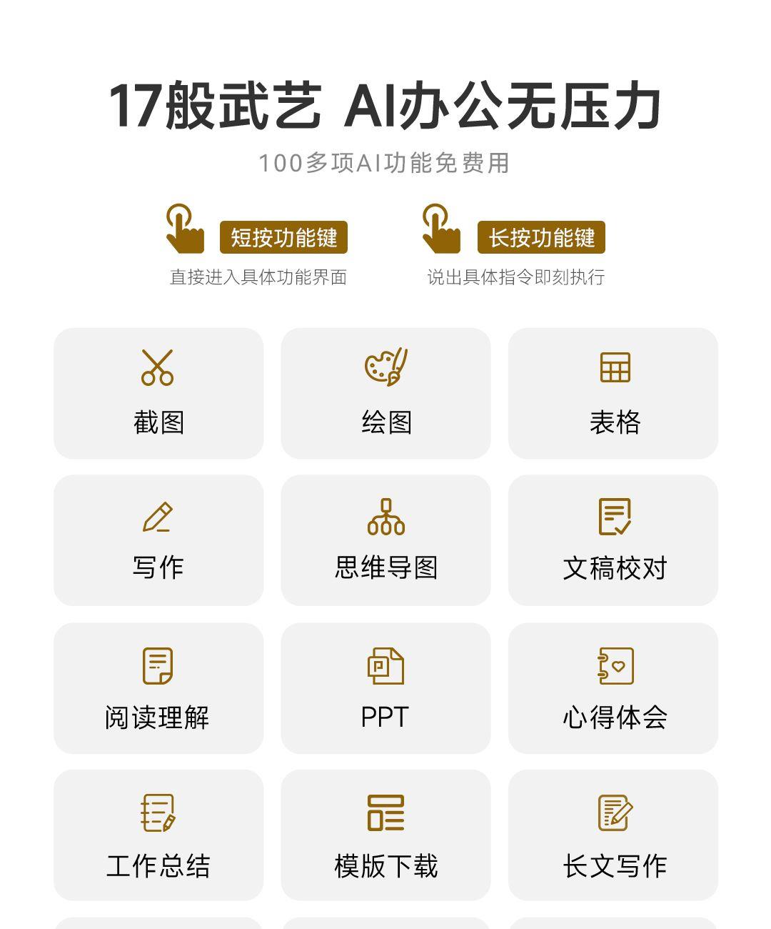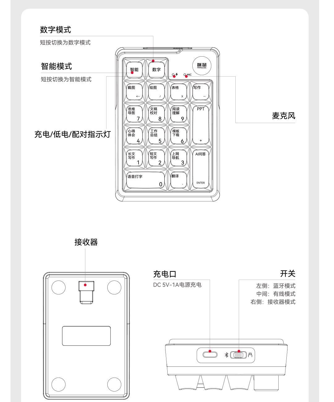1.材质:ABS 2.搭载AI大模型:搭载9款 AI大模型 3.同时连接设备数量:3台 4.连接方式:无线2.4G 蓝牙 5.兼容系统:兼容多系统 6.按键数:≤60键 7. 供电方式:充电电池 8.电池容量650Ah 1.搭载Deepseek-R1模型6大通用模型+3大专业模型 2.AI问答 3.0 上知天文 下知地理 3.AI写作 3.0写有用的文章 4.AI PPT 3.0 做专业的PPT 5.AI绘图3.0绘专业的图片 6.AI智能体 3.0 解决专业问题更轻松 7.AI 3.0表格做全面的表格 8.AI 3.0 表格做全面的表格 9.语音打字3.0 一分钟400字 10.语音打字3.0 一分钟400字 11.AI截图 3.0一键截图提取 轻松编辑 12.双模更便利 13. 多系统兼容