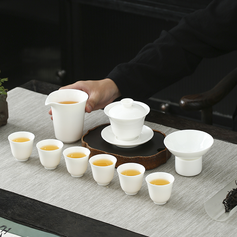 配置规格:品茗杯*6 公道杯*1 盖碗*1 茶漏*1皮包*1 产品材质:羊脂玉 礼盒尺寸:8.7cm*13.6cm*26.5cm 产品尺寸:茶漏:9.5cm*6.5cm 盖碗:10.2cm*9cm容量160ml 品茗杯:5.1cm*4.8cm容量50ml 公道杯:9cm*9.4cm容量230ml
