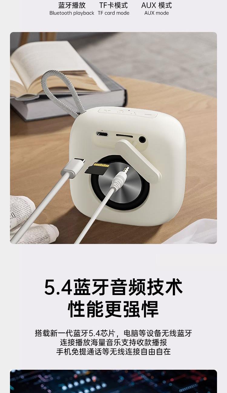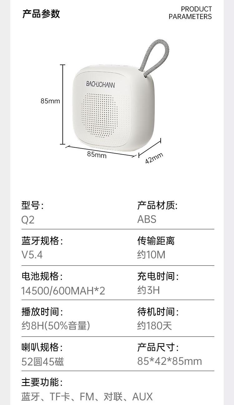 技术参数 型号:Q2 产品材质:ABS 主要功能:蓝牙、TF卡、FM、对联、AUX 蓝牙规格:V5.4 传输距离:≤10M 电池规格:14500/600MAH*2 充电时间:约3H 播放时间:约8H(50%音量) 待机时间:约180天 喇叭规格:52圆45磁 功放规格:3欧5瓦 产品尺寸:85*42*85MM 产品净重:约221G 颜色:珍珠白、雅致灰 功能特点 ◆蓝牙5.4技术,全面兼容手机、平板等数码产品 ◆持久续航,TWS互联技术,一机双连,打造家庭影院 ◆便携轻巧,轻松操控,时尚外观 ◆硅胶按键,反应灵敏,手感舒适
