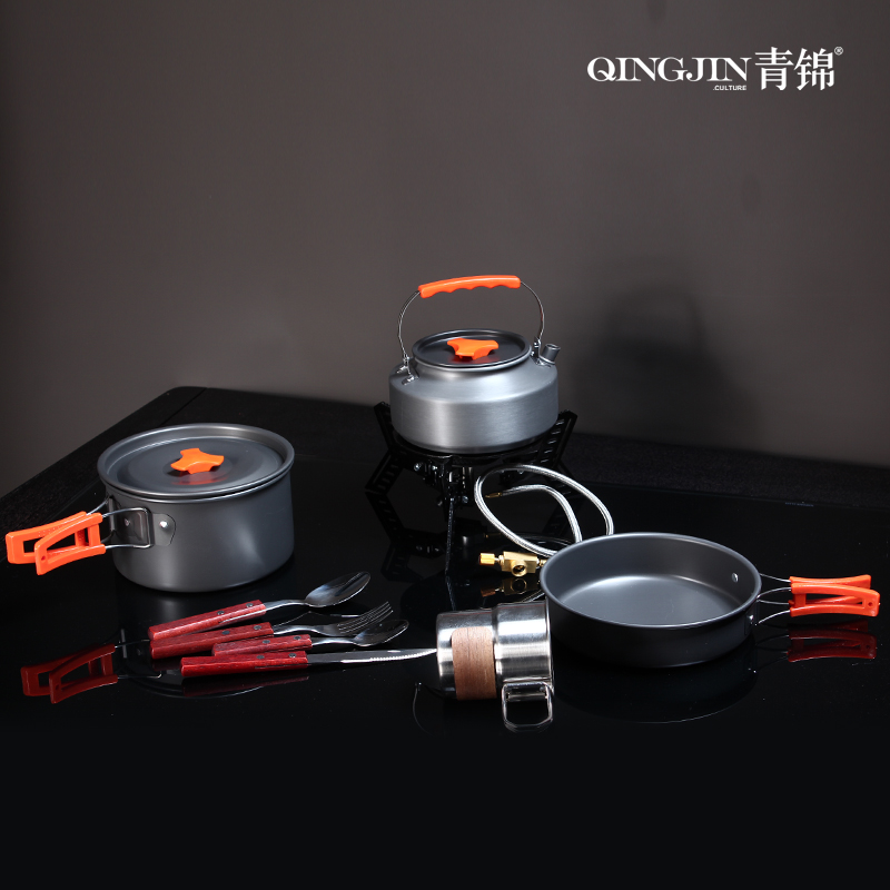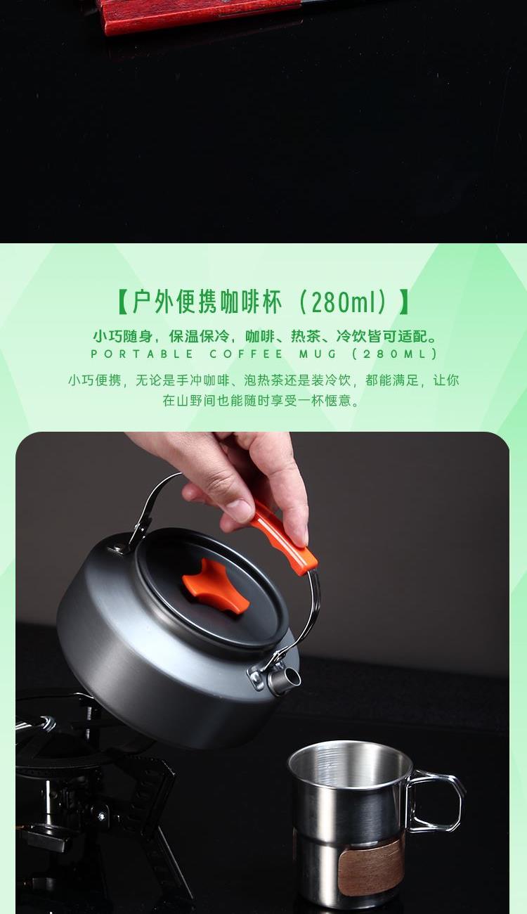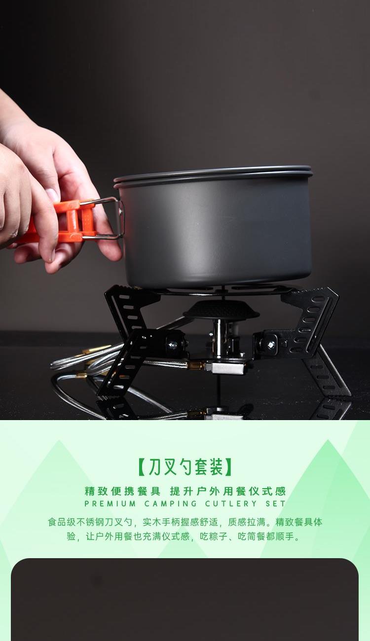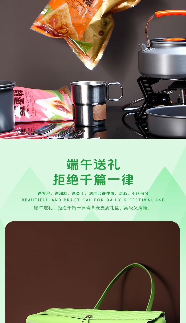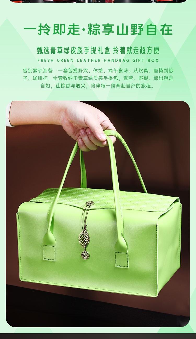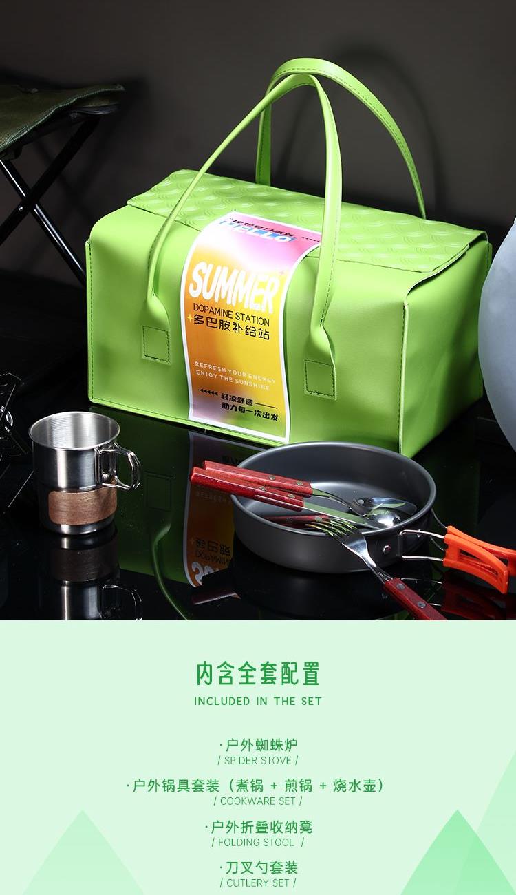 配置 户外蜘蛛炉*1户外煮锅煎锅烧水壶*1套 户外折叠收纳凳*1 刀叉勺套装*1 五芳斋粽x4只(蜜枣粽*2-鲜肉粽*2) (备注:如需不需粽子可替换颈枕) 户外便携咖啡杯x1容量280ml 说明书*1 青草绿皮质手提包*1 材质 户外餐具:铝 1 蜘蛛炉:304钢 皮革 尺寸 手提包:340*200*165mm