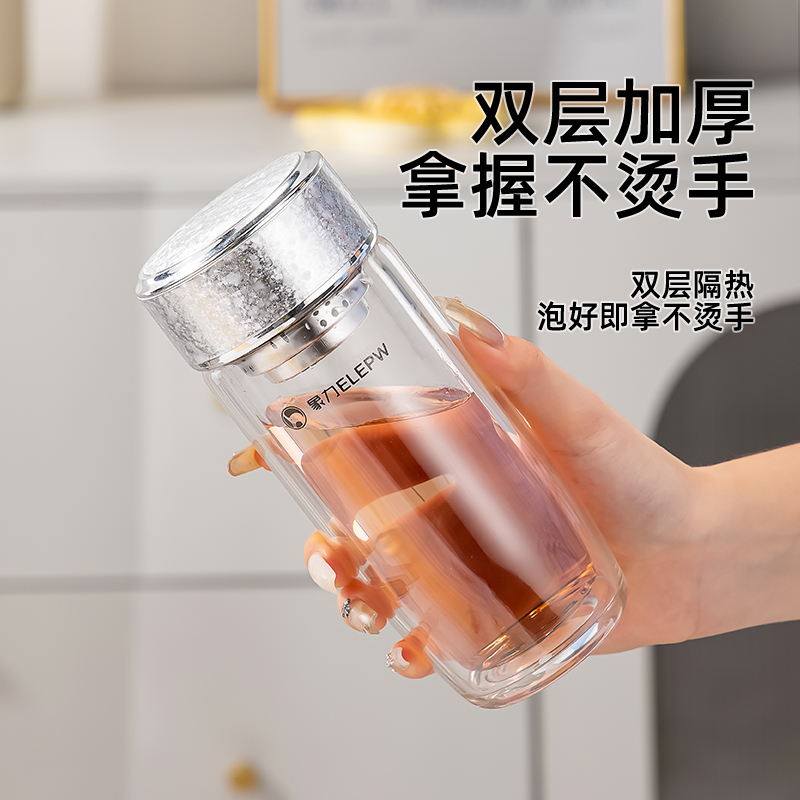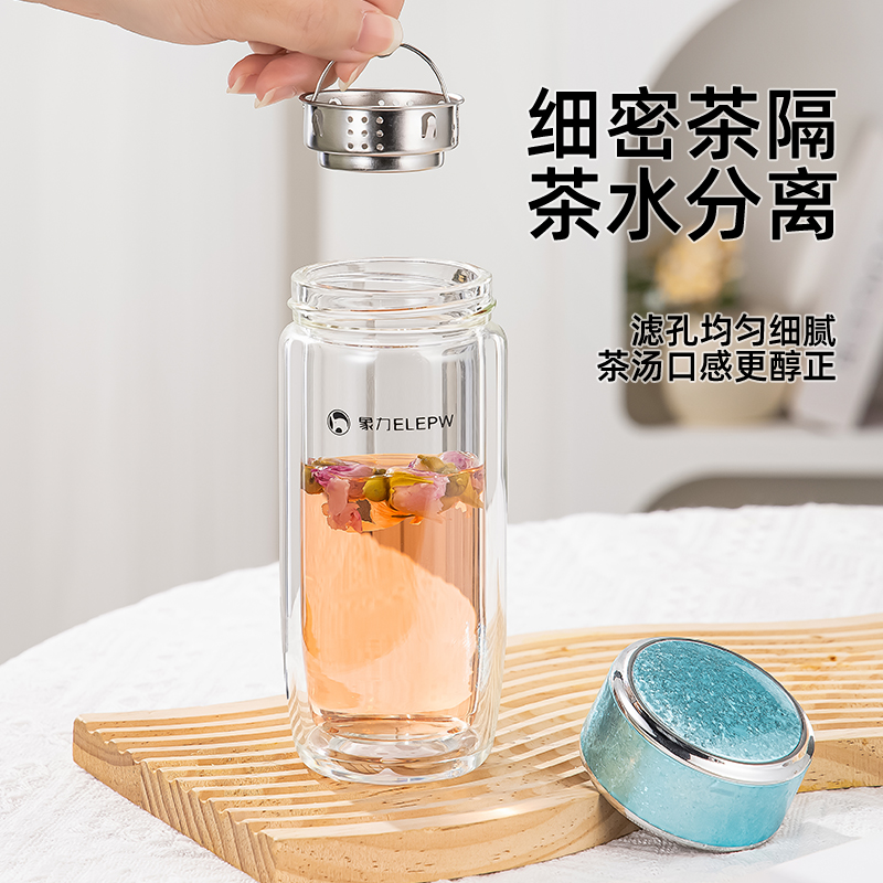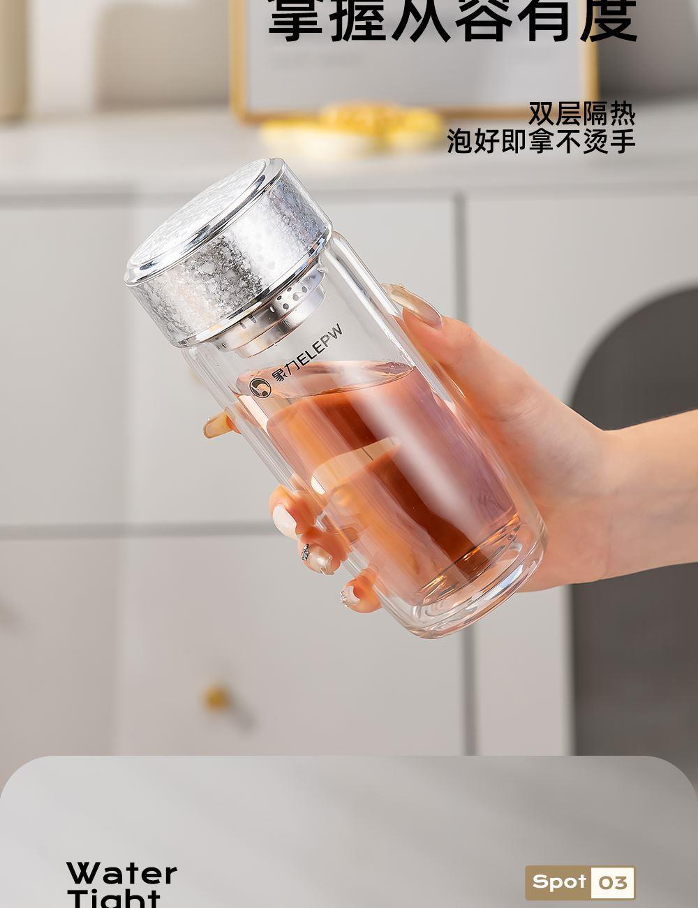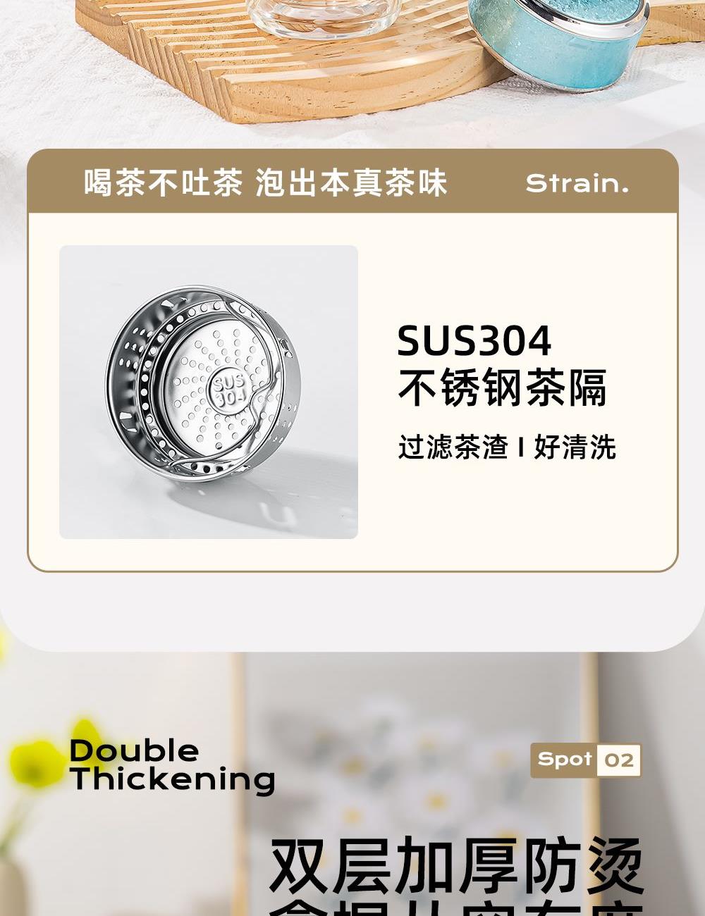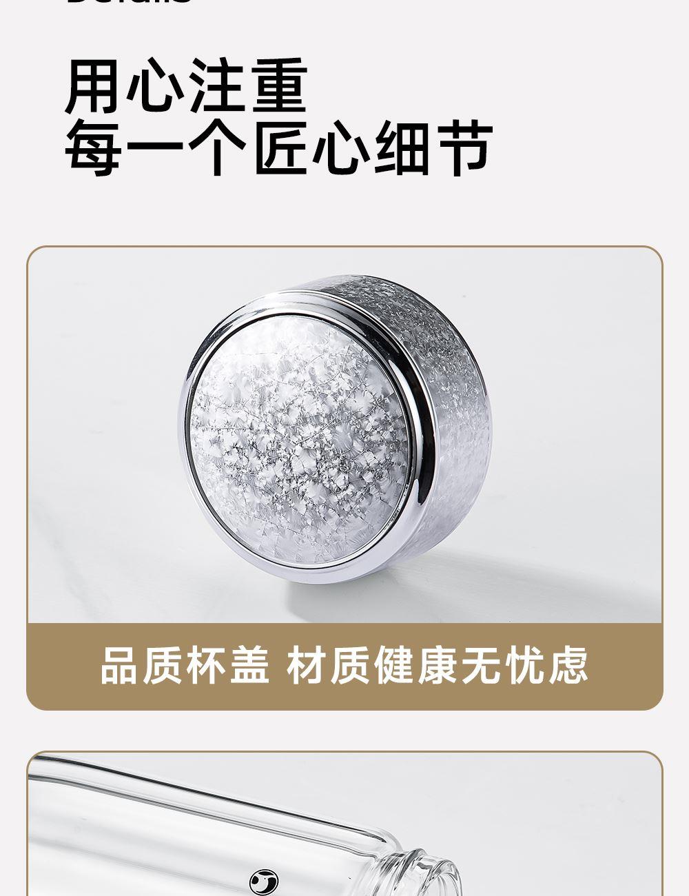 杯盖采用304不锈钢内芯。 杯体采用双层高硼硅玻璃,杯底手工加厚烧制一体成型