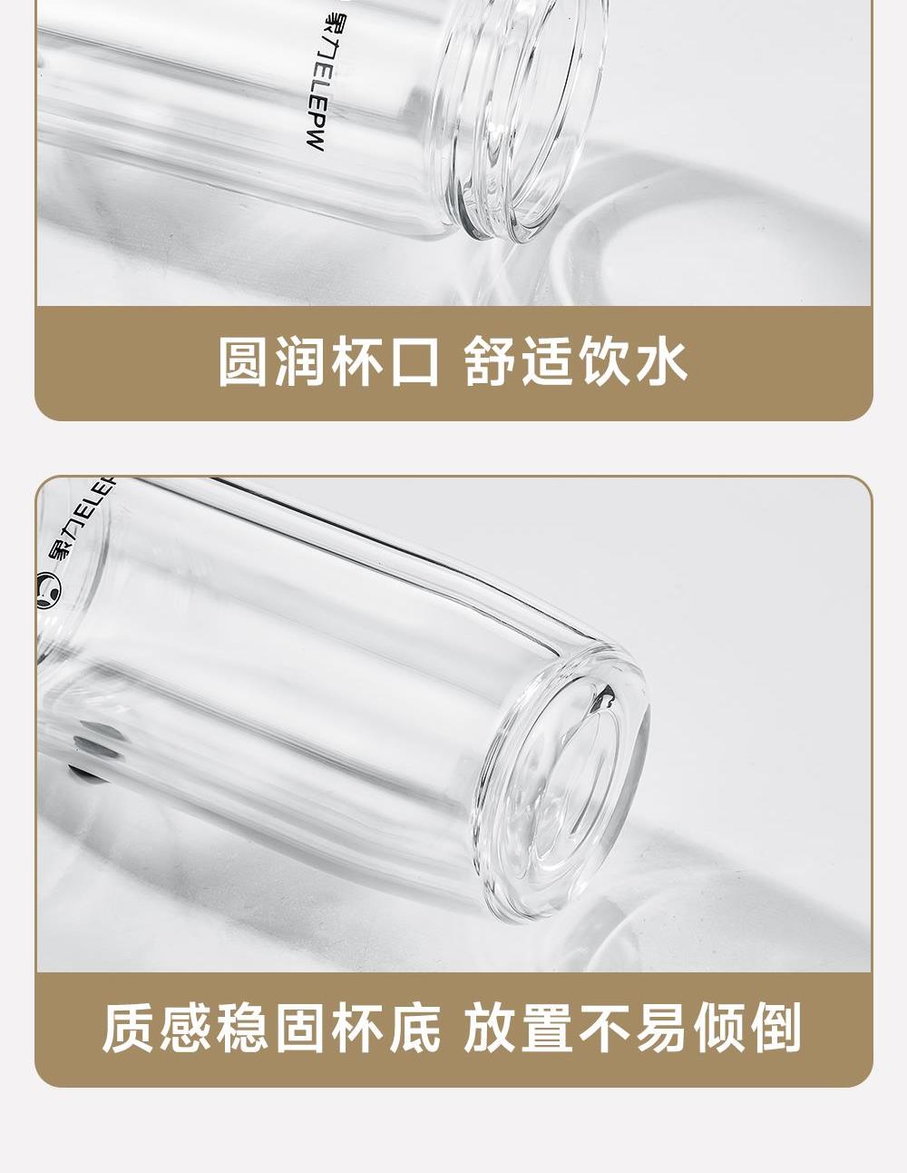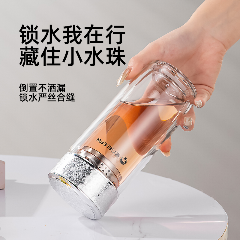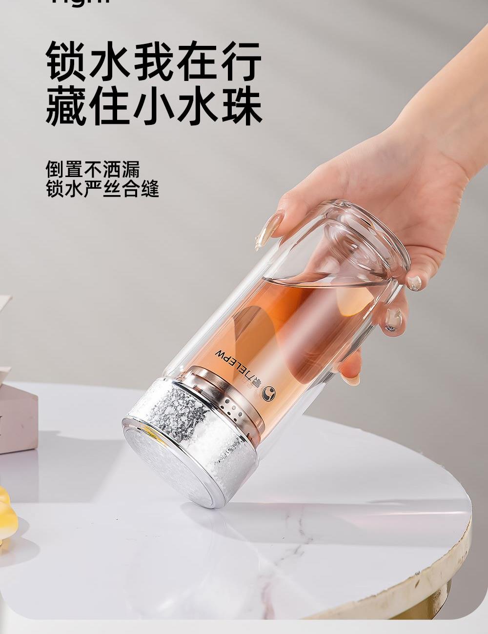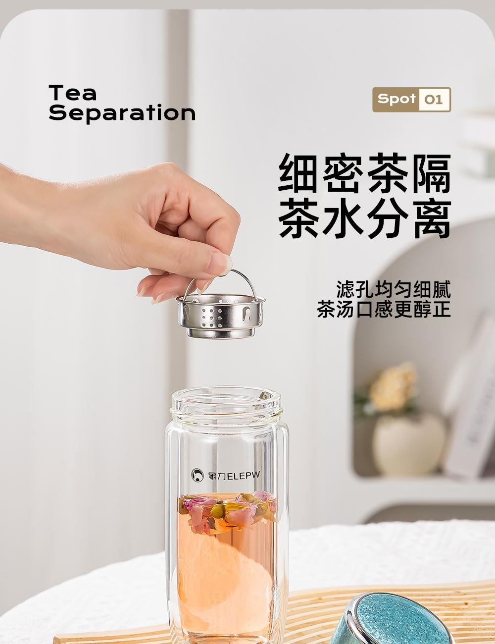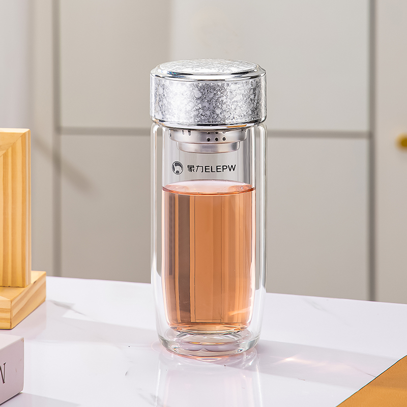 杯盖采用304不锈钢内芯。 杯体采用双层高硼硅玻璃,杯底手工加厚烧制一体成型