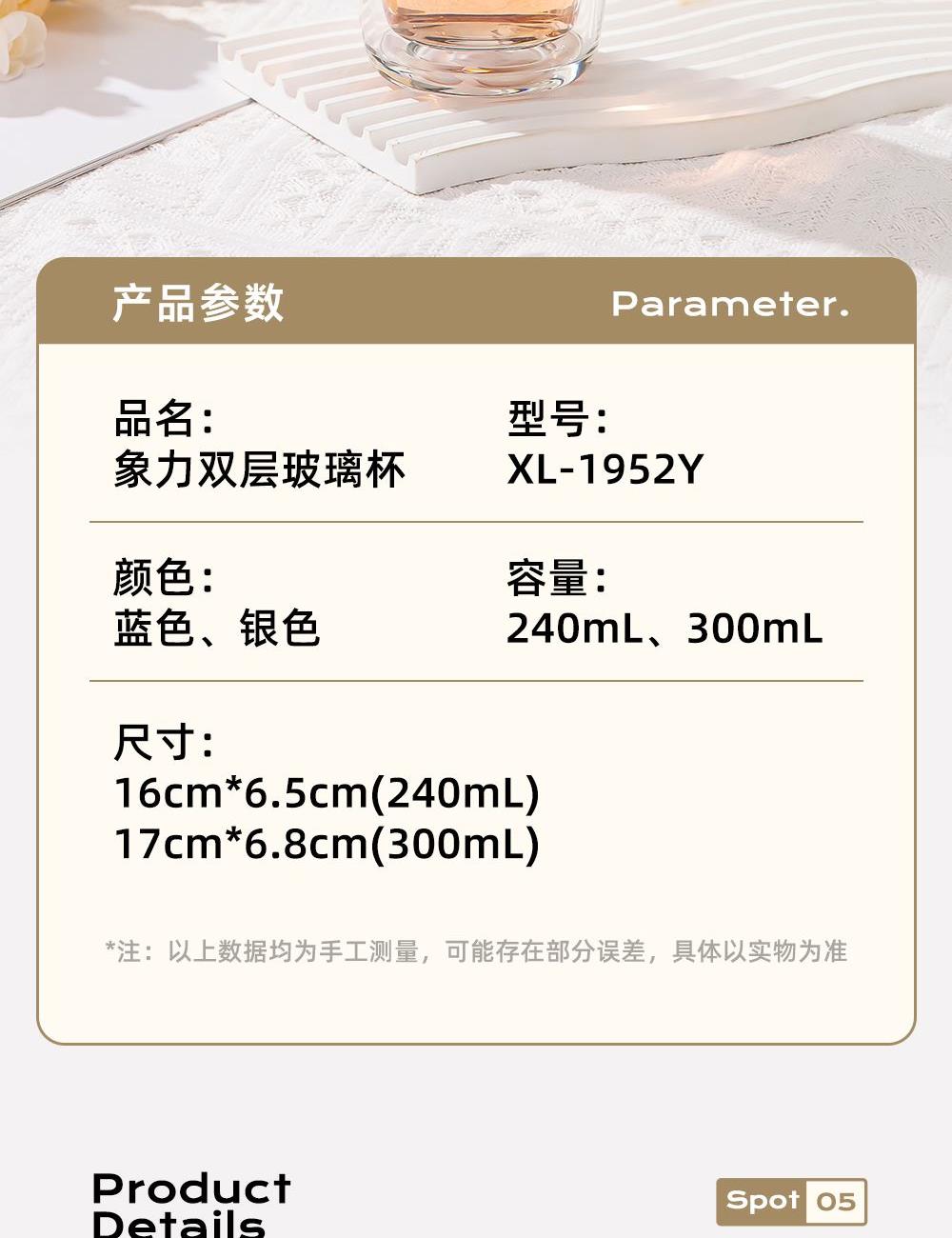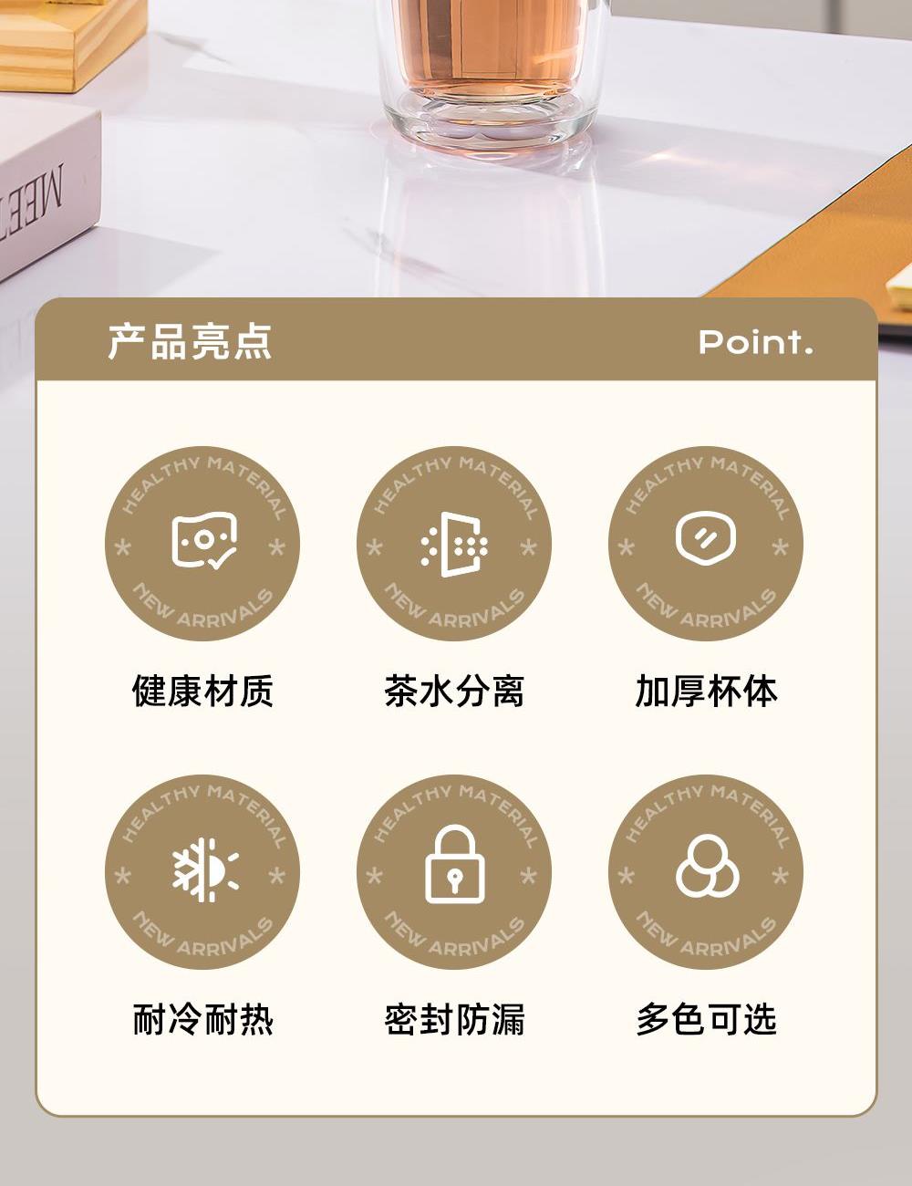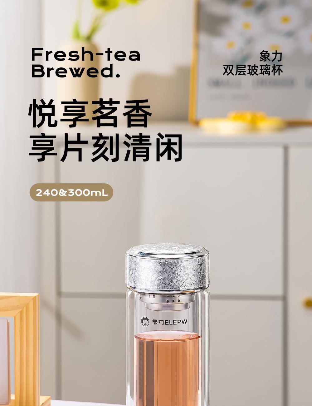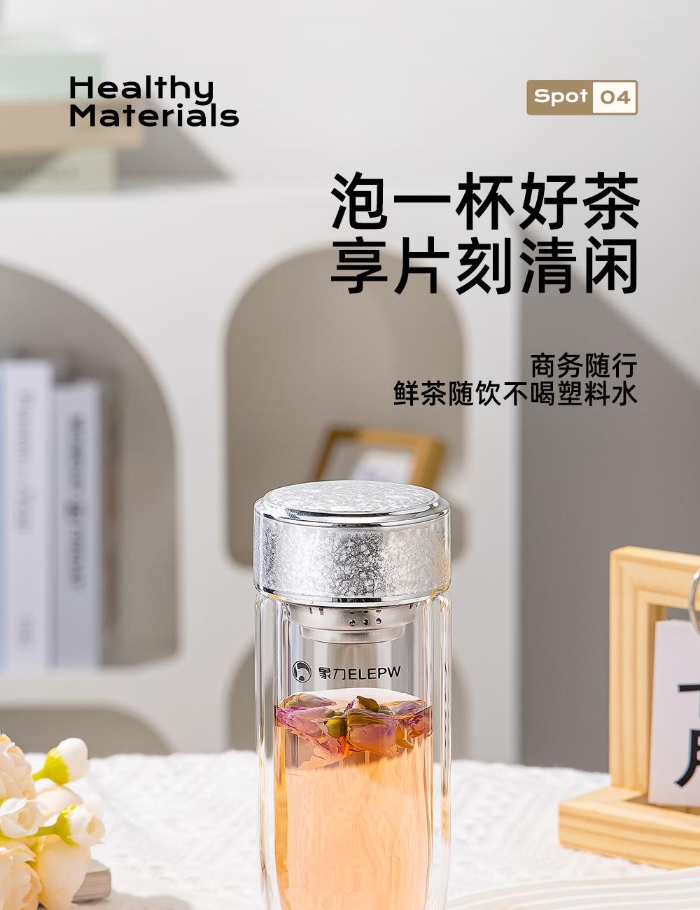 杯盖采用304不锈钢内芯。 杯体采用双层高硼硅玻璃,杯底手工加厚烧制一体成型