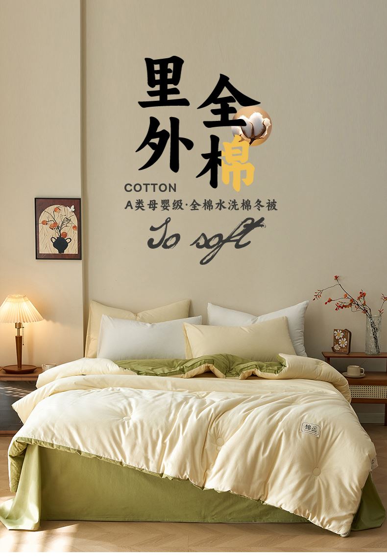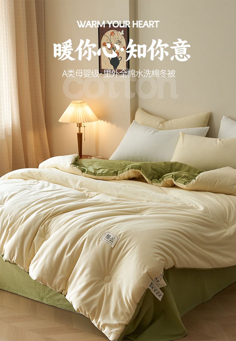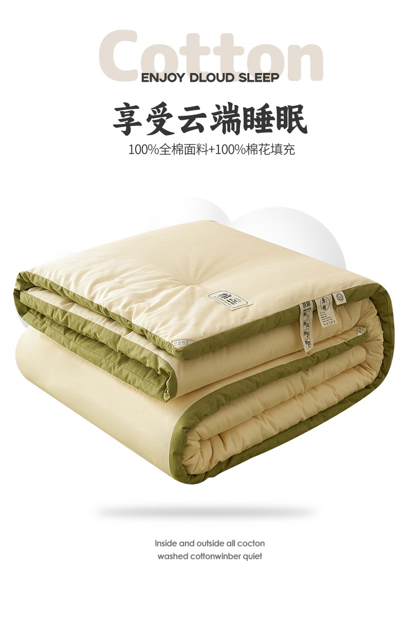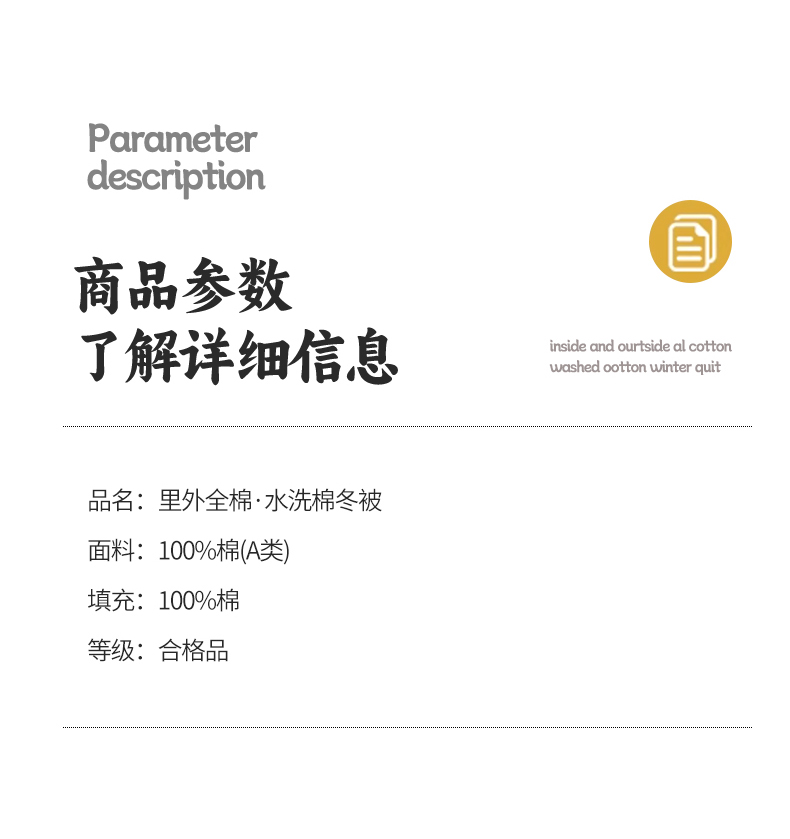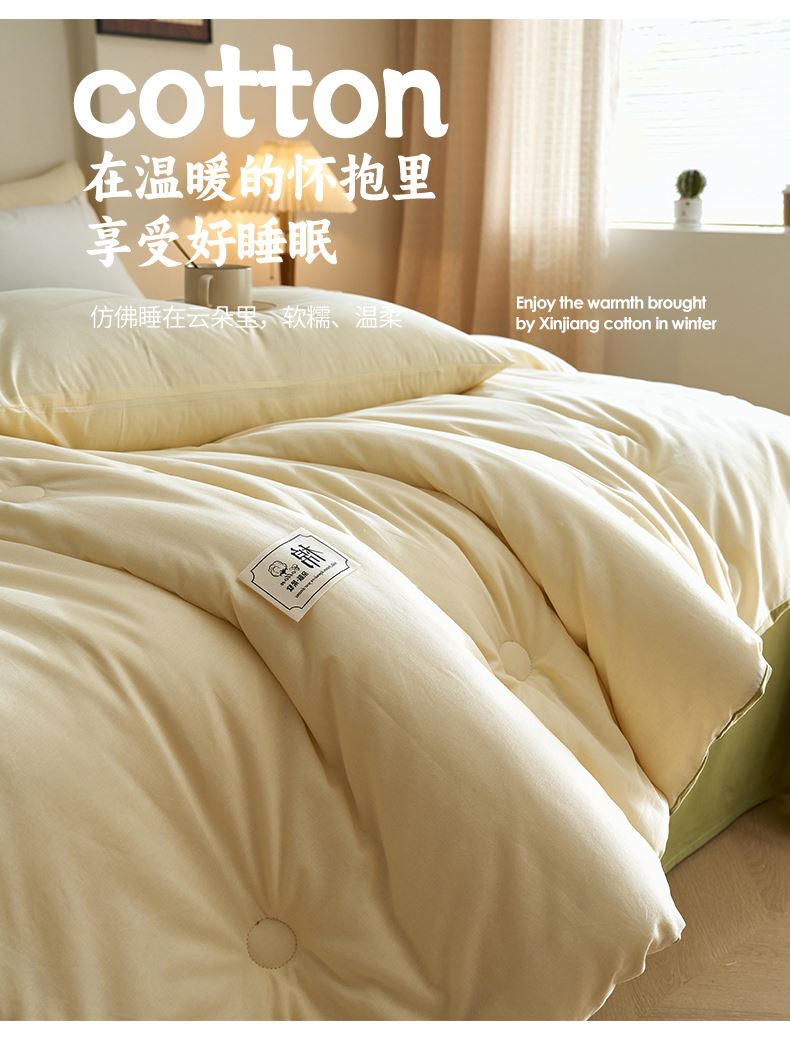面料:全棉 填充:新疆棉花 规格:200cm*230cm 总重量:3000g 包装:精美软包 里外都是全棉的棉花冬被,吸湿透气手感暖糯,细腻柔软,填充选用优质新疆棉花。高标准,无刺激,适合敏感肌肤。