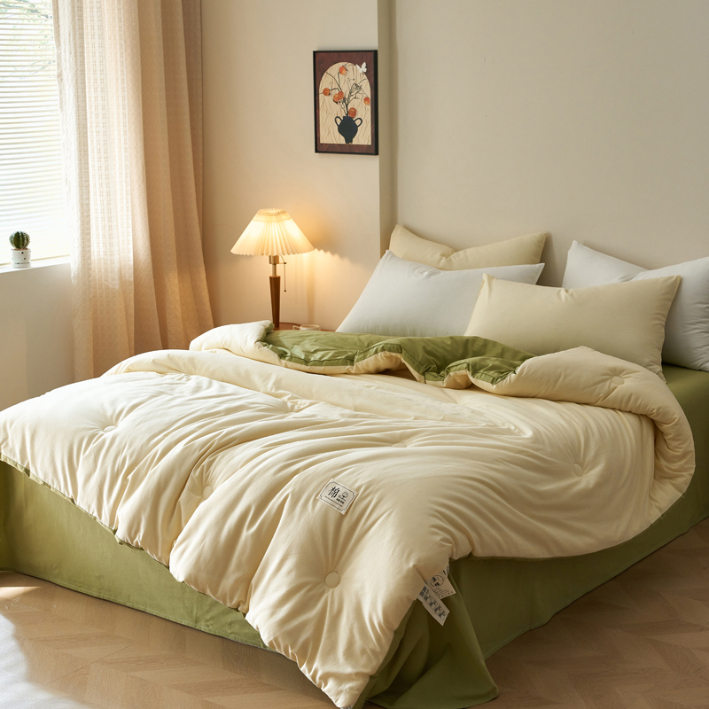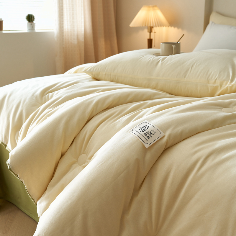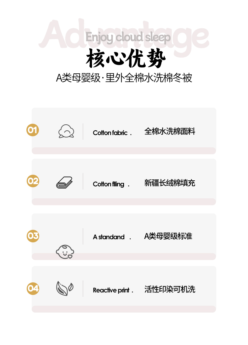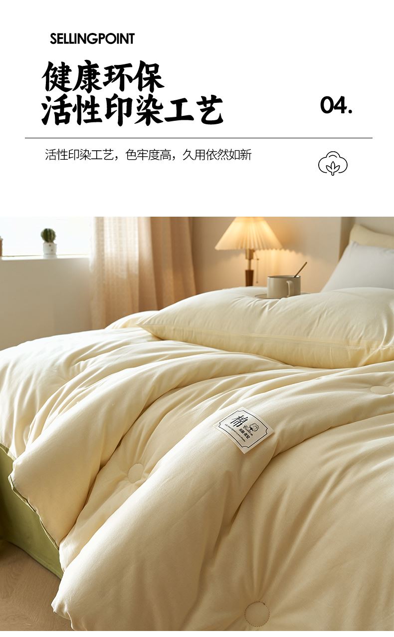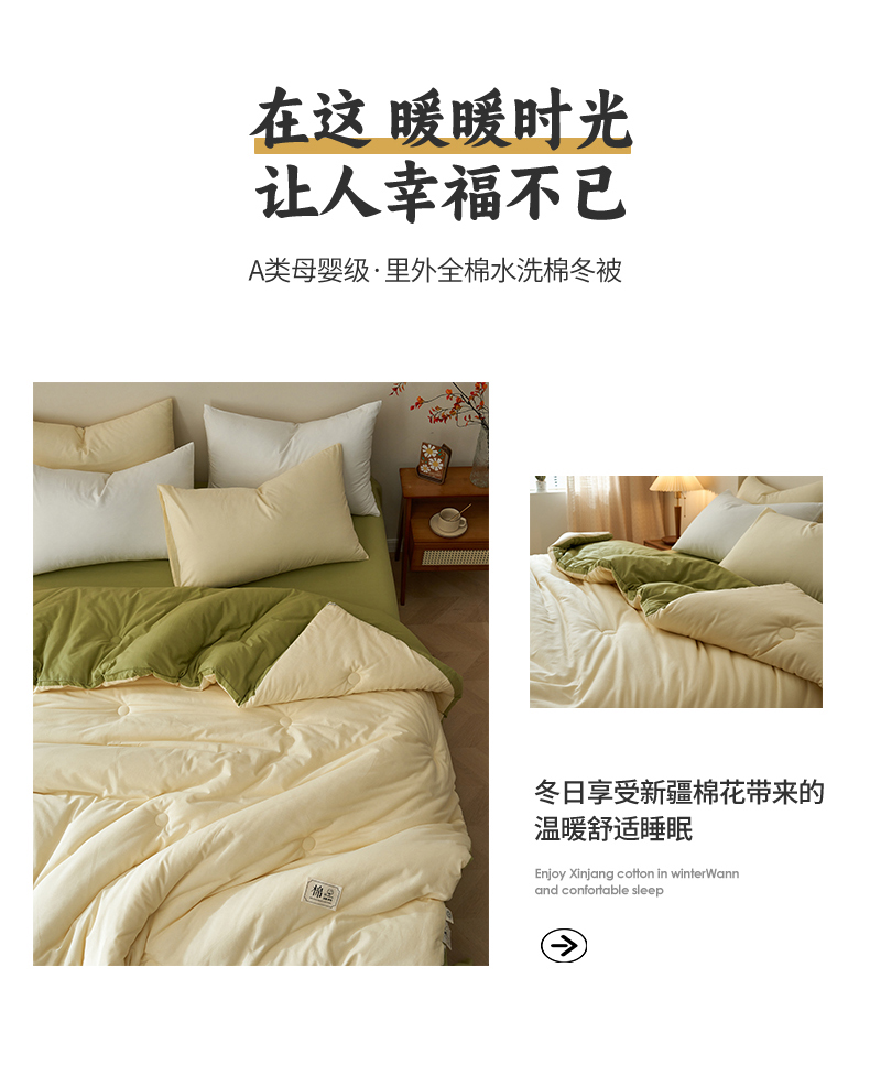 面料:全棉 填充:新疆棉花 规格:200cm*230cm 总重量:3000g 包装:精美软包 里外都是全棉的棉花冬被,吸湿透气手感暖糯,细腻柔软,填充选用优质新疆棉花。高标准,无刺激,适合敏感肌肤。