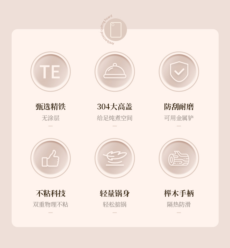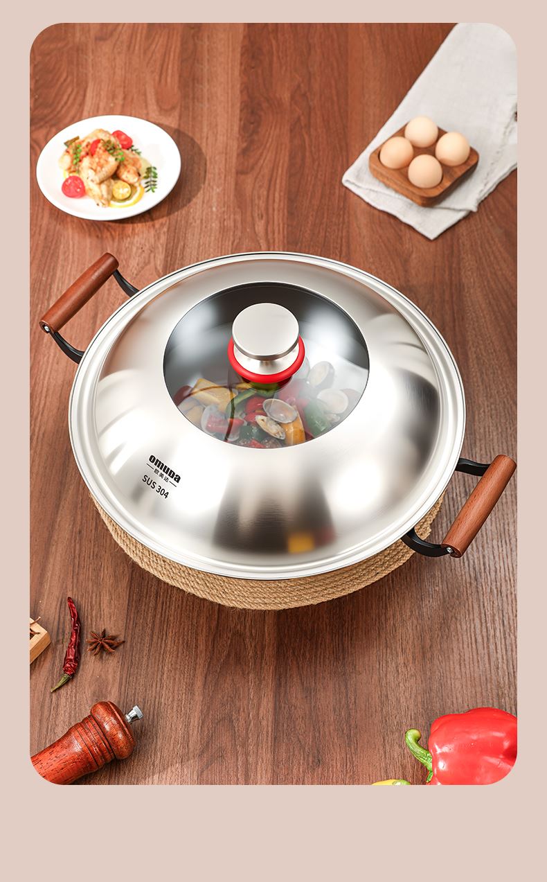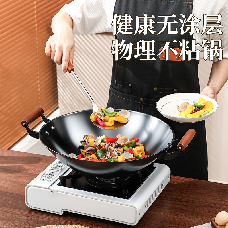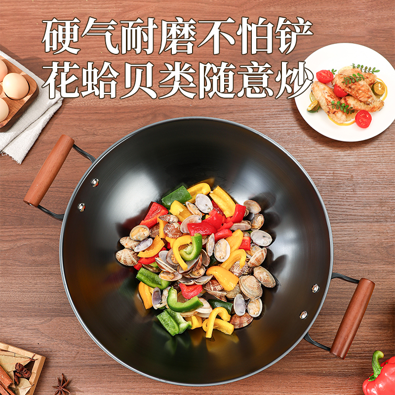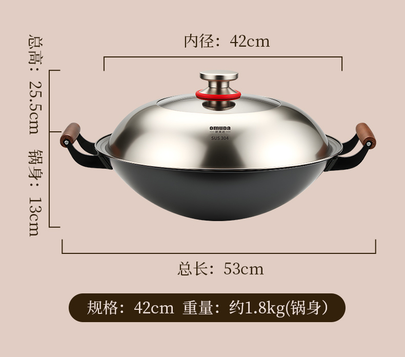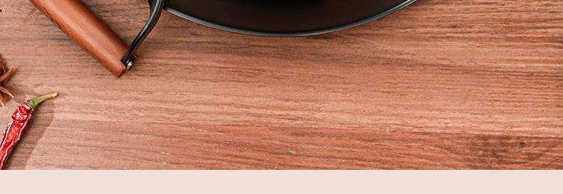 直径:42cm 净重:1.8kg 材质:精铁 ①采用高纯度精铁,纯度高达 99% 以上,品质好。 ②运用深层氮化工艺,具备耐磨耐腐蚀特性,长久使用不易生锈。 ③无涂层物理性持久不粘,健康安全有保障。 ④采用强力冷压技术,底厚壁薄,导热迅速。 ⑤双侧耳实木手柄,握持省力,隔热防烫。 ⑥拥有聚能螺纹外底,防滑且实用。