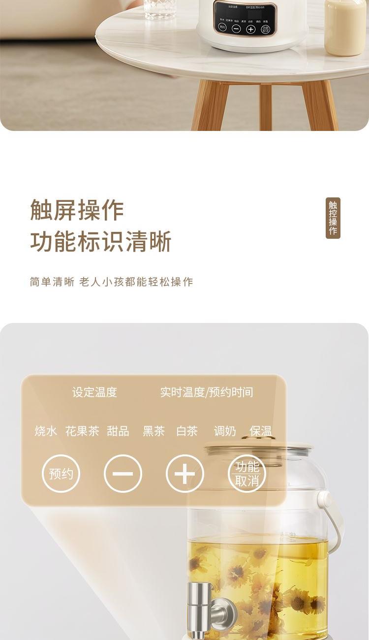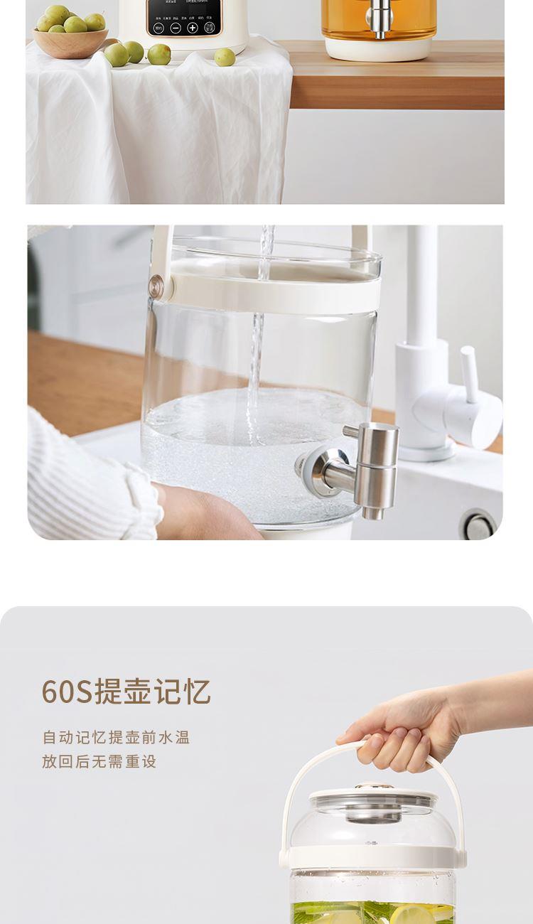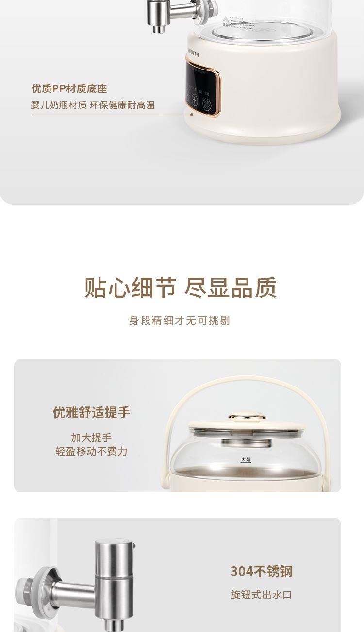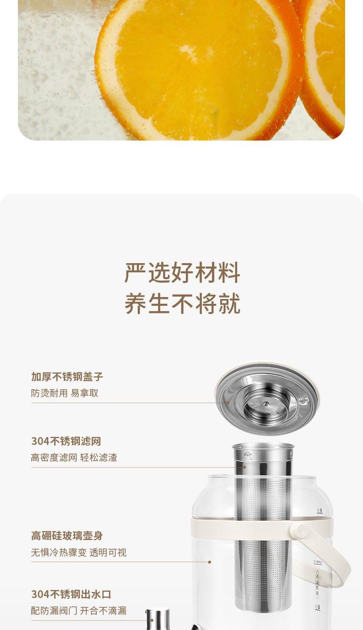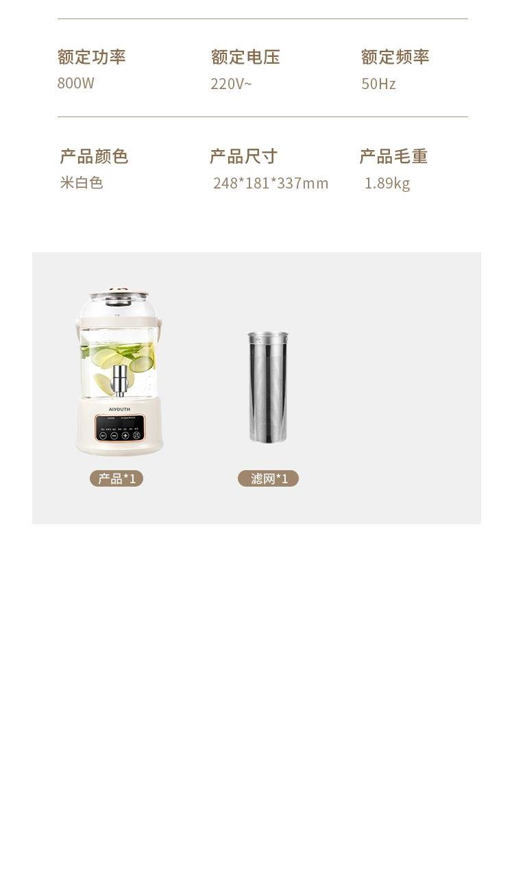 额定电压:220V~ 额定频率: 50HZ 额定功率:800W 额定容量:3.0L 产品毛重:1.89kg/台 产品颜色:米白 包装尺寸:419*250*266mm 产品尺寸:248*181*337mm 触屏操作,功能标识清晰。 养生壶一壶解锁7大生活仪式感 8段温度可调,12小时长效保温 304不锈钢便携式出水口,一拧出水,老人小孩都能轻松装水。 分体式设计,花篮式提手,清洗不湿底座 60秒提壶记忆,放回后无需重设 304不锈钢滤网,高密度滤网,轻松滤渣。