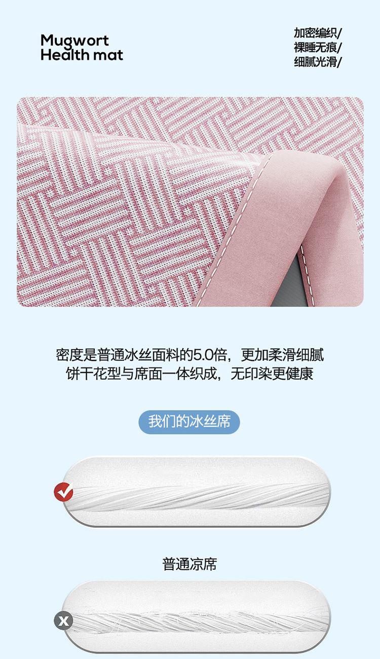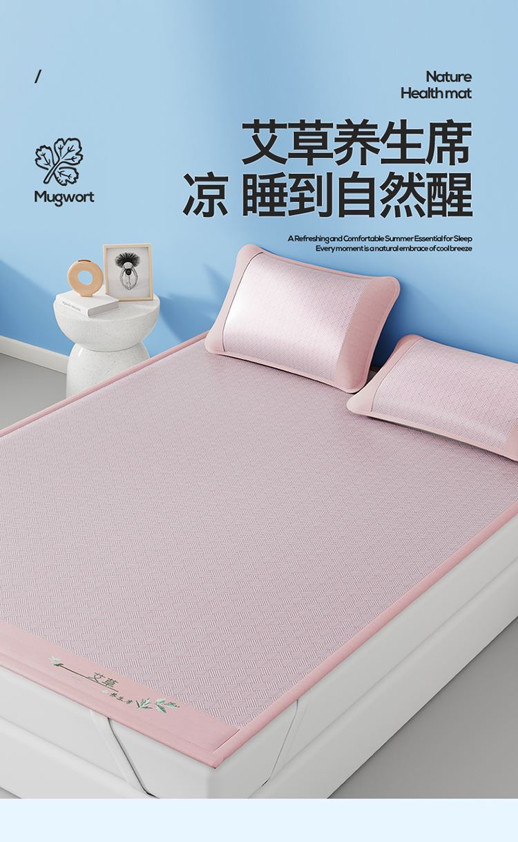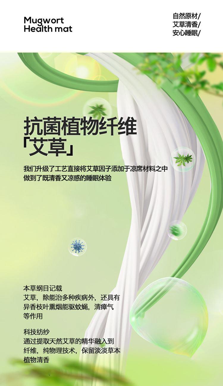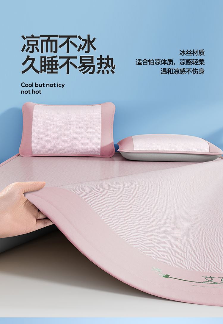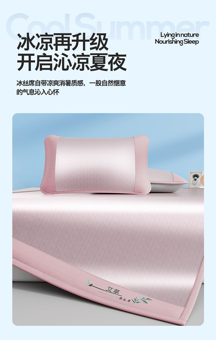 1:艾草养生席凉 睡到自然醒 2:冰凉再升级开启沁凉夏夜 的气息沁入心怀 冰丝席自带凉爽消暑质感,一股自然惬意 3:冰丝材质适合怕凉体质,凉感轻柔温和凉感不伤身 尺寸:180x200cm凉席+48*74cm*2枕套一对 包装:彩盒