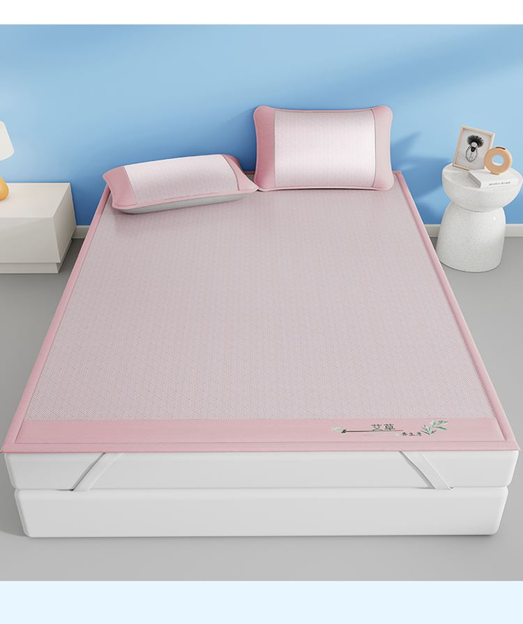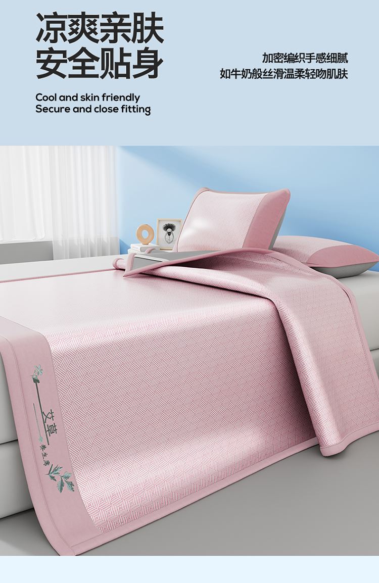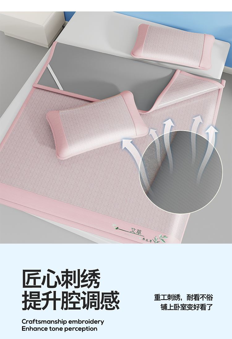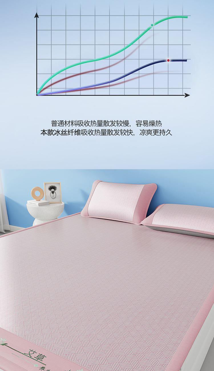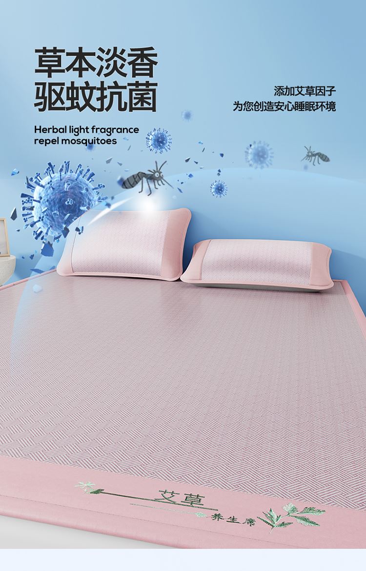 1:艾草养生席凉 睡到自然醒 2:冰凉再升级开启沁凉夏夜 的气息沁入心怀 冰丝席自带凉爽消暑质感,一股自然惬意 3:冰丝材质适合怕凉体质,凉感轻柔温和凉感不伤身 尺寸:180x200cm凉席+48*74cm*2枕套一对 包装:彩盒