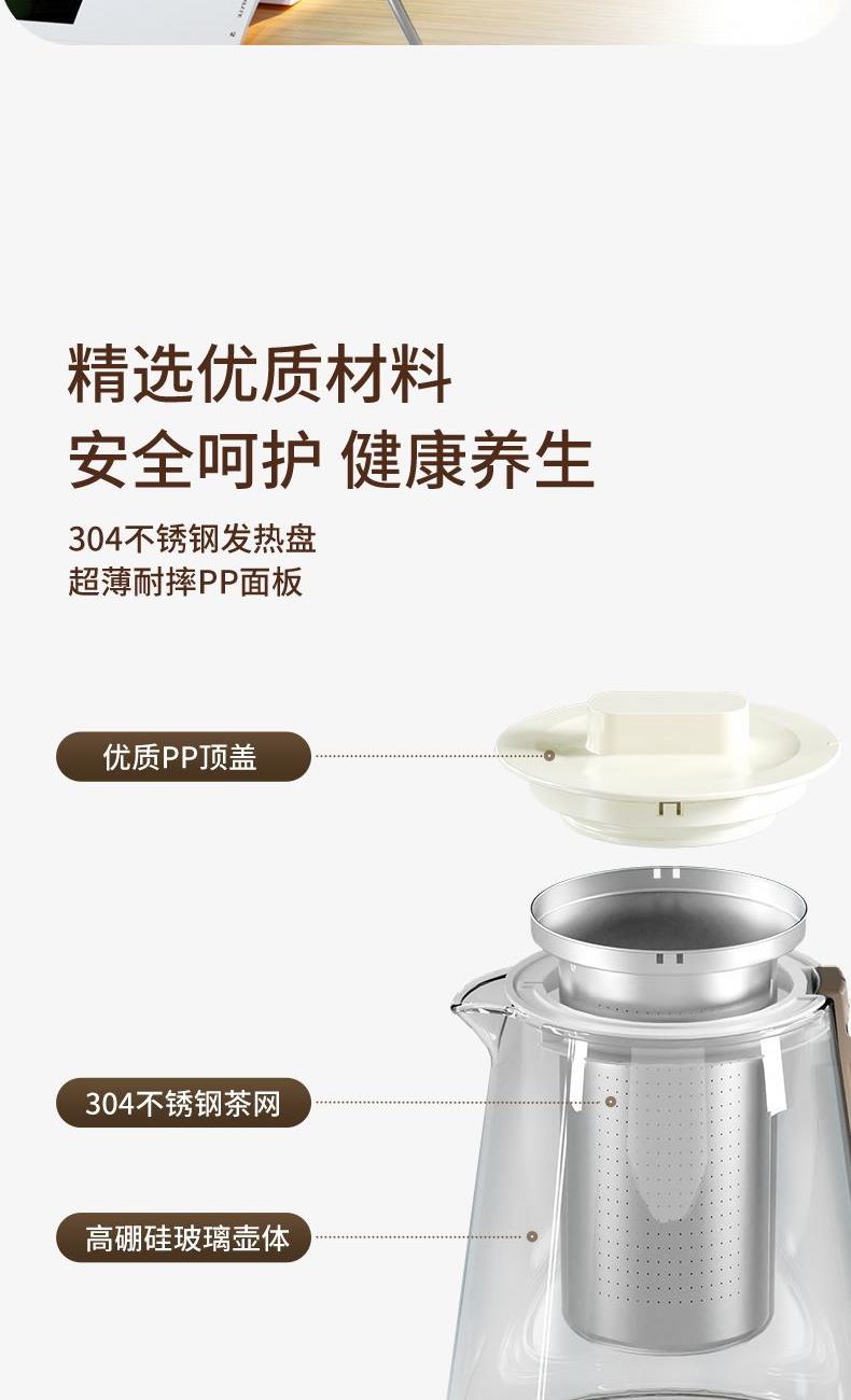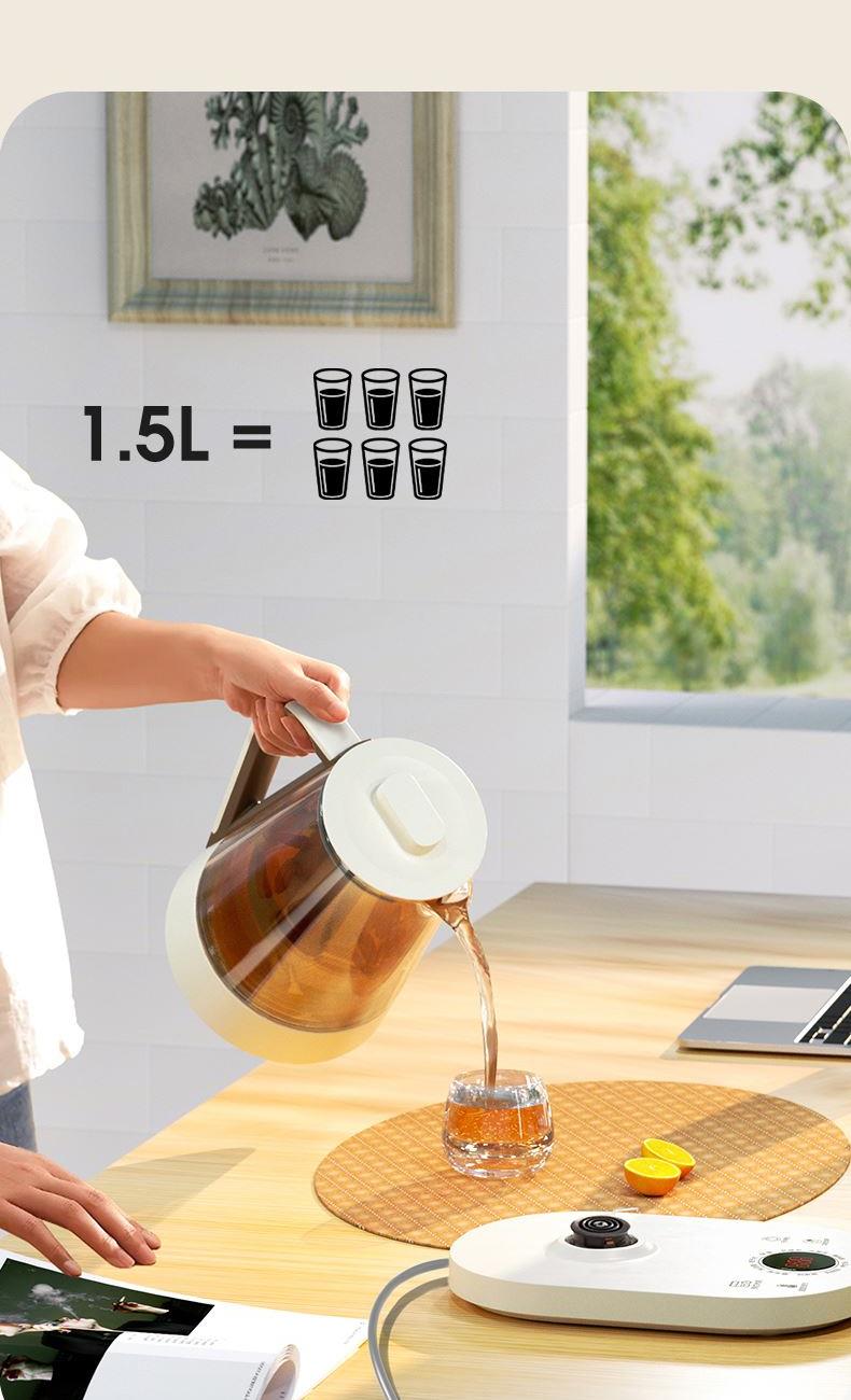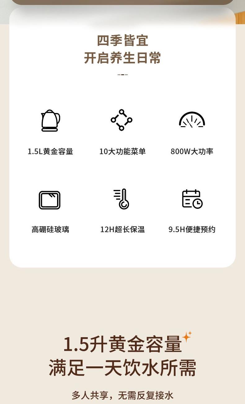 产品颜色:白色 产品材质:PP、高硼硅玻璃、304不锈钢 额定频率:50Hz 额定电压:220V~ 产品容量:1.5L 额定功率:800W 产品尺寸:238x200x249mm 产品净重:1KG 商品条形码:6971849440385 精选优质材料,304不锈钢发热盘,超薄耐摔PP面板。 10大功能菜单,开启润养好生活。 高硼硅玻璃壶身,无惧骤冷、骤热全天温暖相伴。 12H长效保温,保温也保冷。 9.5小时便捷预约,美味不等待。
