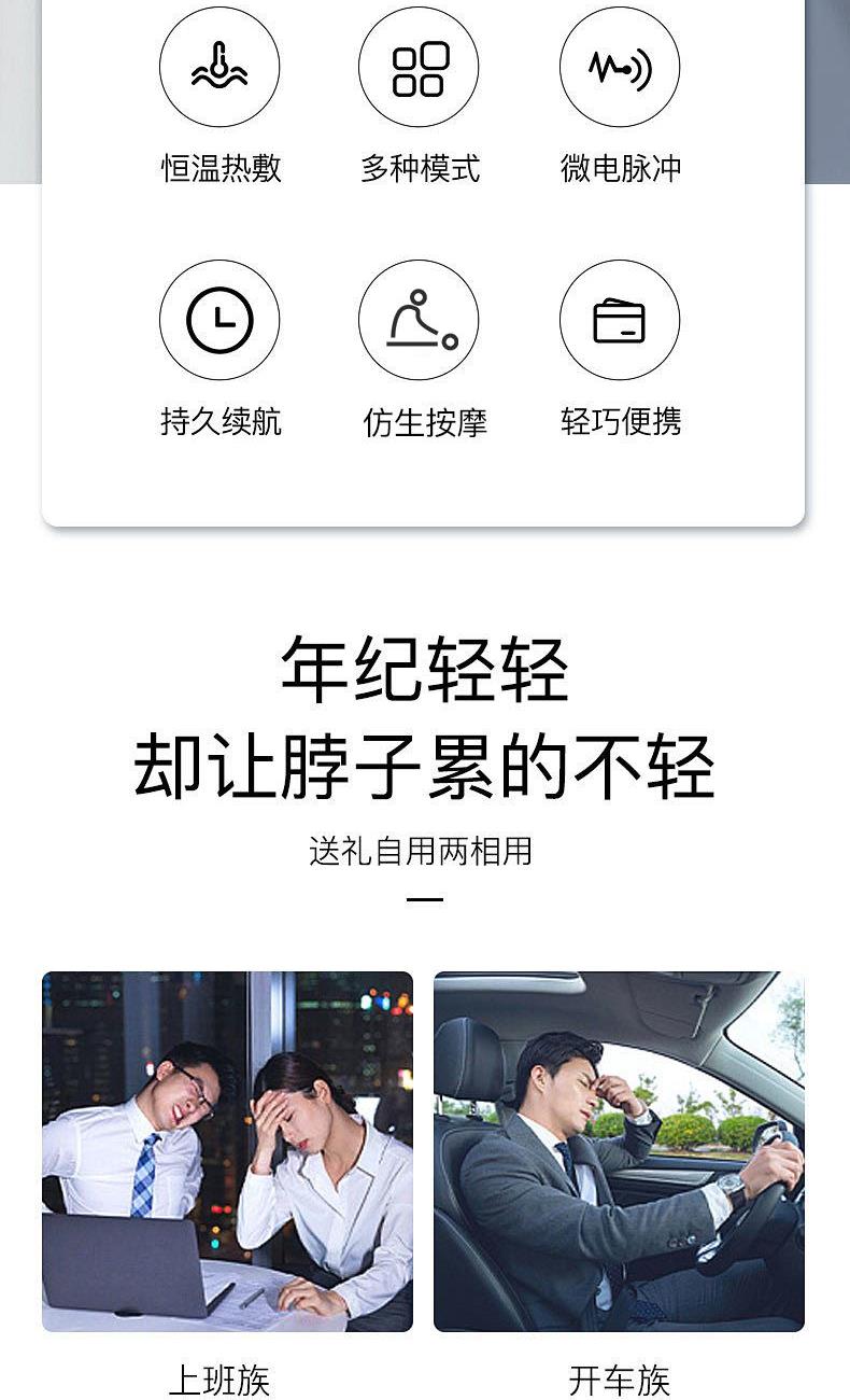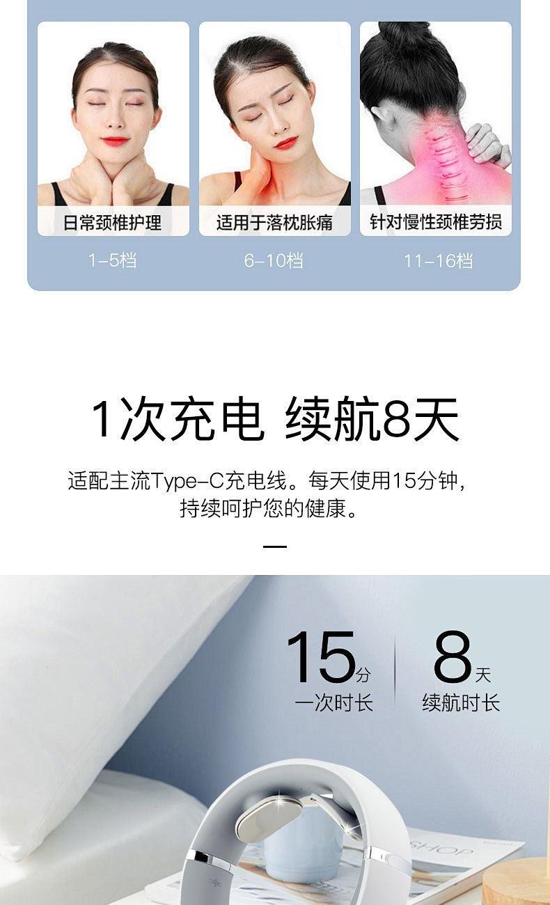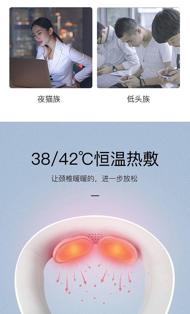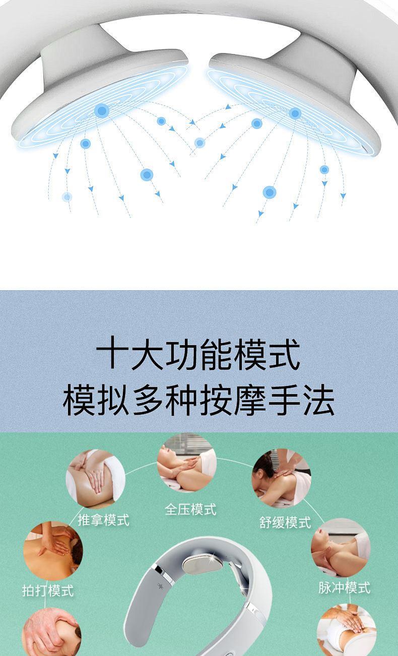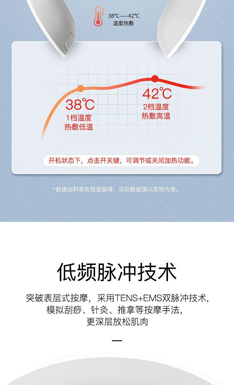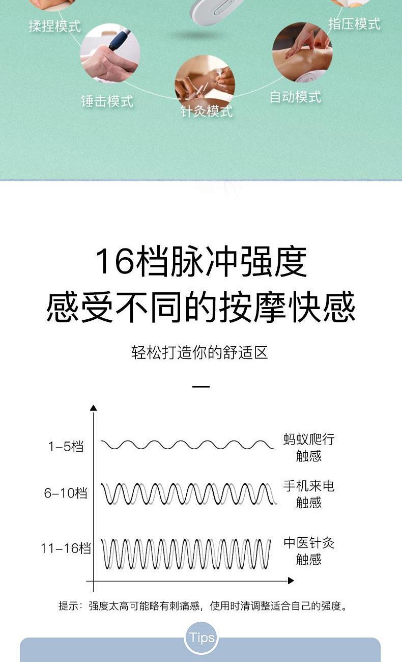 1.16 档力度自由掌控:从温柔轻抚的唤醒模式,到强劲有力的深度按摩,16 档细腻力度随心调节,无论是敏感肌的轻柔呵护,还是运动后的深度放松,都能匹配你的需求,找到适合自己的舒适体验。​ 2.十大模式焕活身心:涵盖揉捏、推拿、捶打、叩击等十大专业按摩模式,一键切换,从缓解肩颈僵硬到舒缓腰背酸痛,如同拥有私人按摩师,满足你多样化的放松需求。​ 3.恒温热敷深层解压:42℃恒温热敷持续渗透,如同敷上温热的毛巾,快速驱散肌肉寒意与酸痛,搭配按摩同步进行,双倍温暖加倍舒适,让身心放松。​ 4.微电脉冲科技赋能:创新微电脉冲技术,刺激肌肉深层,促进血液循环,加速新陈代谢,有效缓解肌肉疲劳,让疲惫的身体快速恢复活力。​ 6.仿真手法如临现场:通过智能程序模拟专业按摩师的娴熟手法,从穴位按压到肌肉揉捏,每一下都到位,带来真实的按摩触感,足不出户也能享受专业级按摩体验。​