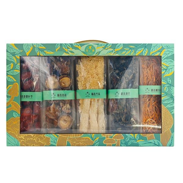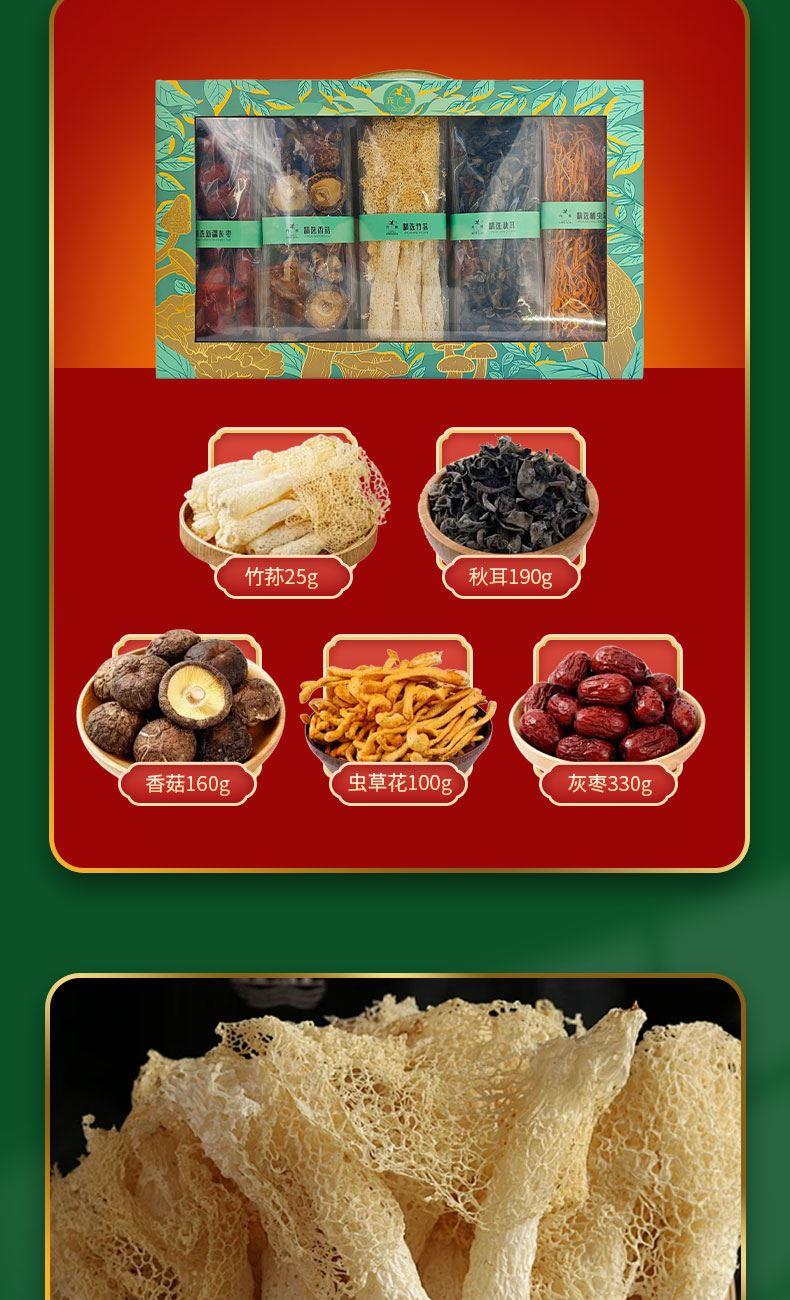 精选竹荪25g 产地: 福建省宁德市 精选秋耳190g 产地:黑龙江省牡丹江市 精选香菇160g 产地:河南省南阳市 精选虫草花100g 产地:福建省宁德市 精选新疆灰枣430g 产地:新疆